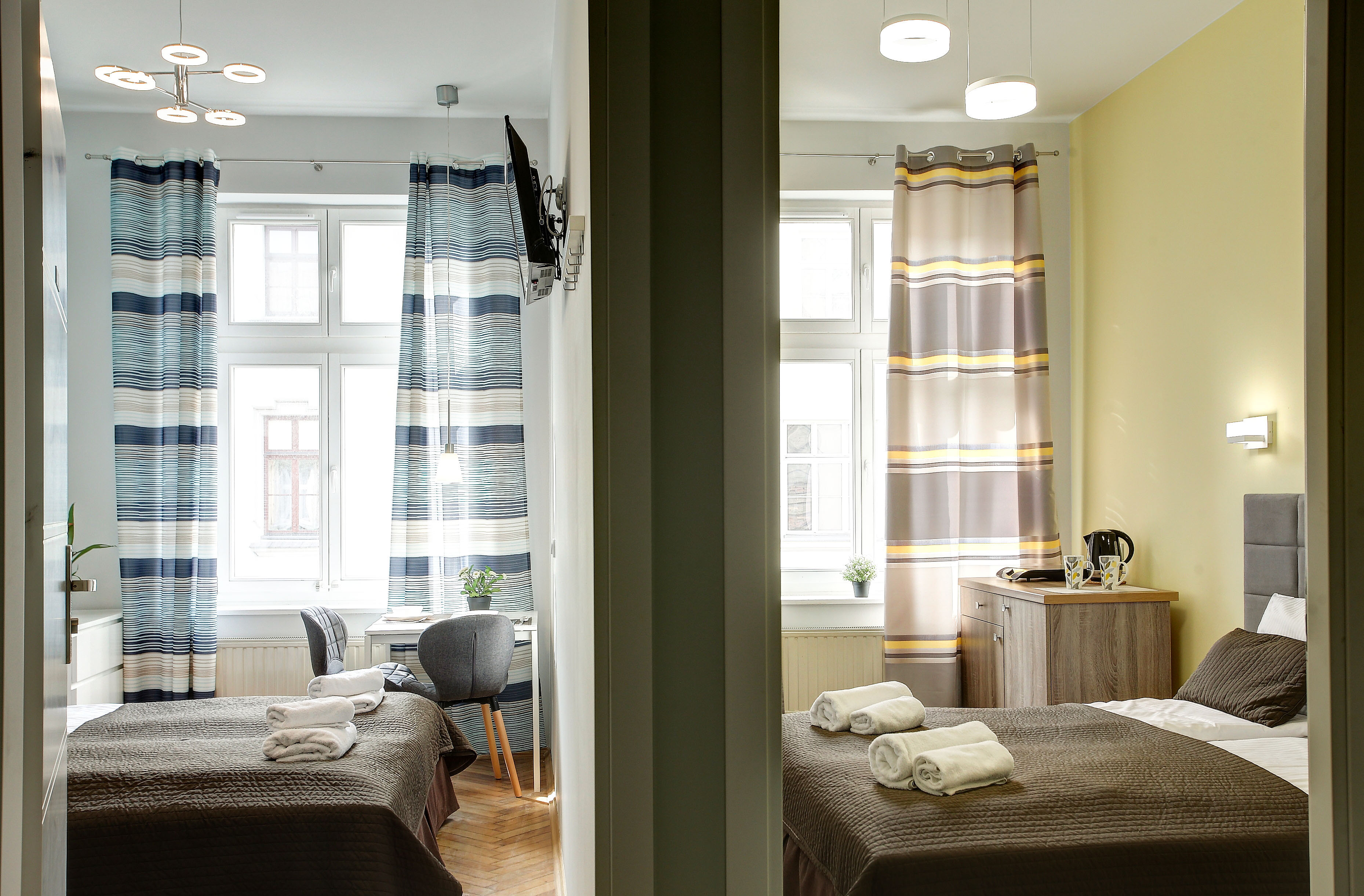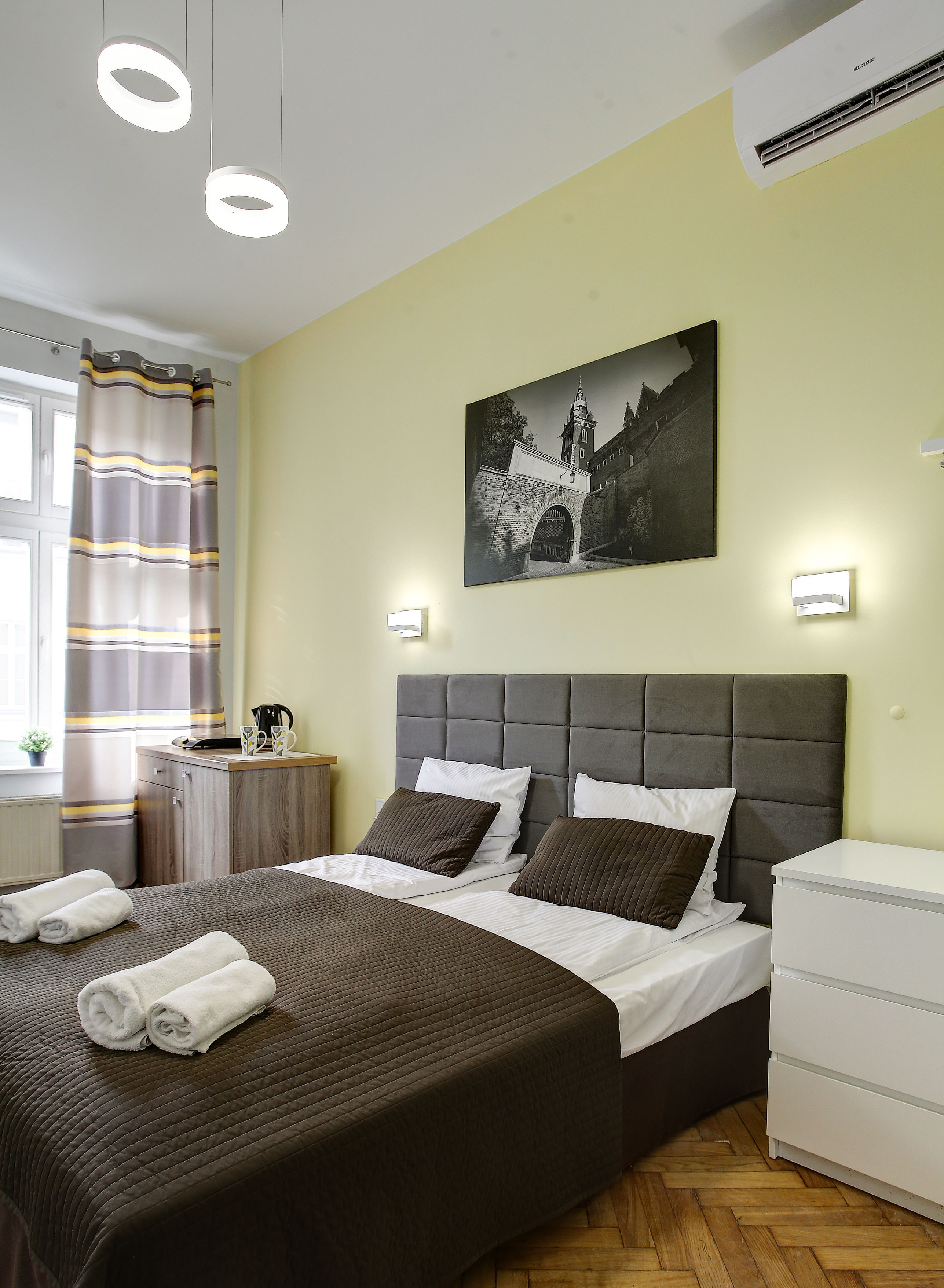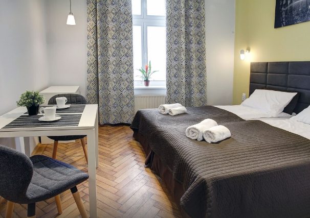 Studio apartment with air conditioning 15m2 for two people. The room is equipped with two single beds, joined into one large one that can be separated, a table with chairs, a chest of drawers, a mini kitchenette with a fridge, a small induction hob, kettle and dishes. The apartment has a private bathroom with shower, toilet and hairdryer. Guests have at their disposal free Wi-Fi, a TV set and a set of bed linen, towels and soap. Iron and ironing board available in the corridor. Apartment on the 2nd floor with a view of ul. Starowiślna.