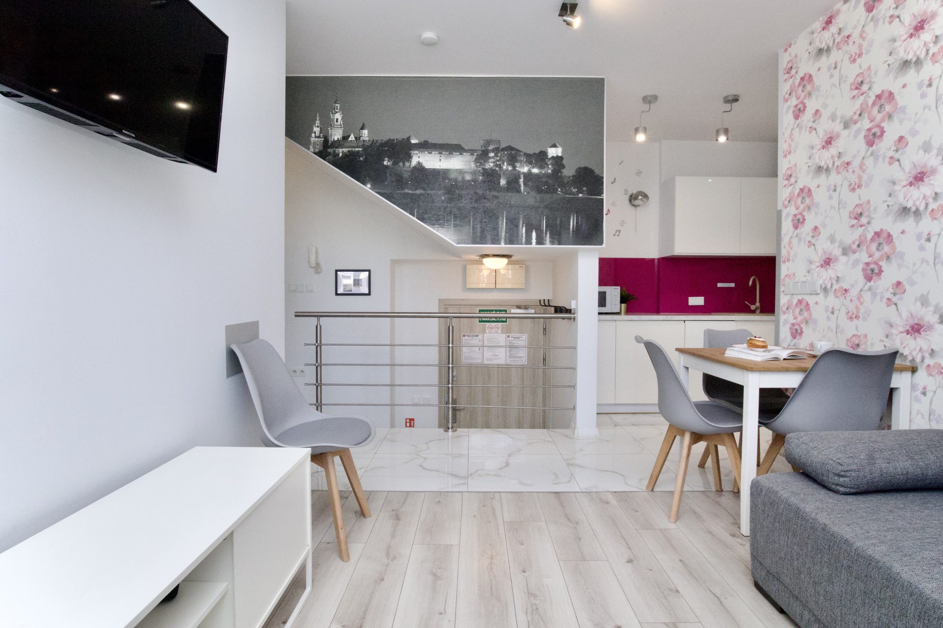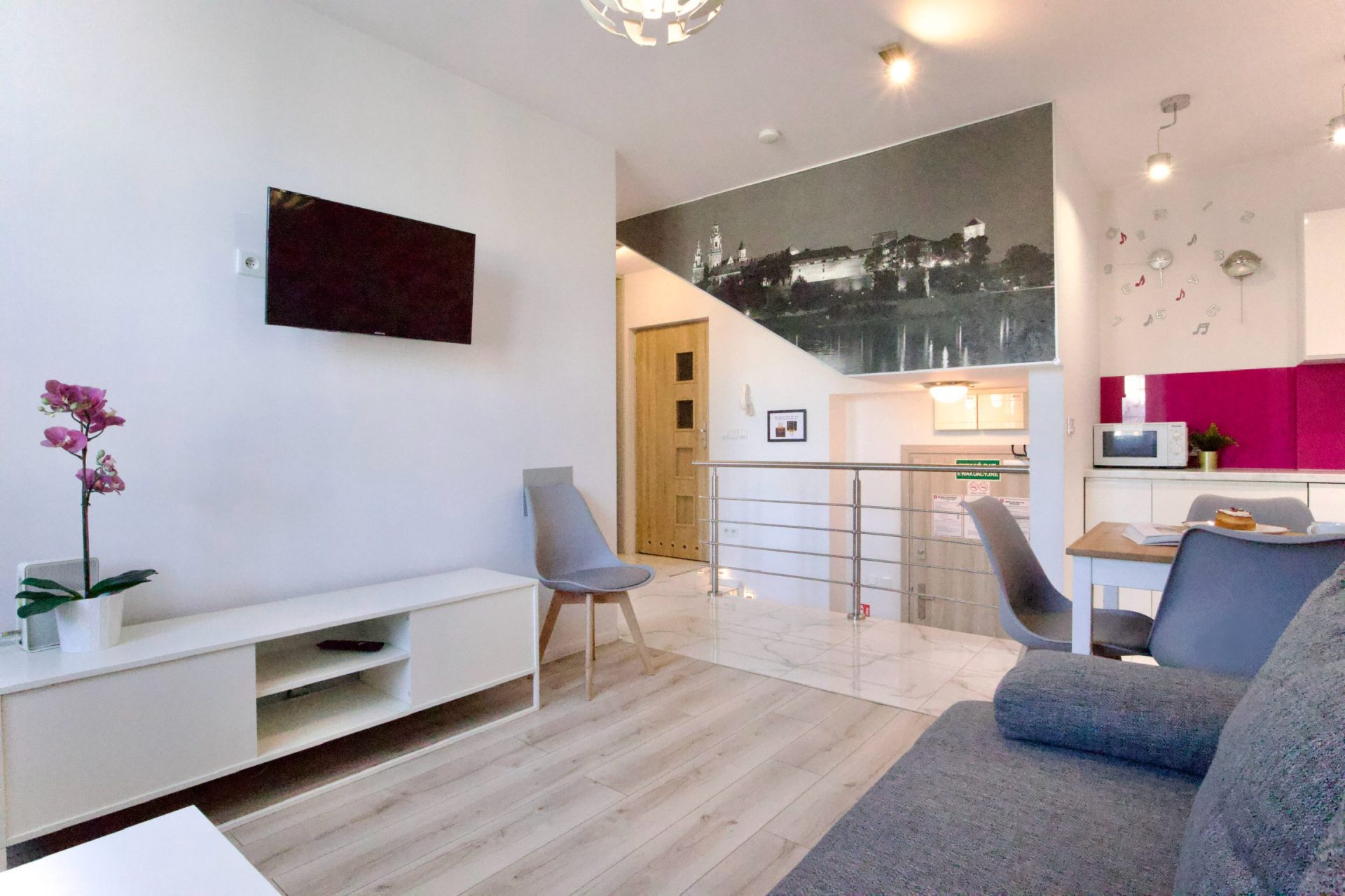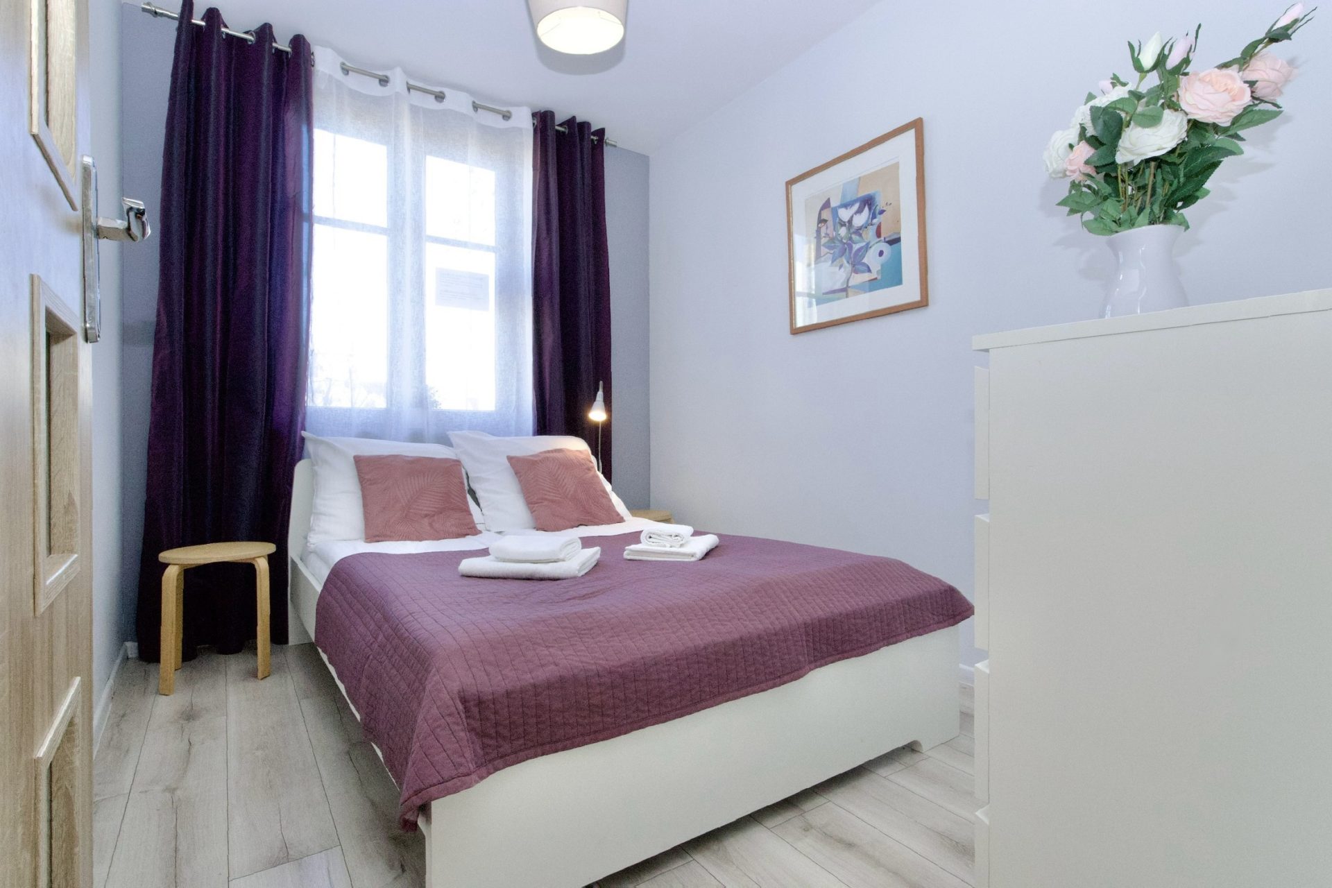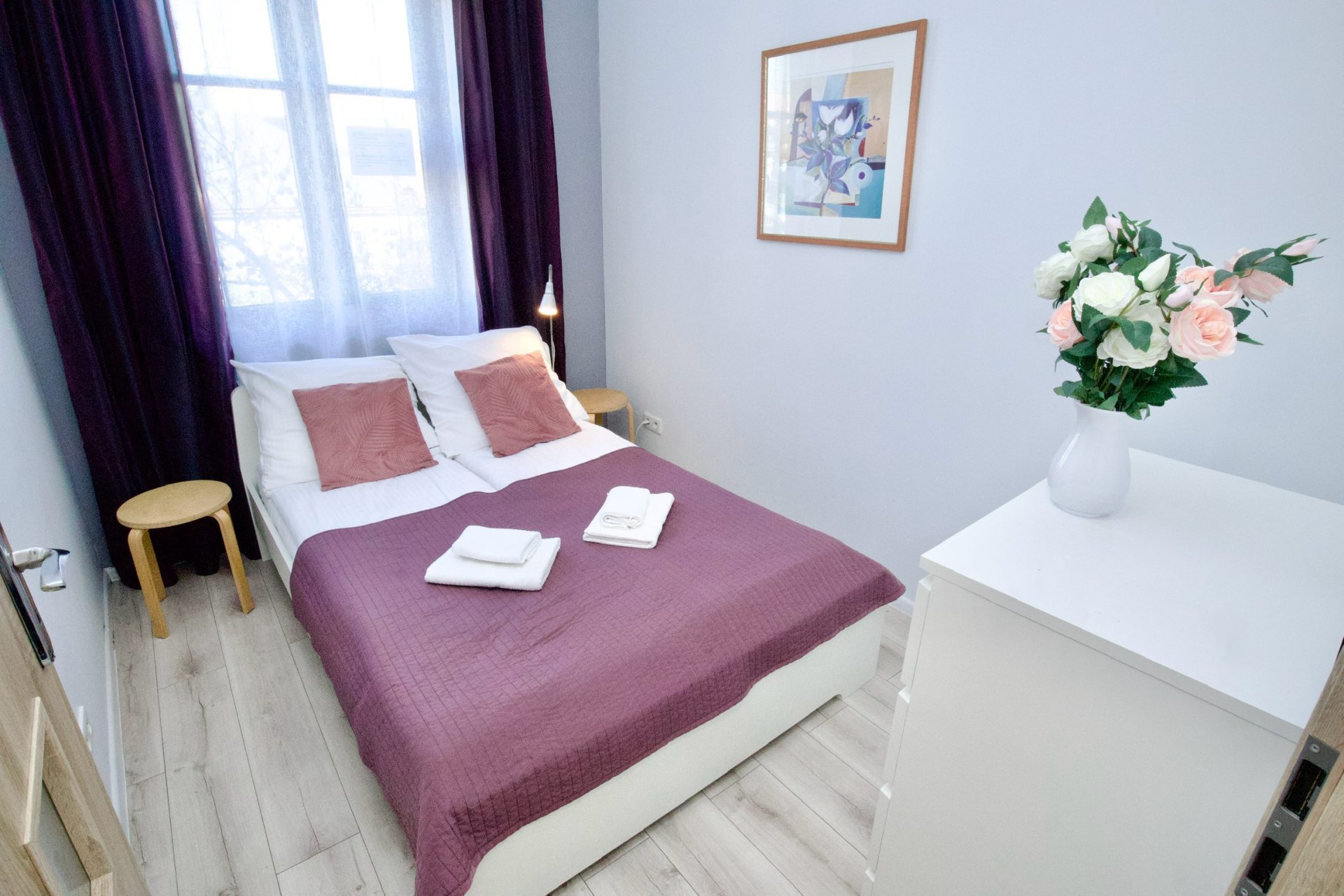 A 32m2 four-person apartment is located on the 3rd floor in a building with an elevator, consisting of a living room with a kitchen and dining area, a bedroom and a bathroom. The apartment is equipped with a table with chairs, a double bed, a double sofa bed, a hair dryer, an iron, TV, Wi-Fi, necessary utensils and dishes in the kitchen. Bed linen, towels and soap are provided. The windows of the apartment overlook Krowoderska Street.