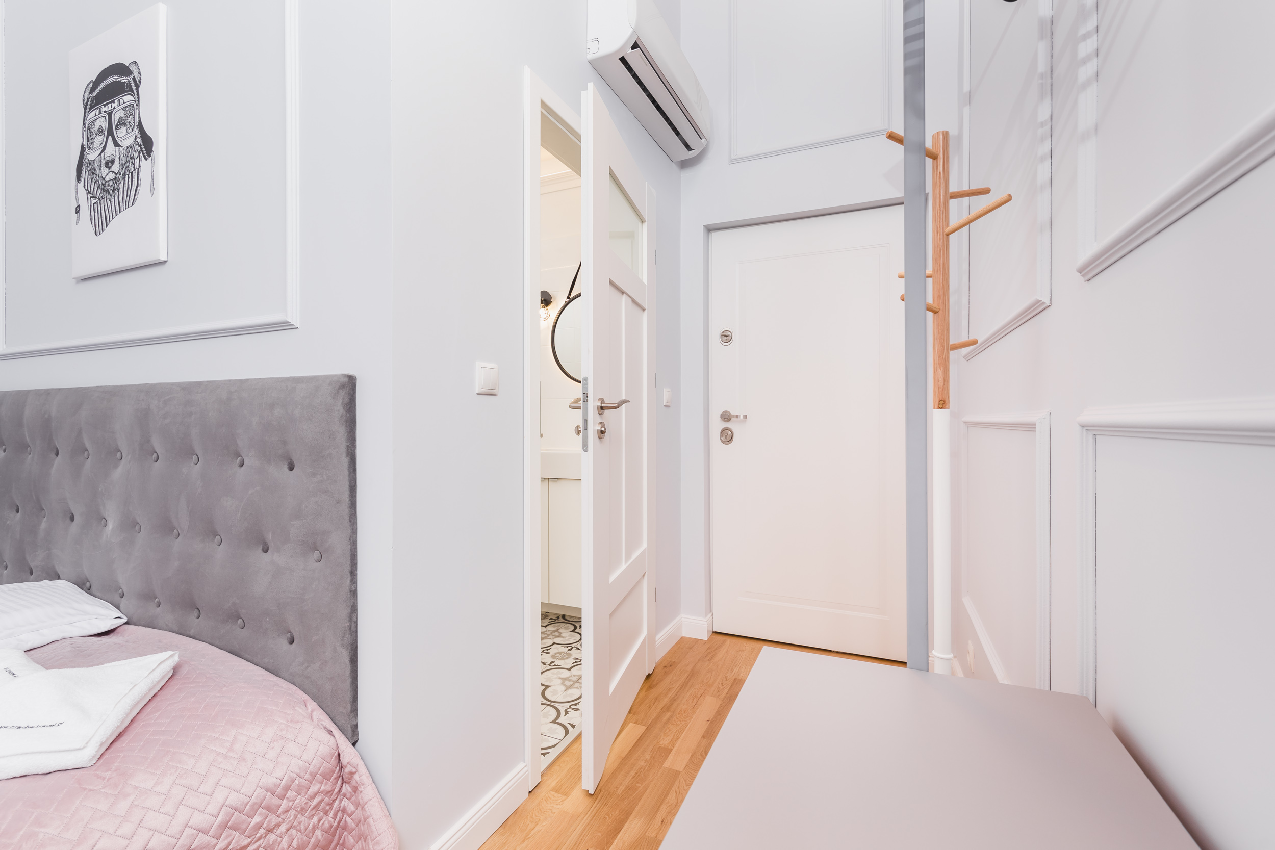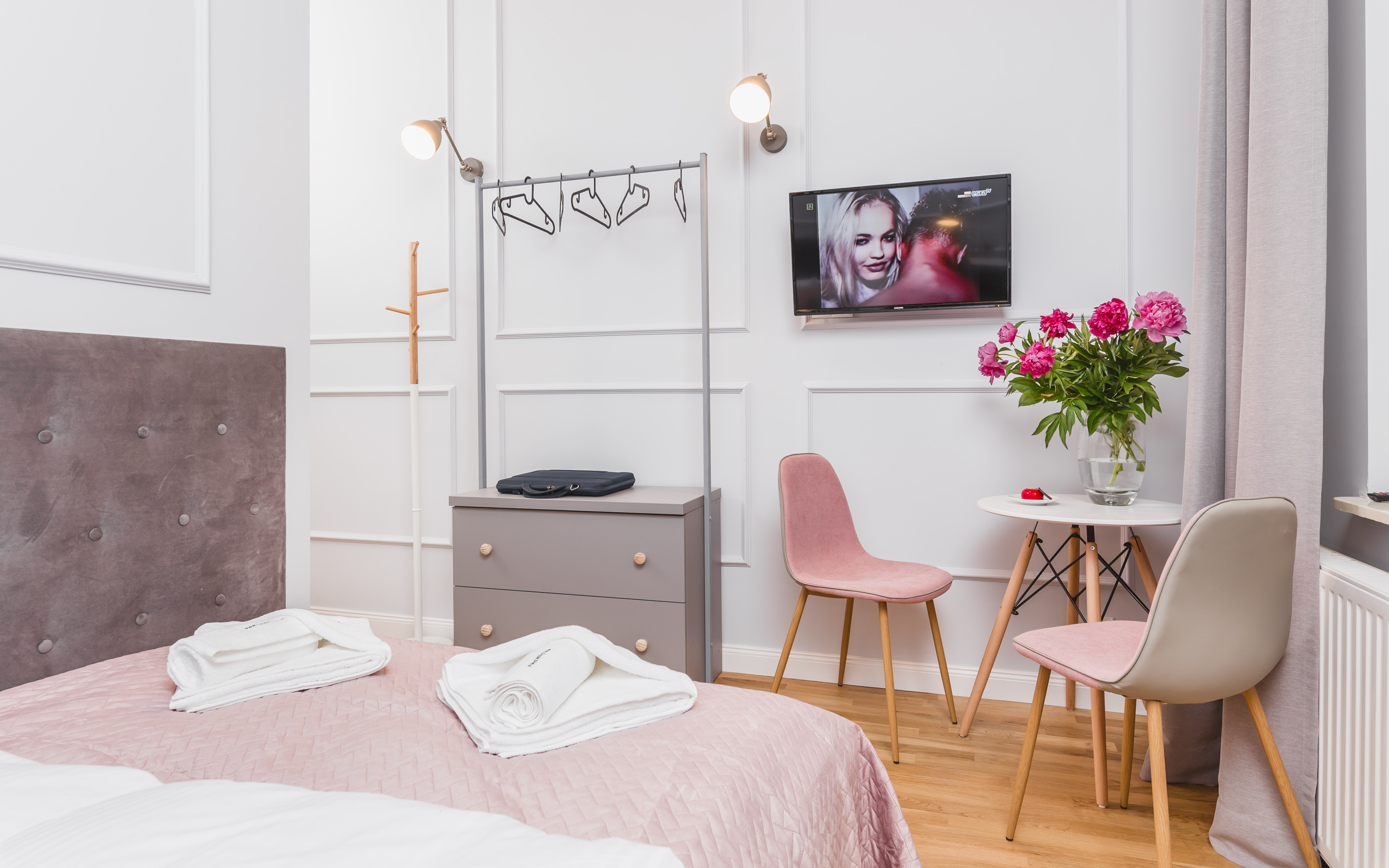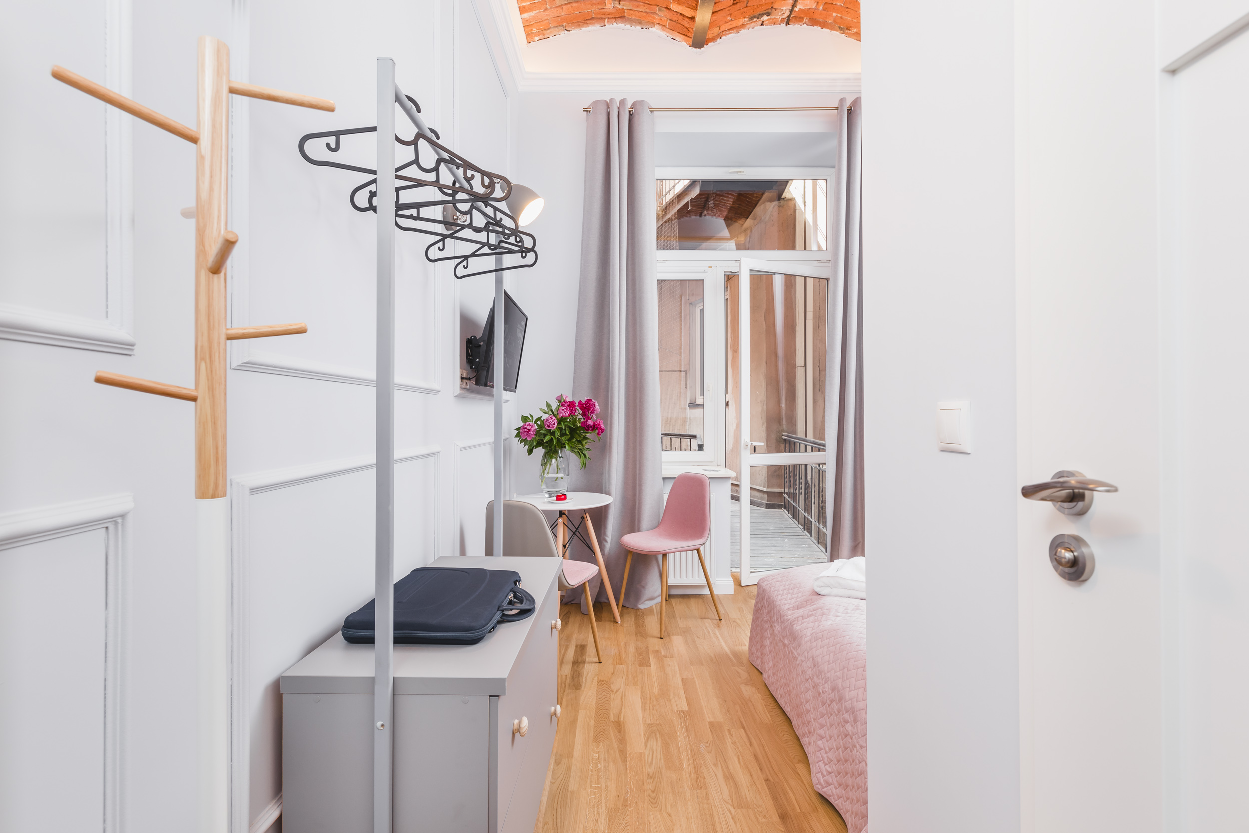 16m² studio for 2 people overlooking the courtyard. The quiet room is equipped with a double bed, a table with chairs, a chest of drawers, air conditioning, TV, fridge, kettle, hairdryer, bed linen, towels, soap and a private bathroom with a shower. Guests have at their disposal a kitchenette for shared use with other rooms, free Wi-Fi, iron and ironing board.