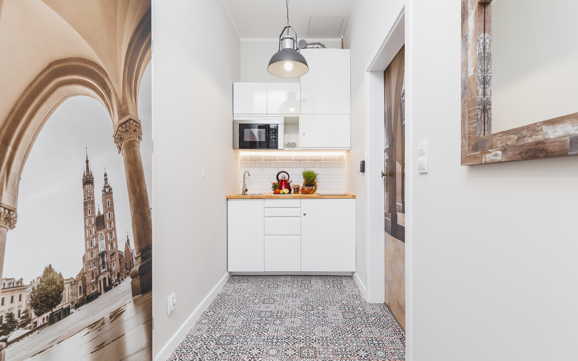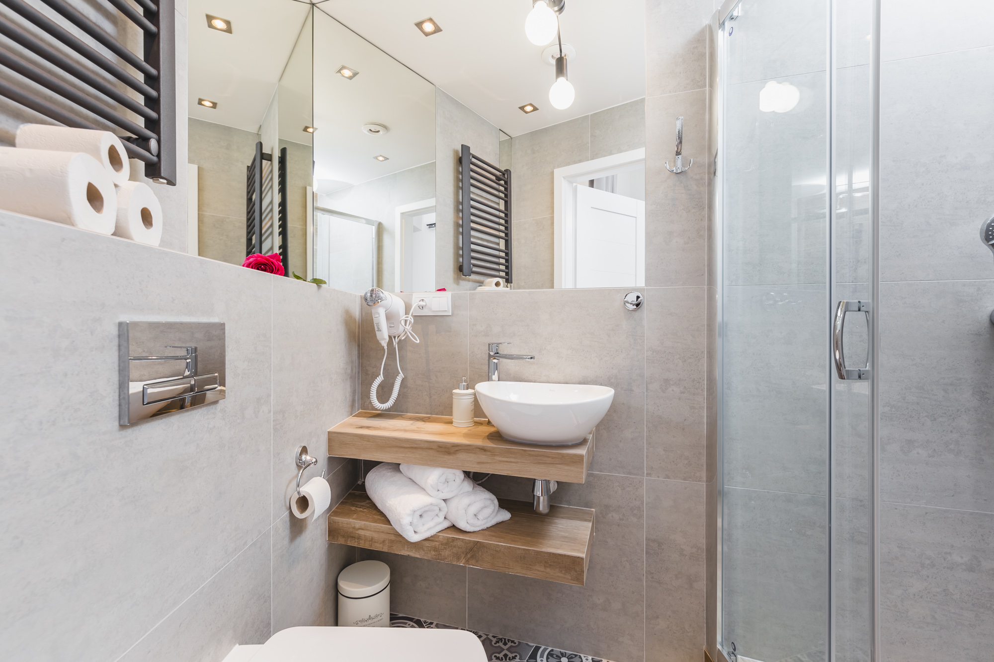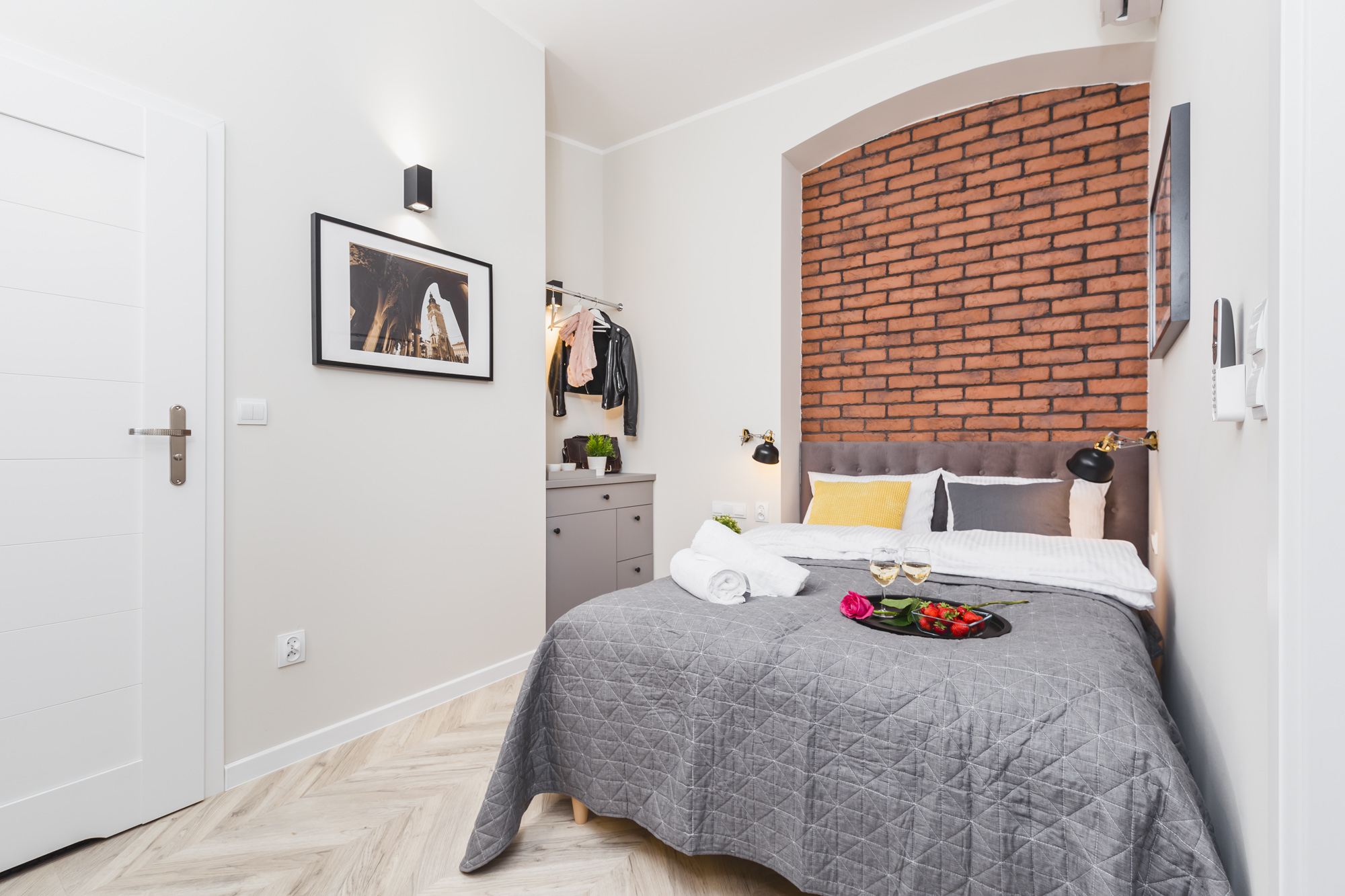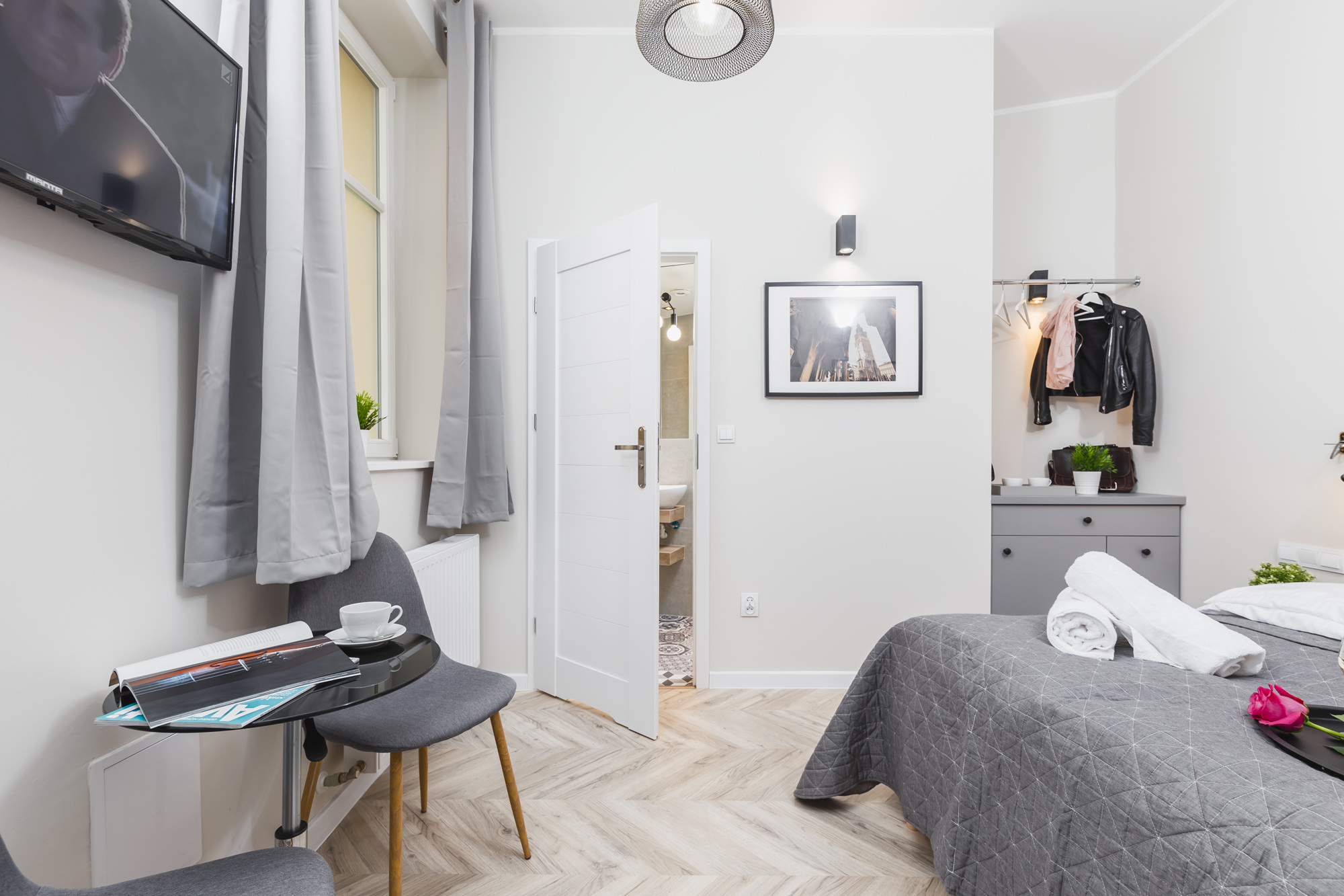 Przytulny, klimatyzowany apartament 12m² w doskonałej lokalizacji. Wyposażony jest w dwuosobowe łóżko, komodę, stolik z krzesłami, TV, Wi-Fi, lodówkę, czajnik, pościel i ręczniki, suszarkę do włosów oraz mydło. W skład apartamentu wchodzi również prywatna łazienka z prysznicem. W korytarzu dostępny jest dobrze wyposażony, wspólny (z apartamentem nr 2) aneks kuchenny. Do dyspozycji gości jest też żelazko i deska do prasowania. Widok z okna wychodzi na klatkę schodową.