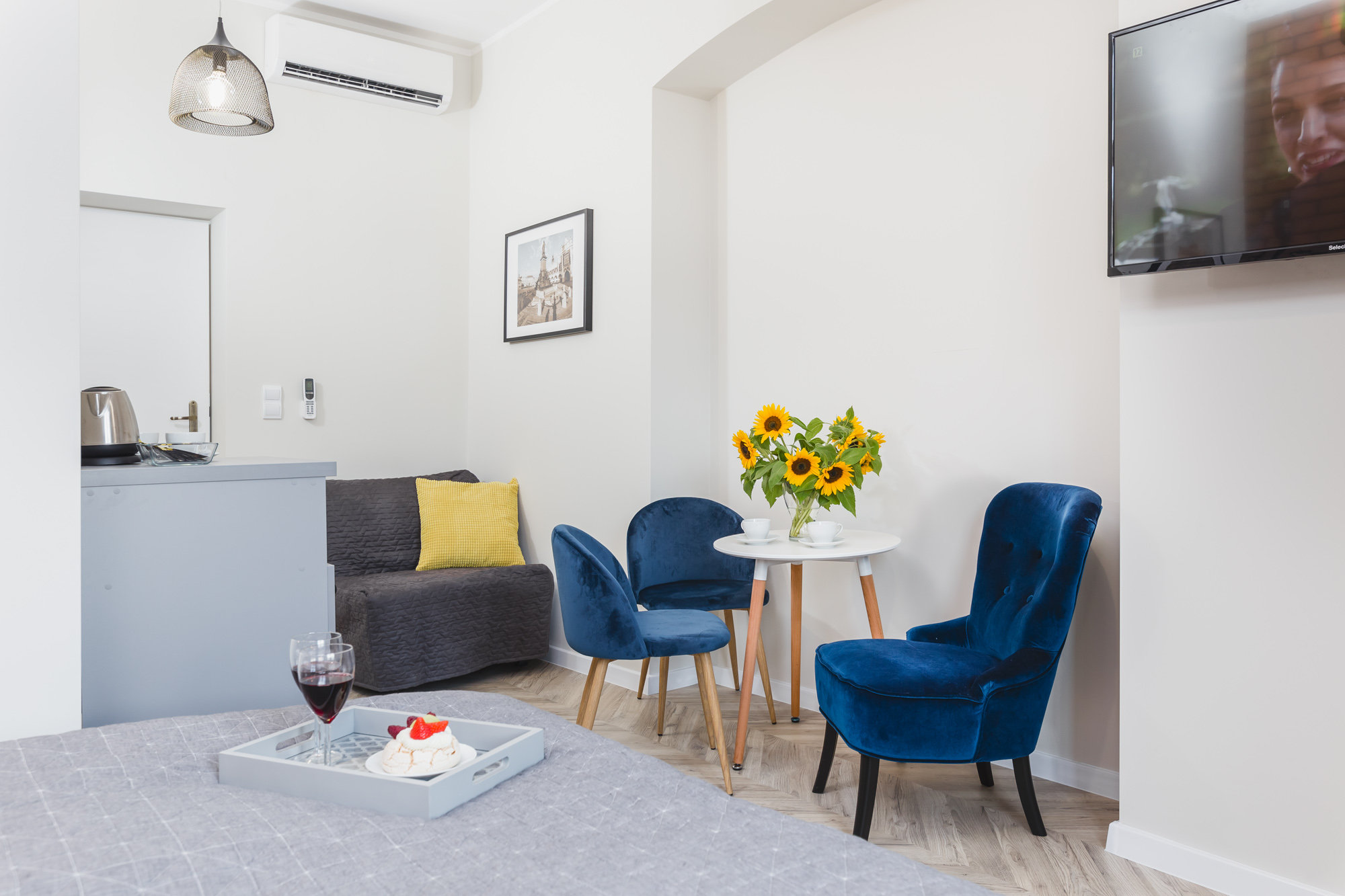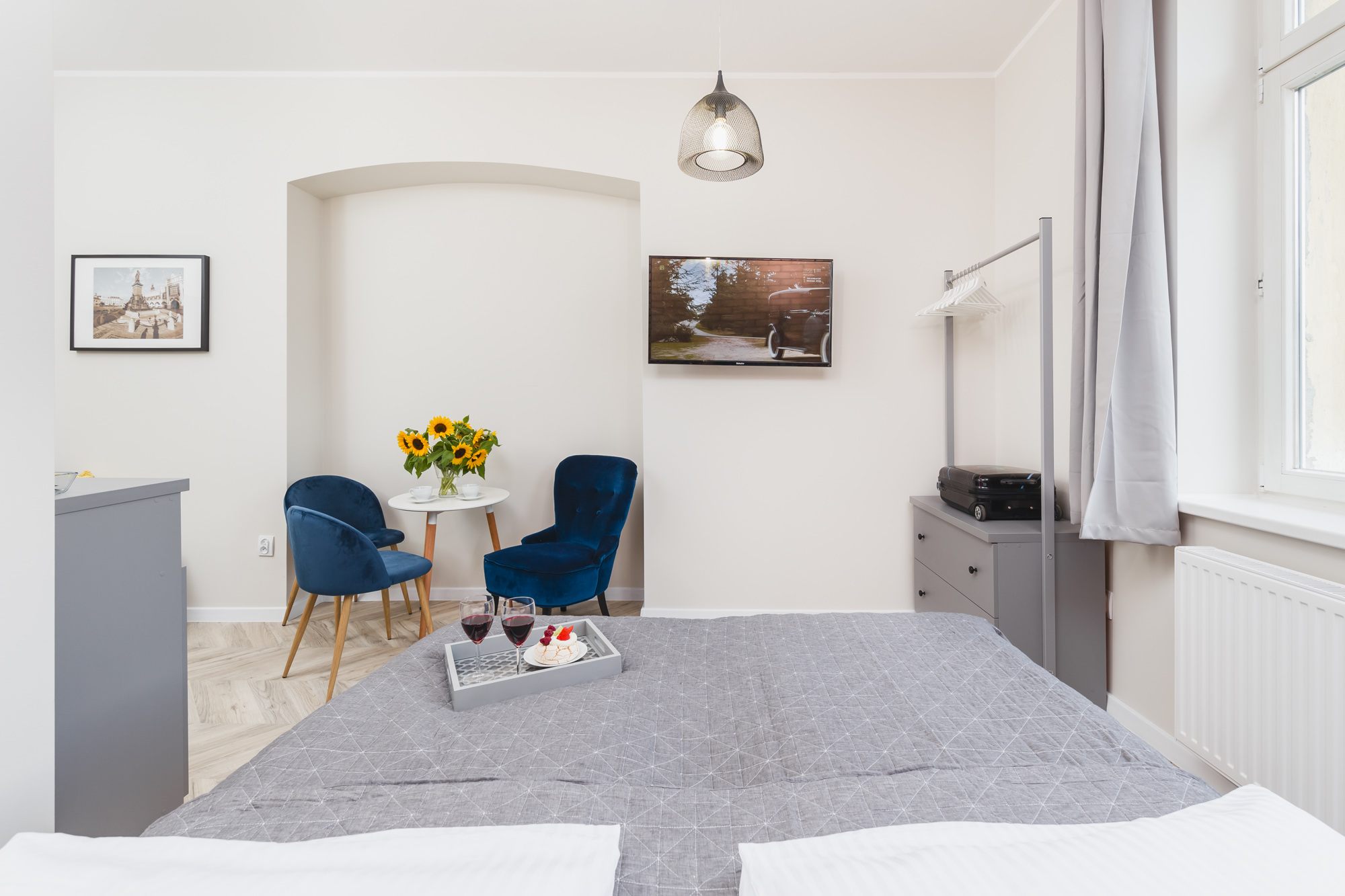 Klimatyzowany apartament 20m² w doskonałej lokalizacji. Wyposażony jest w 2 pojedyncze złączone łóżka z możliwością rozstawienia, rozkładaną pojedynczą sofę, komodę, stolik z krzesłami TV, Wi-Fi,  lodówkę, czajnik, pościel i ręczniki, suszarkę do włosów oraz mydło. W skład apartamentu wchodzi również prywatna łazienka z prysznicem. W korytarzu dostępny jest dobrze wyposażony, wspólny (z apartamentem nr 1) aneks kuchenny. Do dyspozycji gości jest też żelazko i deska do prasowania.
