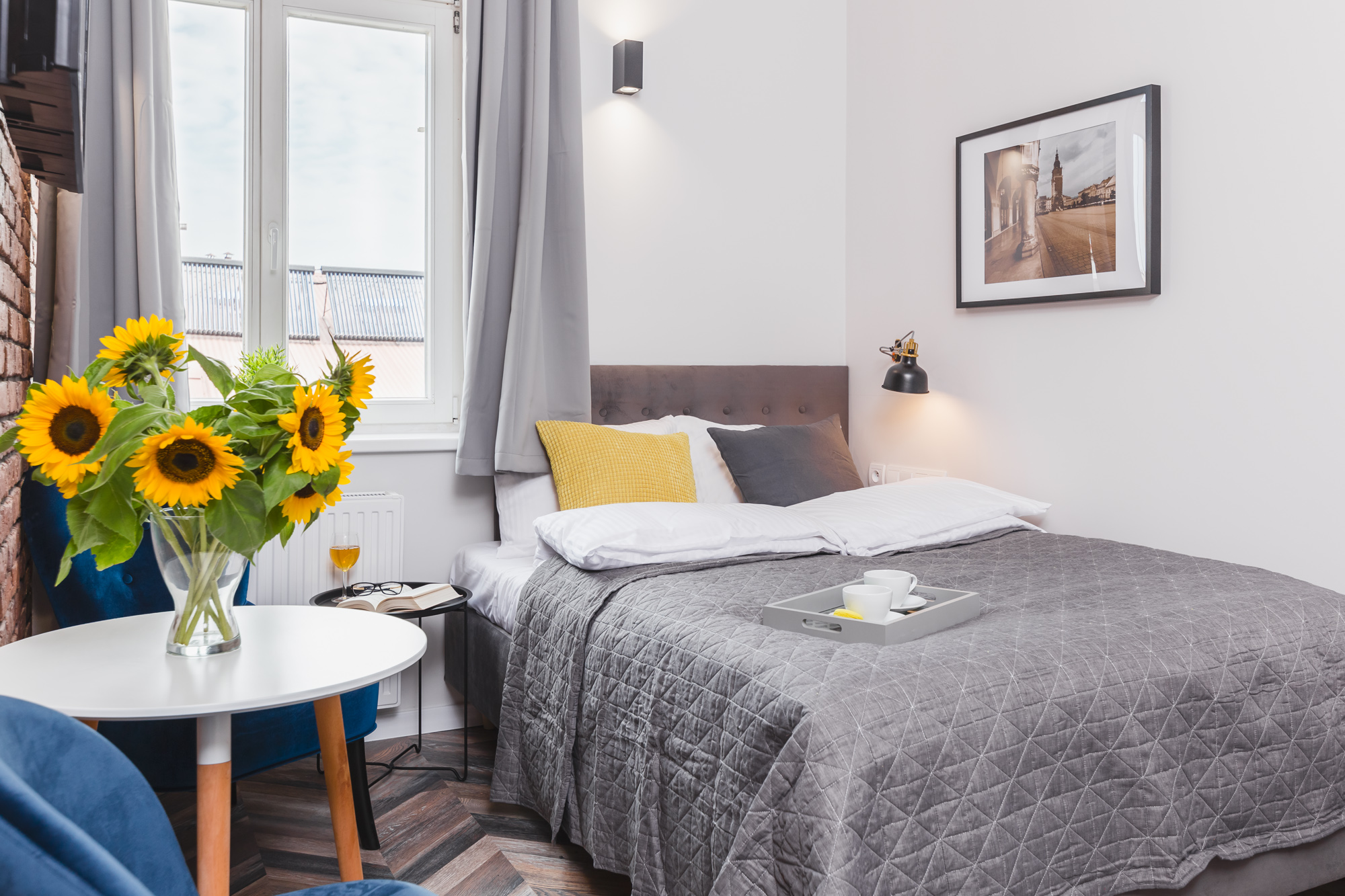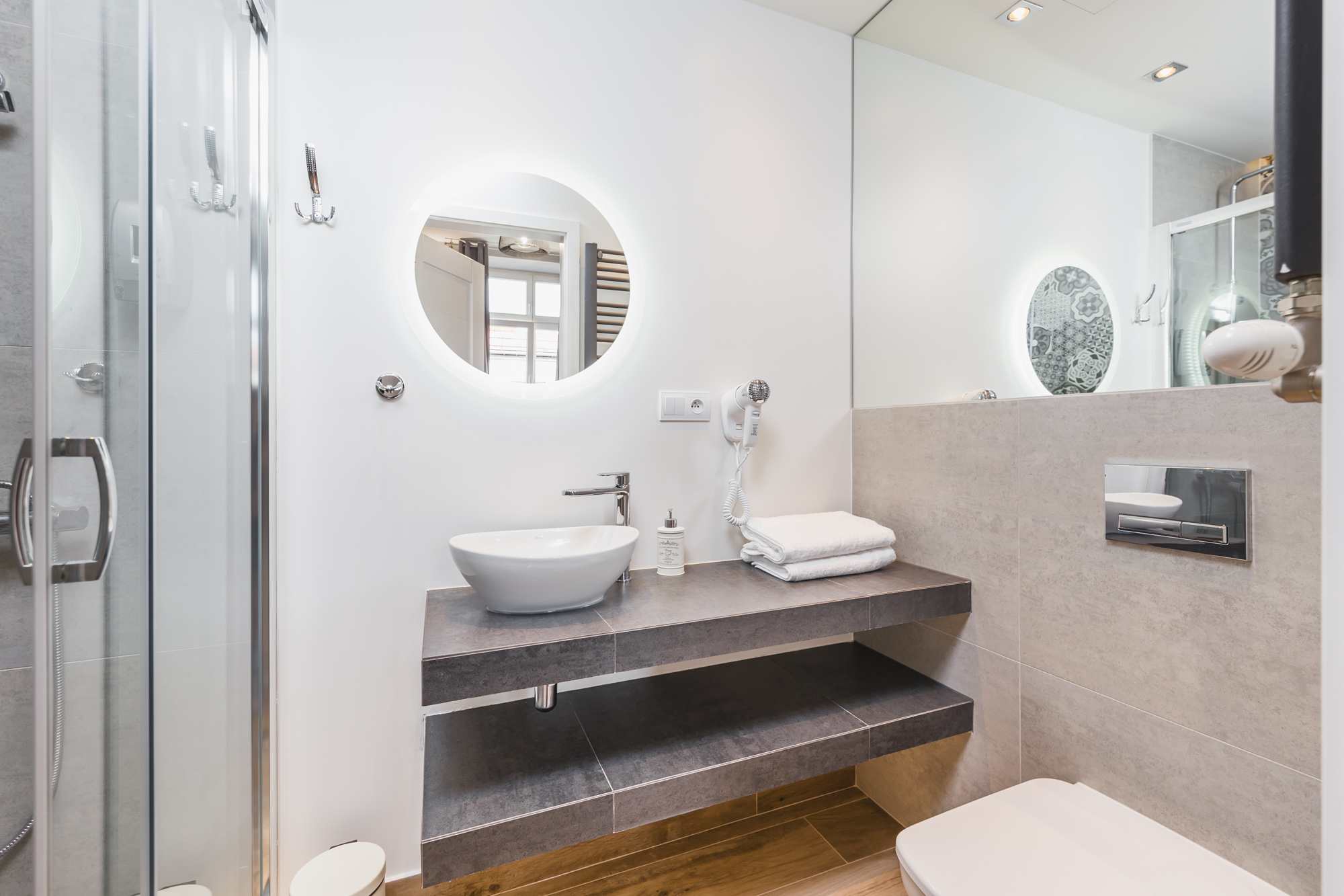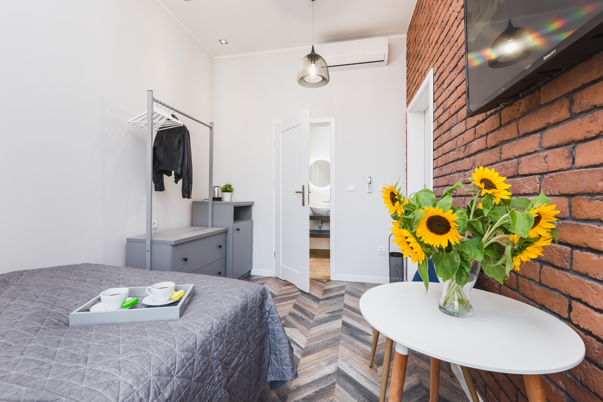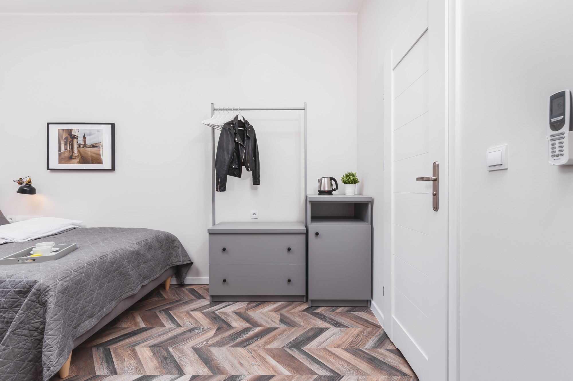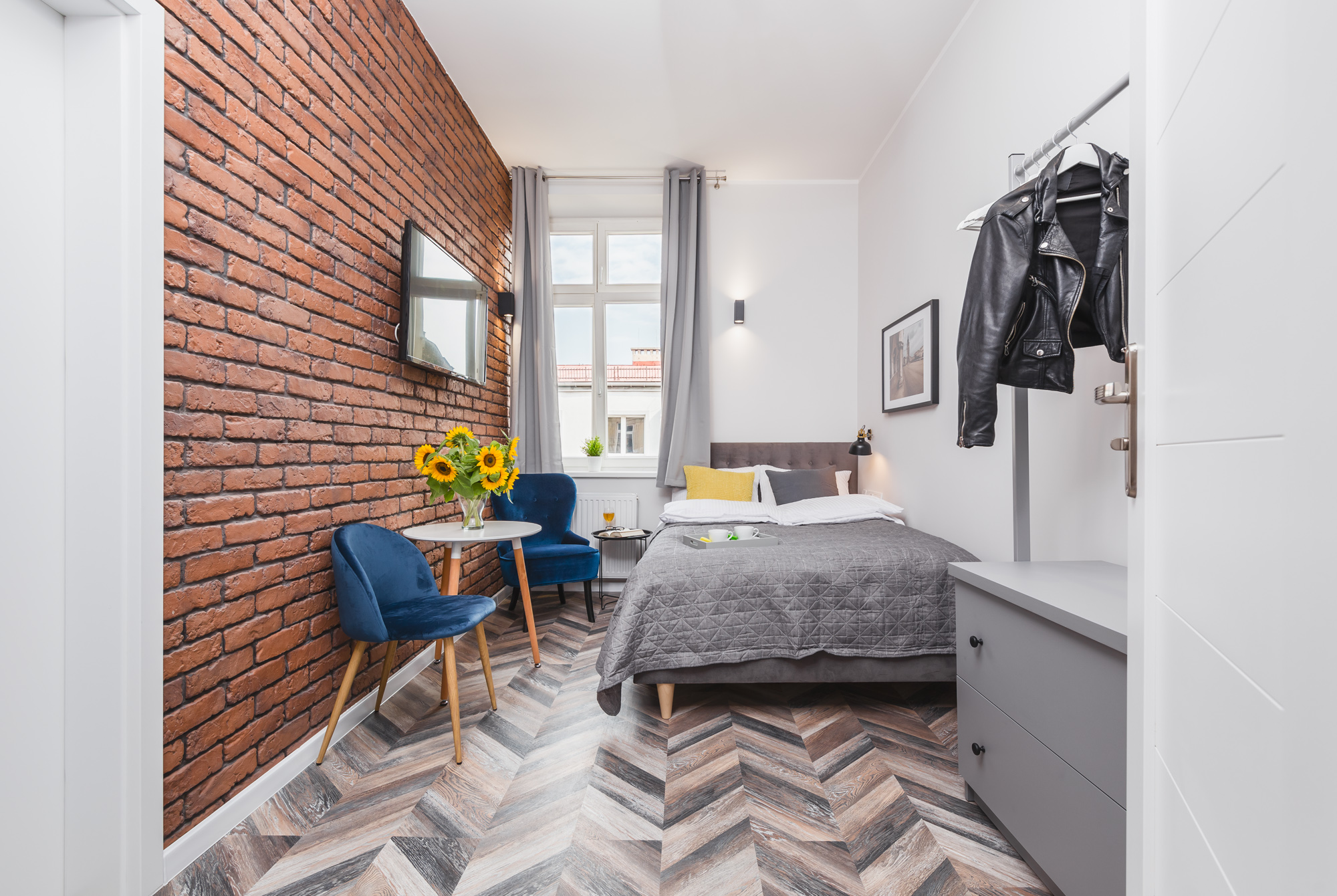 Komfortowy apartament 14m² w doskonałej lokalizacji. Wyposażony jest w wygodne, podwójne łóżko, komodę, stolik z krzesłami, TV, Wi-Fi, lodówkę, czajnik, pościel i ręczniki, suszarkę do włosów oraz mydło. W skład apartamentu wchodzi również prywatna łazienka z prysznicem. W korytarzu dostępny jest dobrze wyposażony, wspólny (z apartamentem nr 3) aneks kuchenny. Do dyspozycji gości jest też żelazko i deska do prasowania.
