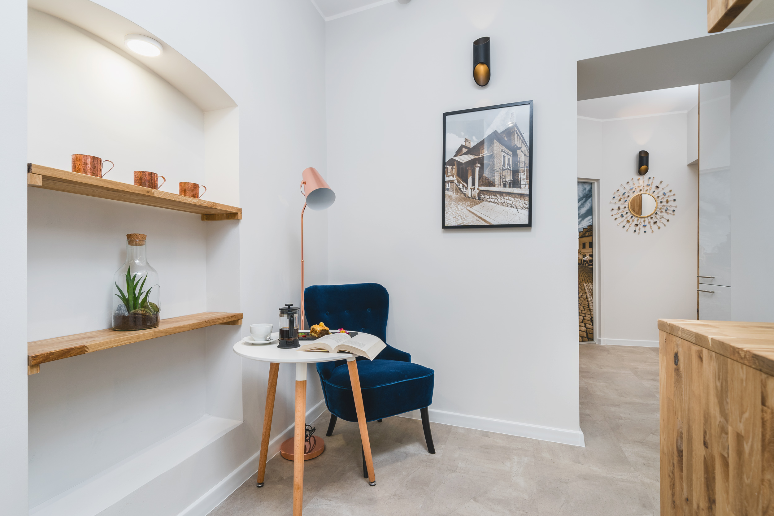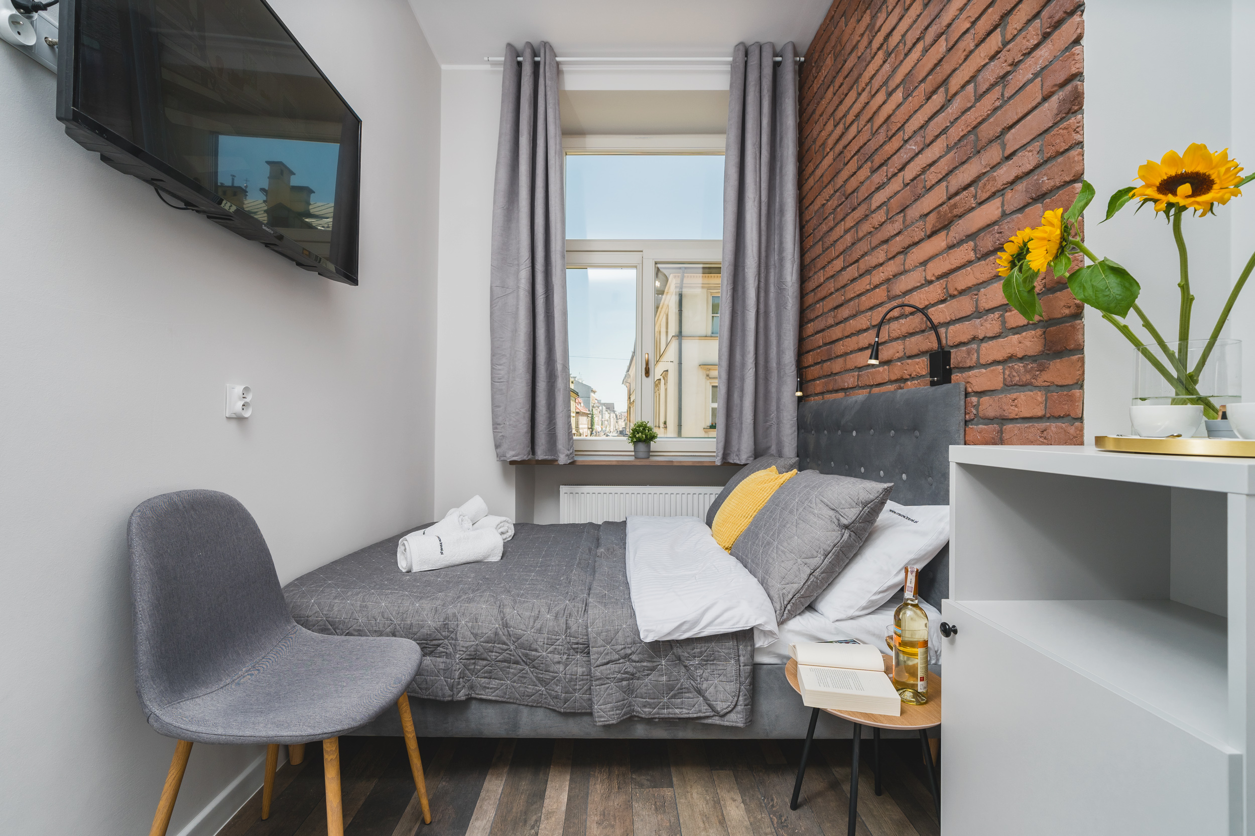 Przytulny, klimatyzowany apartament o powierzchni 13m2, wyposażony jest w dwuosobowe łóżko, komodę, TV, lodówkę, pościel i ręczniki, suszarkę do włosów oraz mydło. W skład apartamentu wchodzi również prywatna łazienka. W korytarzu dostępny jest dobrze wyposażony, wspólny aneks kuchenny oraz stolik, przy którym można zjeść posiłki.