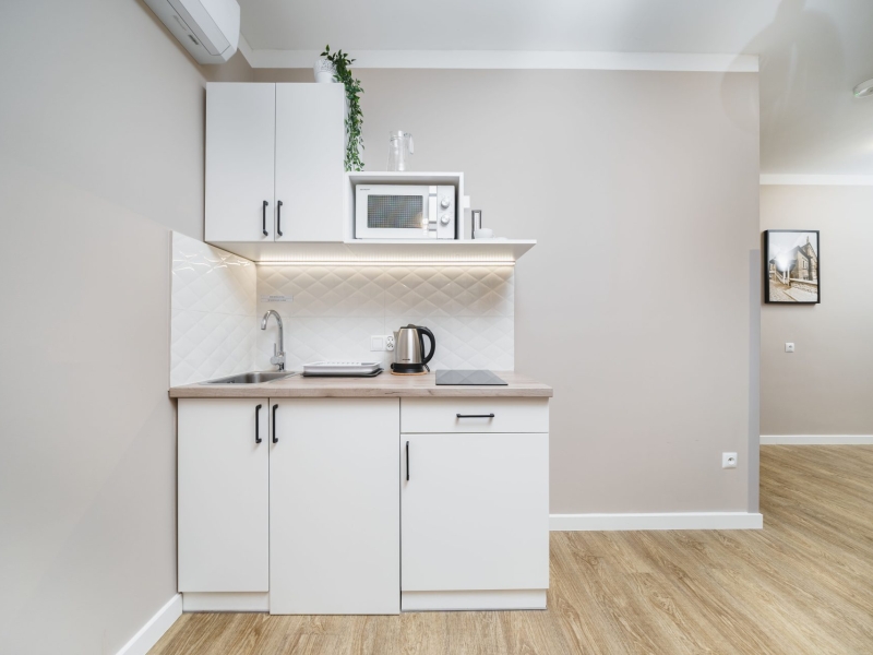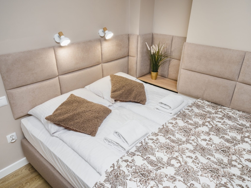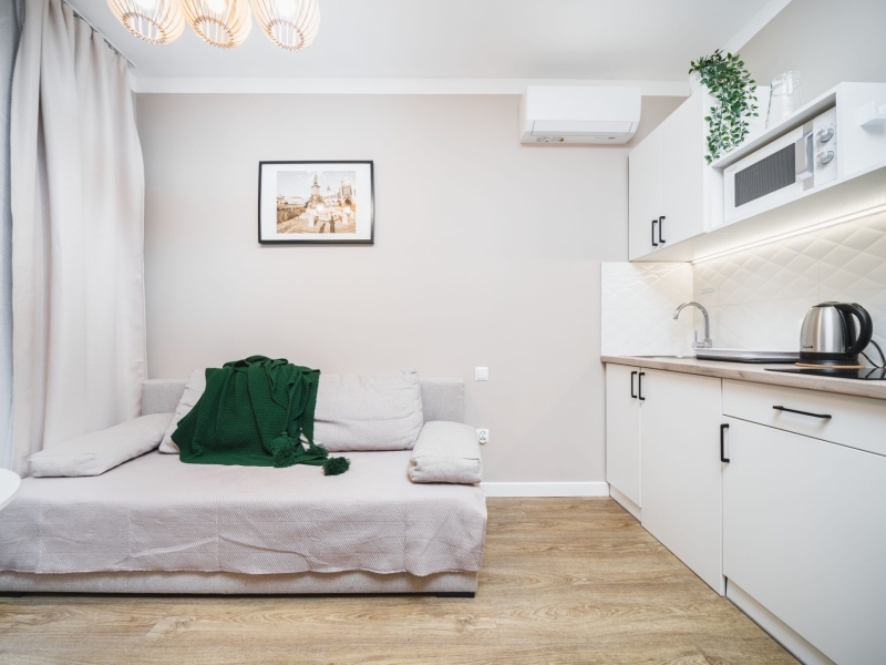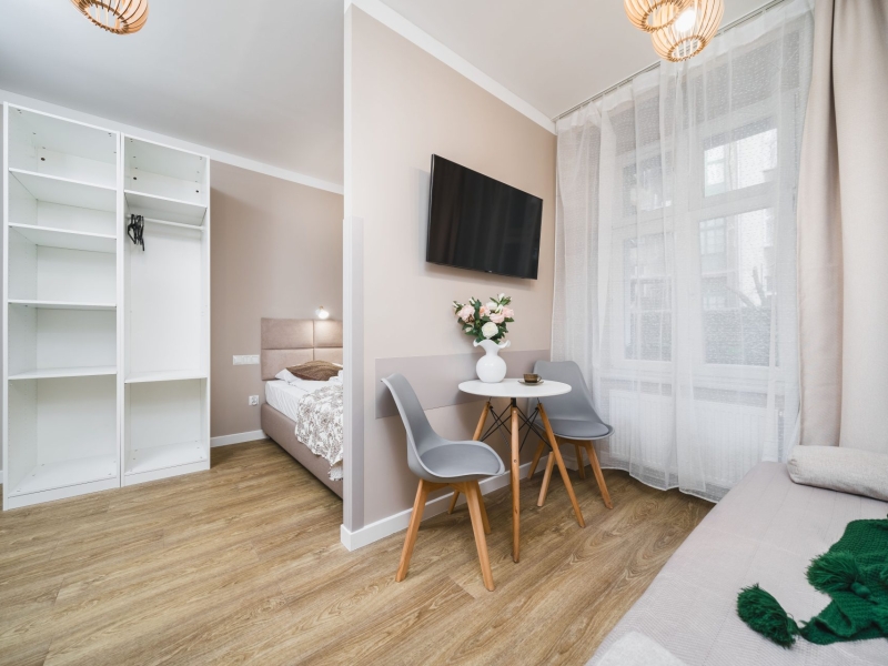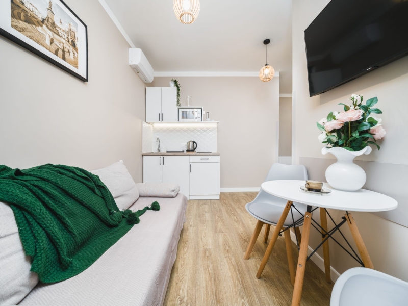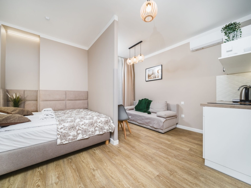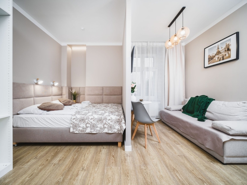 Komfortowy apartament dla 4 osób, umiejscowiony w doskonałej lokalizacji pomiędzy Rynkiem Głównym a żydowską dzielnicą Kazimierz. Apartament typu studio z podwójnym łóżkiem, rozkładaną, podwójną sofą. Łazienka z prysznicem oraz aneks kuchenny, wyposażony we wszystkie niezbędne przybory do przygotowania posiłku.