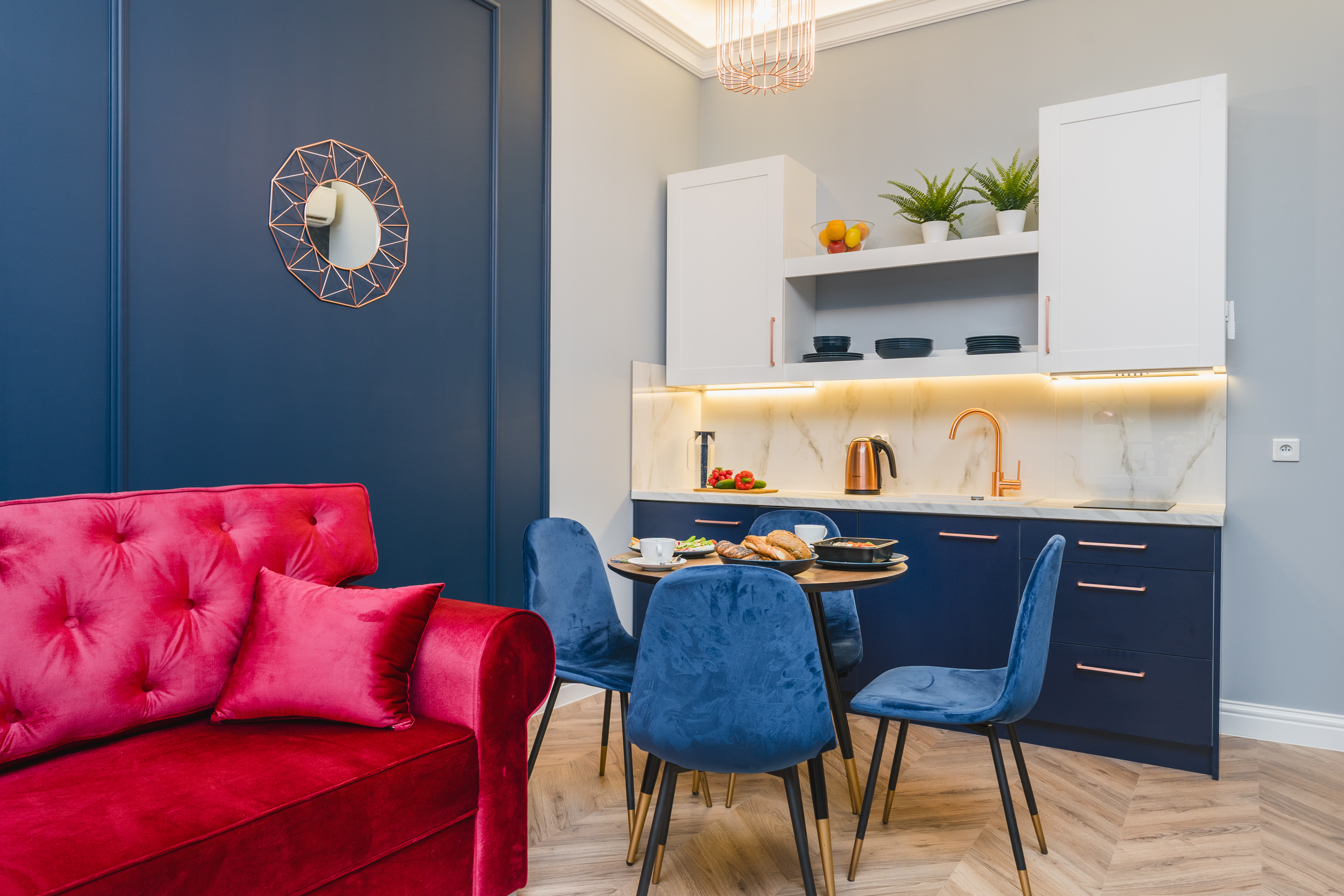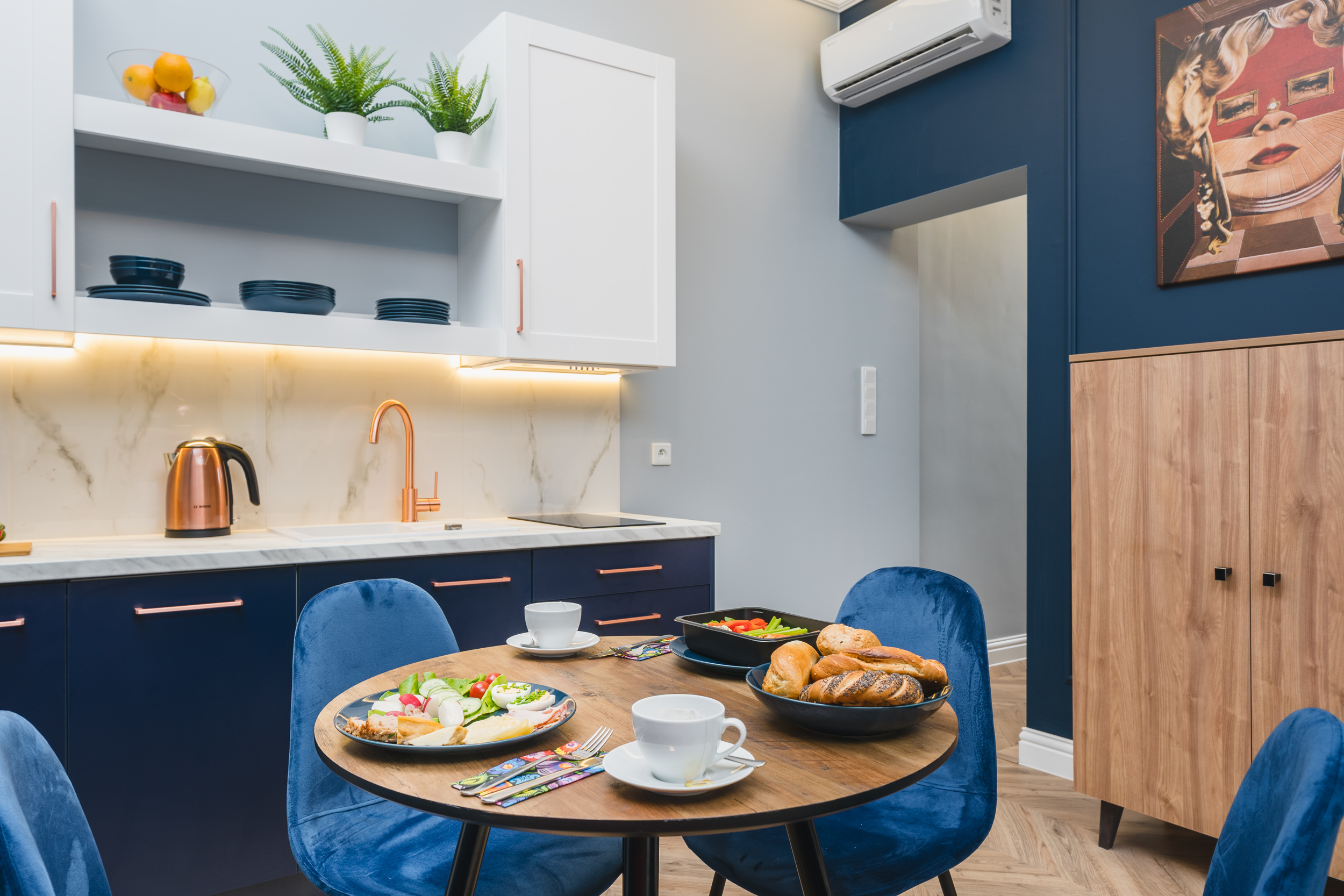 Komfortowy, klimatyzowany apartament przeznaczony dla 4 osób o powierzchni 32m2, składa się z oddzielnej sypialni, holu, eleganckiego salonu wraz z w pełni wyposażonym aneksem kuchennym oraz prywatnej łazienki z prysznicem. Wnętrze zostało wyposażone w podwójne, wygodne łóżko w sypialni oraz rozkładaną dwuosobową sofę w salonie. Ponadto goście mają do dyspozycji stolik z krzesłami, wygodny fotel, lodówkę, zmywarkę, TV, darmowe Wi-Fi, pościel, ręczniki i mydło. Okna pokoju wychodzą na odnowiony dziedziniec, dzięki czemu jest tu naprawdę spokojnie i zacisznie. Dodatkowej elegancji nadają odważne kolory wnętrza i obrazy samego Salvadora Dali, zdobiące ściany apartamentu.