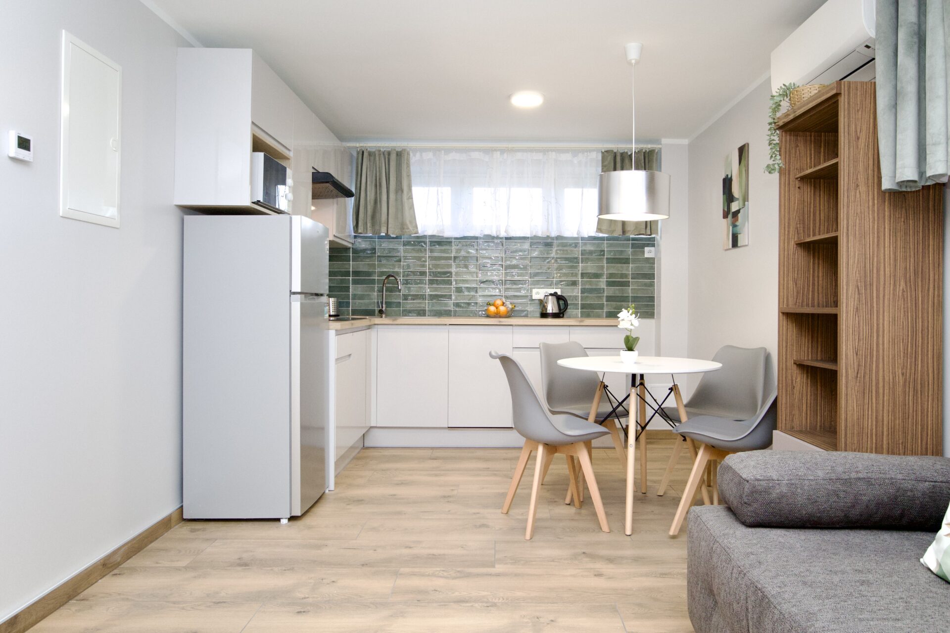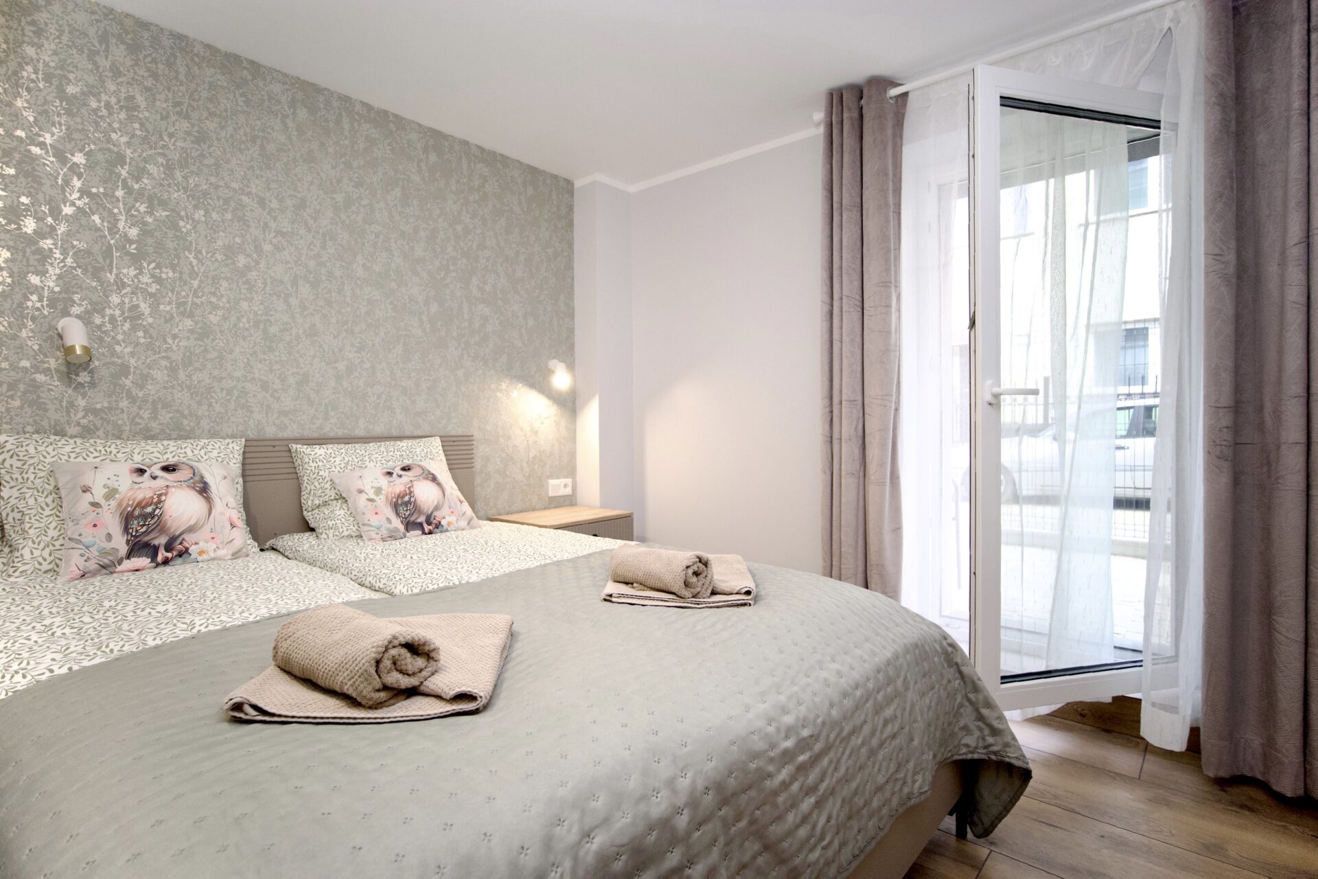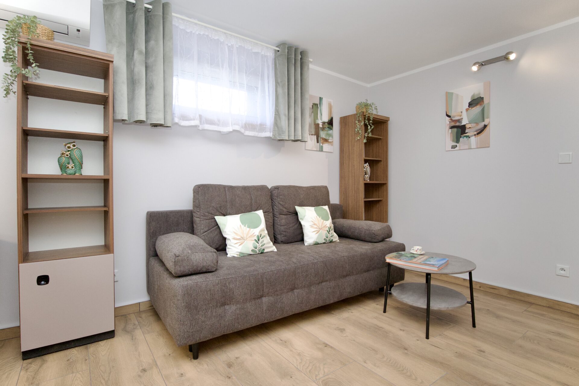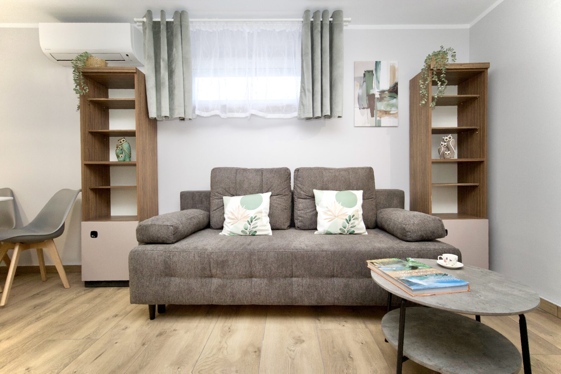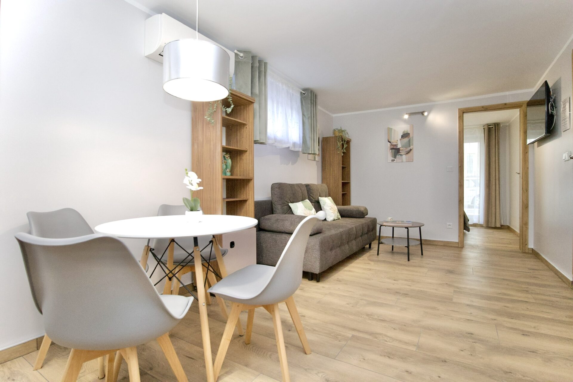 Klimatyzowany apartament dla 4 osób z osobną sypialnią, aneksem kuchennym i łazienką. Idealny dla rodzin z dziećmi. W apartamencie znajdują się wszystkie niezbędne udogodnienia: klimatyzacja, pralka, zmywarka, naczynia i sztućce. Apartament położony na parterze, z wyjściem na prywatny taras. W cenie jest miejsce parkingowe dla samochodu.