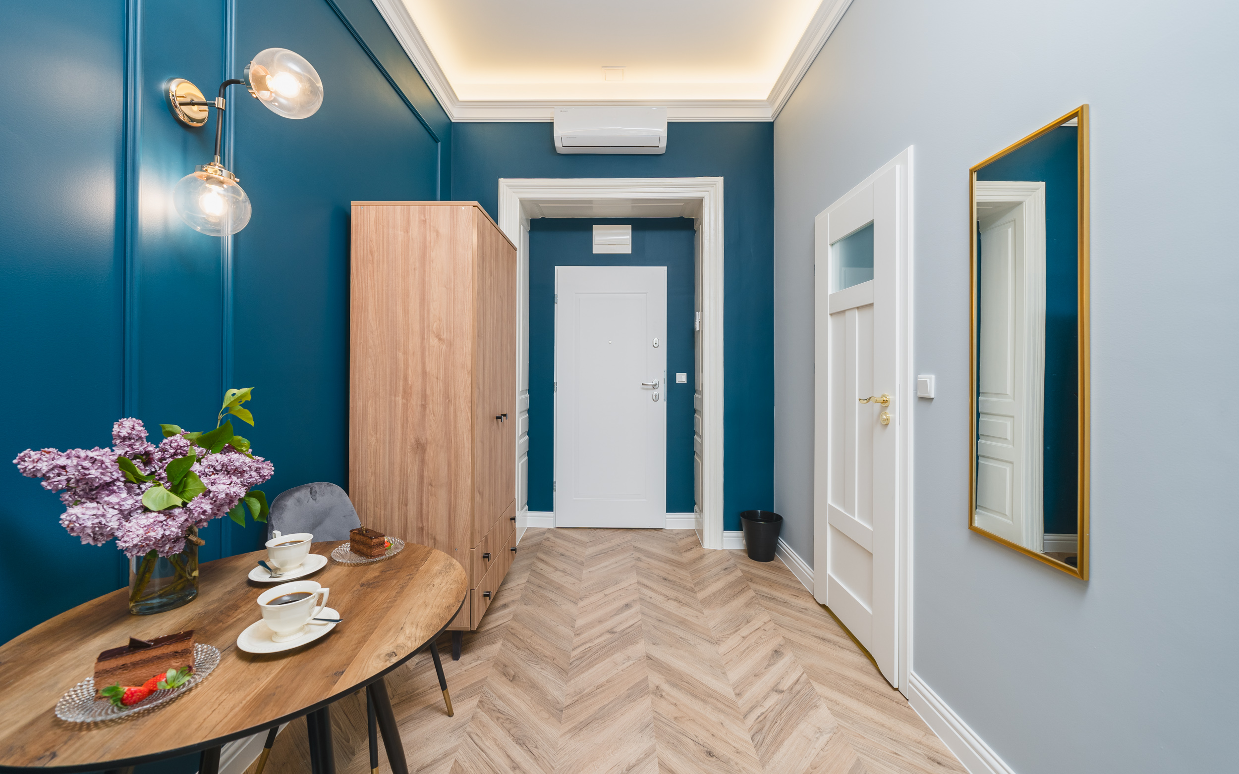 Klimatyzowany apartament o designerskim wystroju, przeznaczony dla dwóch osób o powierzchni 20m2. Pokój, wraz z prywatną łazienką z prysznicem, wyposażony jest w bardzo wygodne podwójne łóżko, stolik z krzesłami, fotel, klimatyzację, lodówkę, zestaw do przygotowania kawy/herbaty, TV, darmowe Wi-Fi, pościel i ręczniki oraz mydło. Goście tego apartamentu posiadają dostęp do w pełni wyposażonego, wspólnego aneksu kuchennego. Wnętrze wyróżnia głęboki kolor ścian, na których wiszą reprodukcje Tamary Lempickiej – polskiej malarki epoki art déco.