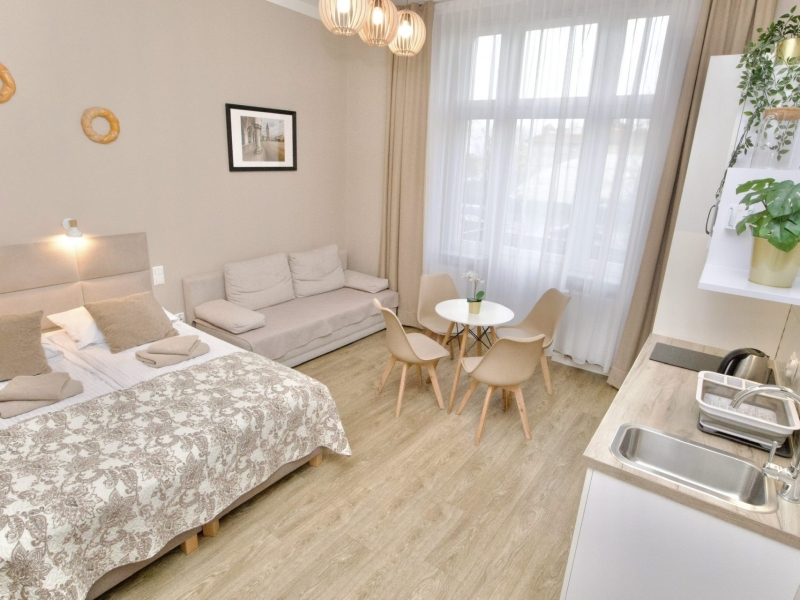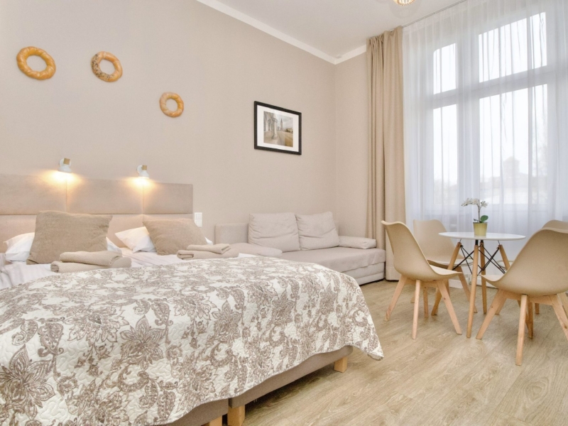Klimatyzowany apartament czteroosobowy typu studio o powierzchni 21m² z widokiem na ulice Dietla, Wawel oraz Wisłę. Komfortowe studio wyposażone jest w wygodne łóżko dwuosobowe, podwójną rozkładaną sofę oraz stolik z krzesłami. Prywatna łazienka z prysznicem wzbogacona jest w suszarkę do włosów. W skład aneksu kuchennego wchodzi: lodówka, płyta indukcyjna, czajnik, mikrofala oraz wszelkie niezbędne naczynia. Do dyspozycji gości klimatyzacja, TV, pościel i ręczniki, bezpłatne Wi-Fi, żelazko i deska do prasowania. Dodatkowo w obiekcie znajduje się pralka i suszarka do ubrań.