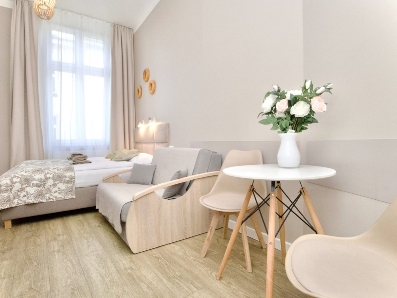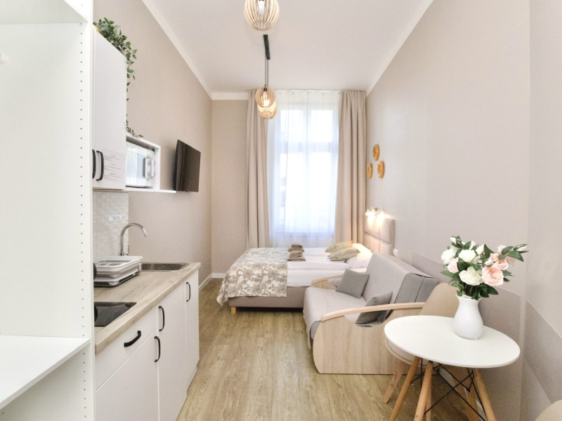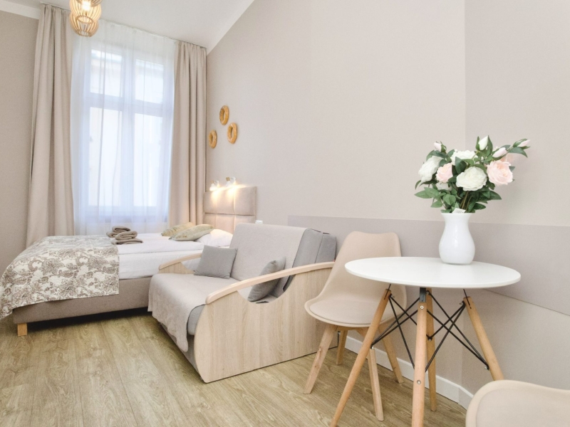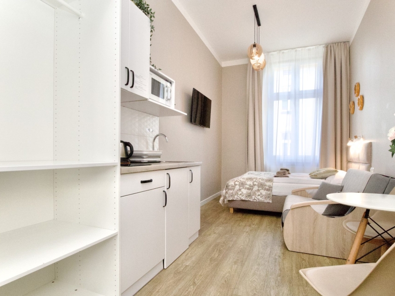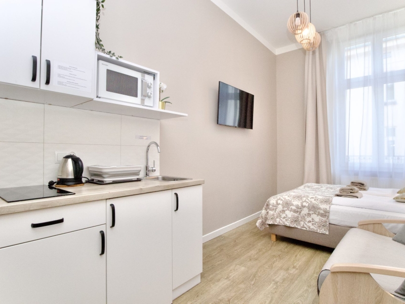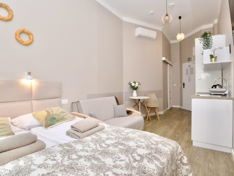 Klimatyzowany trzyosobowy apartament typu studio o powierzchni 25m². Cichy pokój wyposażony jest w dwuosobowe wygodne łóżko, jednoosobową sofę, stolik z krzesłami, szafę, klimatyzację, TV, suszarkę do włosów, pościel, ręczniki, mydło oraz prywatną łazienkę z prysznicem. W aneksie kuchennym znajduje się: lodówka, płyta indukcyjna, czajnik, mikrofala oraz wszelkie niezbędne naczynia.  Do dyspozycji gości jest bezpłatne Wi-Fi, żelazko i deska do prasowania oraz pralka i suszarka.