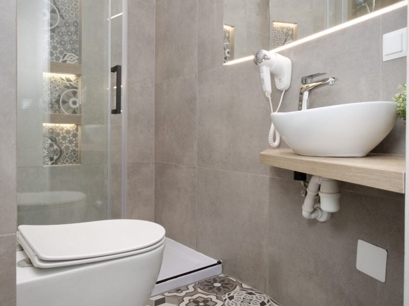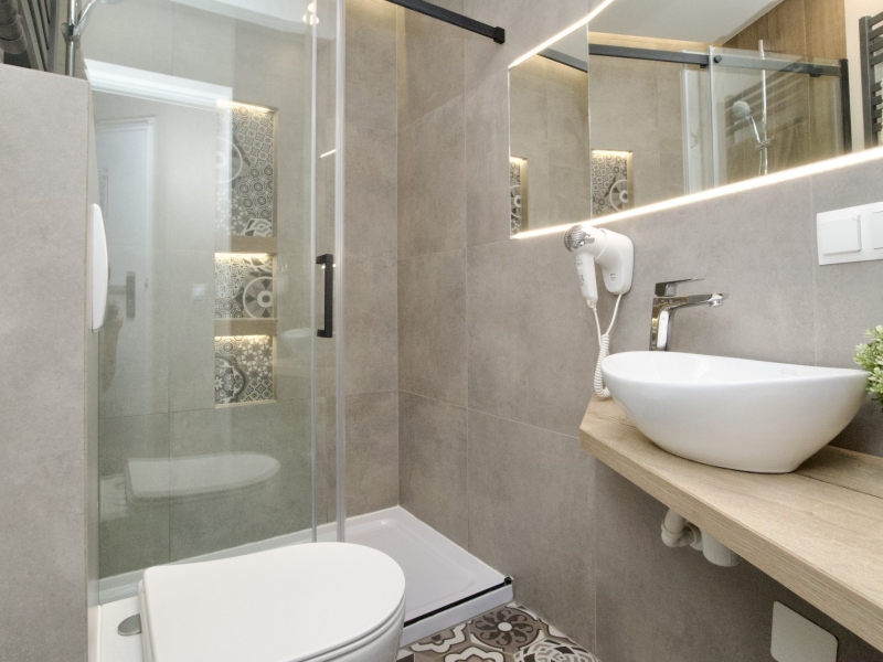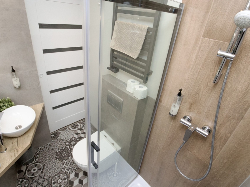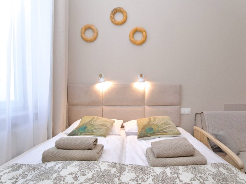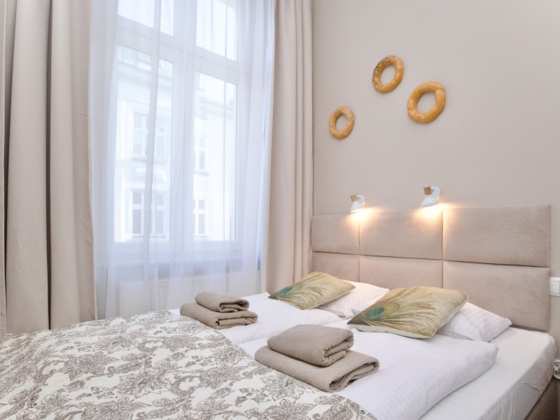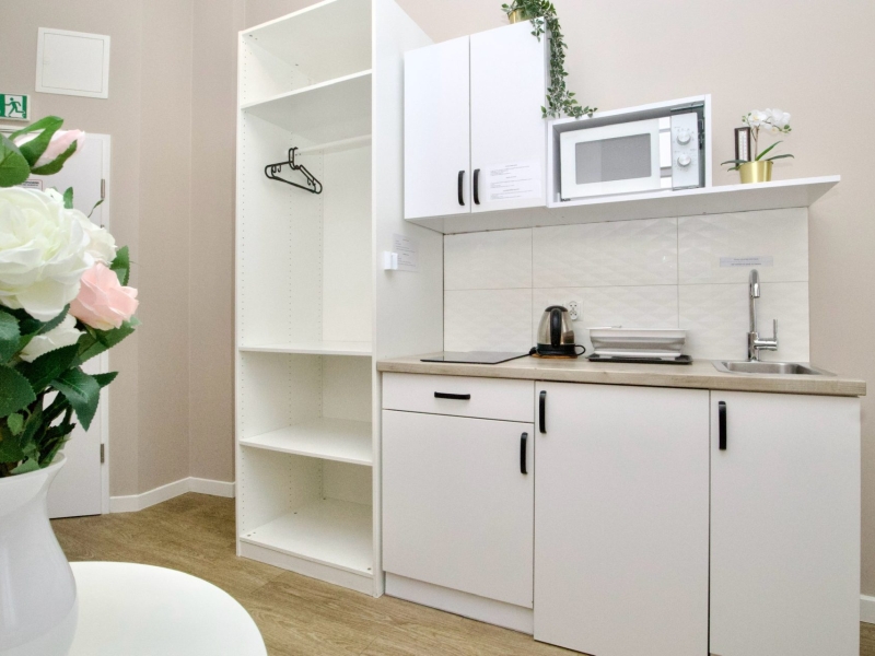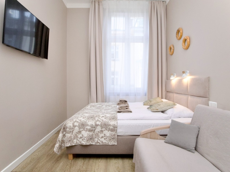 Klimatyzowany trzyosobowy apartament typu studio o powierzchni 25m². Cichy pokój wyposażony jest w dwuosobowe wygodne łóżko, jednoosobową sofę, stolik z krzesłami, szafę, klimatyzację, TV, suszarkę do włosów, pościel, ręczniki, mydło oraz prywatną łazienkę z prysznicem. W aneksie kuchennym znajduje się: lodówka, płyta indukcyjna, czajnik, mikrofala oraz wszelkie niezbędne naczynia.  Do dyspozycji gości jest bezpłatne Wi-Fi, żelazko i deska do prasowania oraz pralka i suszarka.