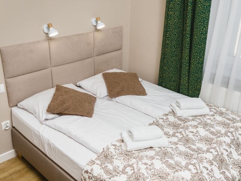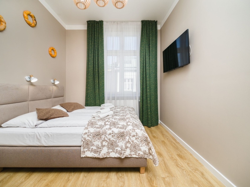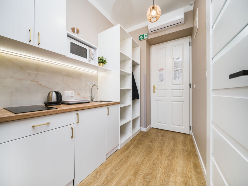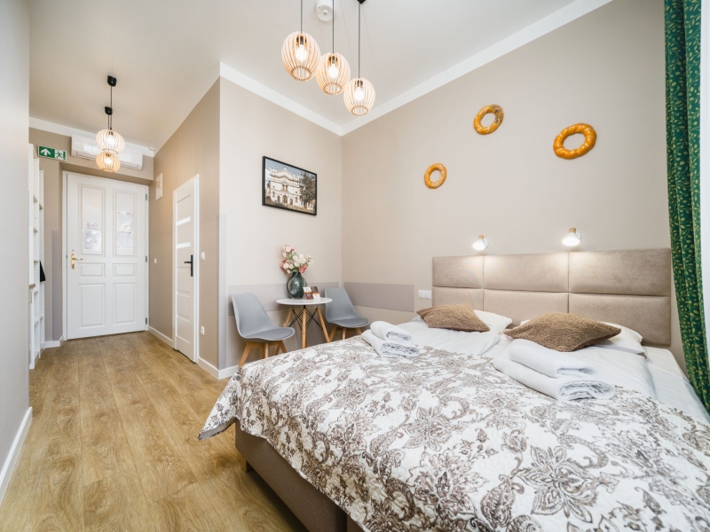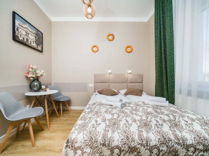 Przytulny dwuosobowy apartament typu studio o powierzchni 17m² z widokiem na ulice. Cichy pokój wyposażony jest w wygodne podwójne łóżko, stolik z krzesłami, szafę, klimatyzację, TV, suszarkę do włosów, pościel, ręczniki, mydło oraz prywatną łazienkę z prysznicem. W aneksie kuchennym znajduje się: lodówka, płyta indukcyjna, czajnik, mikrofala oraz wszelkie niezbędne naczynia. Do dyspozycji gości jest bezpłatne Wi-Fi, żelazko i deska do prasowania oraz pralka i suszarka.
