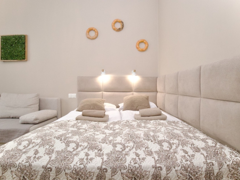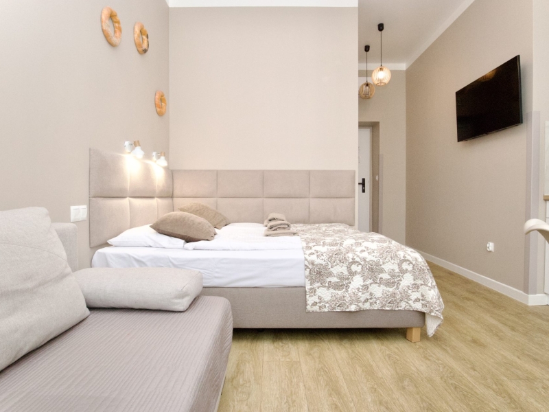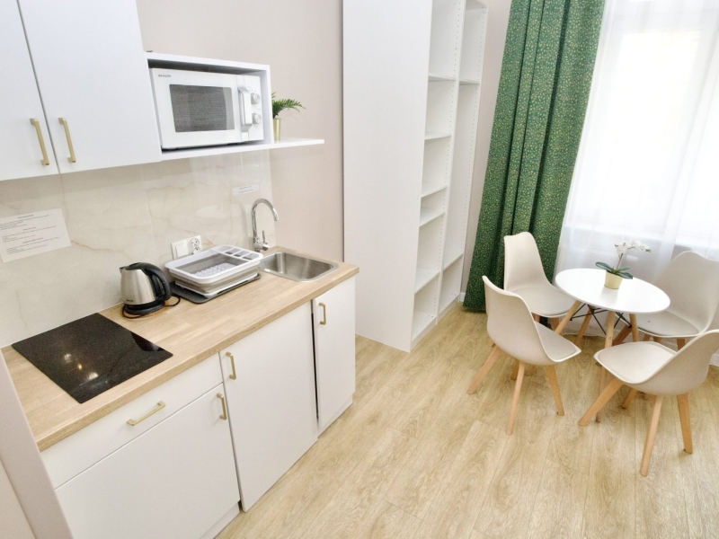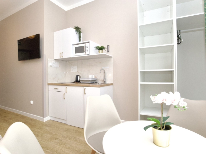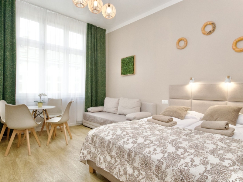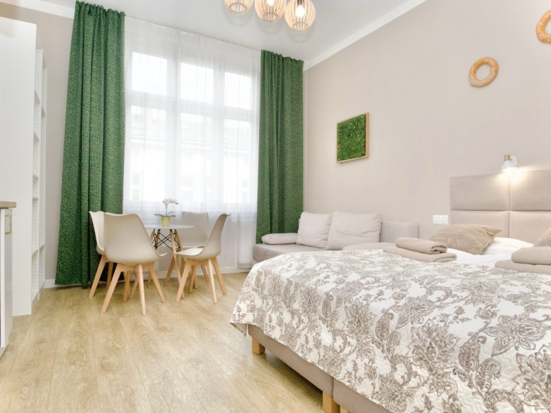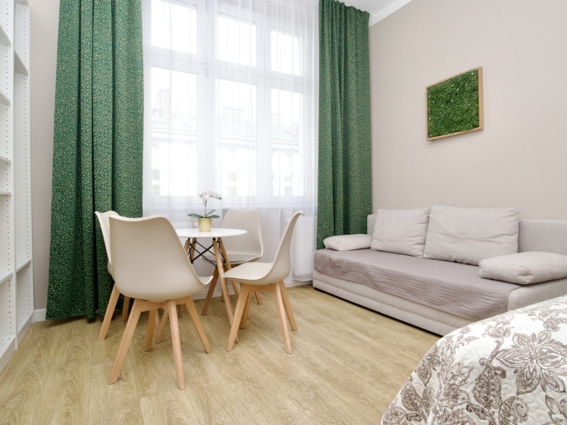Klimatyzowany apartament czteroosobowy typu studio z balkonem o powierzchni 25m² z widokiem na ulice Dietla, Wawel oraz Wisłę. Przestronne Studio wyposażone jest w wygodne łóżko dwuosobowe, podwójną rozkładaną sofę oraz stolik z krzesłami. Prywatna łazienka z prysznicem wzbogacona jest w suszarkę do włosów. W aneksie kuchennym znajduje się: lodówka, płyta indukcyjna, czajnik, mikrofala oraz wszelkie niezbędne naczynia. Do dyspozycji gości klimatyzacja, TV, pościel i ręczniki, bezpłatne Wi-Fi, żelazko i deska do prasowania. Dodatkowo w obiekcie znajduje się pralka i suszarka do ubrań.