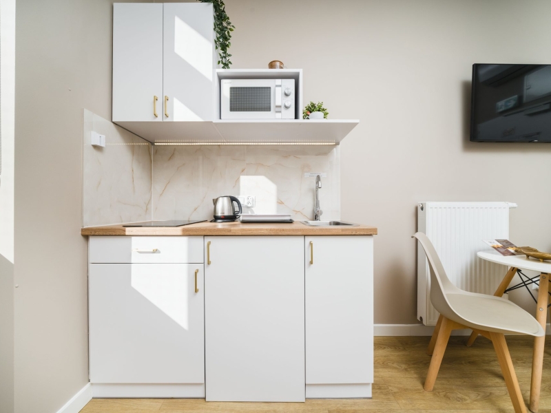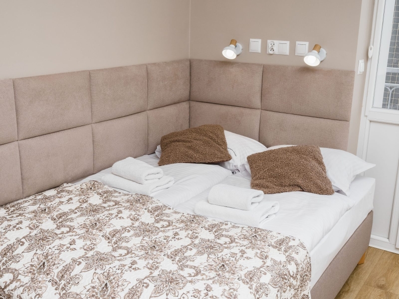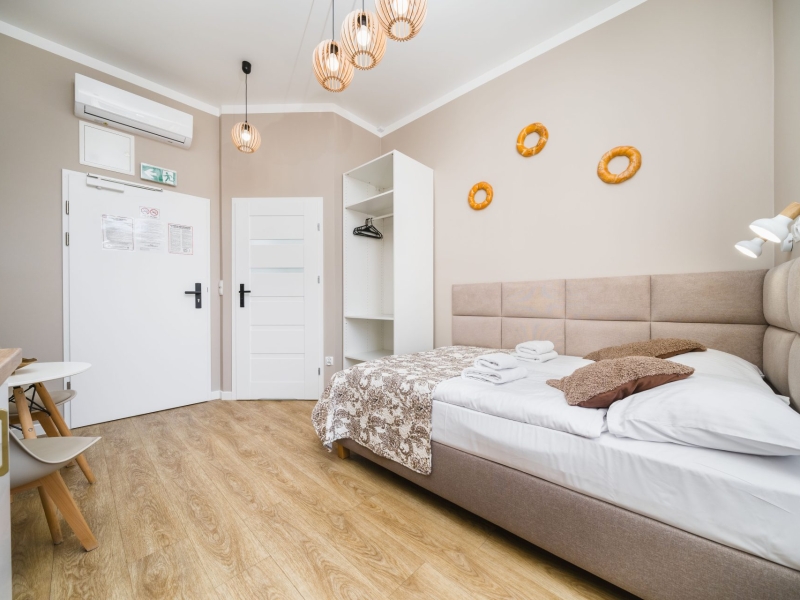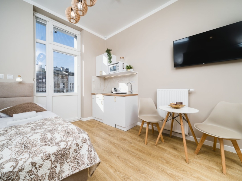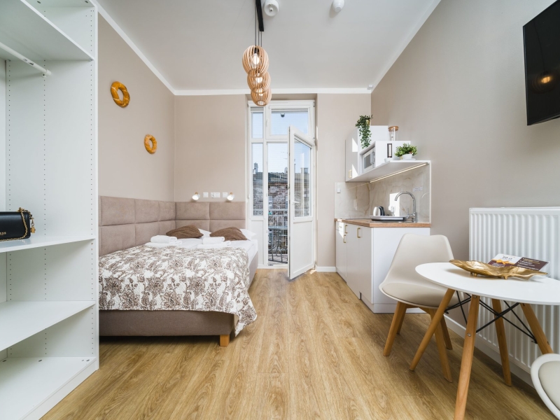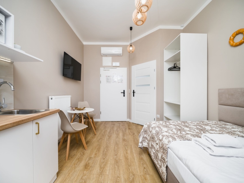 Przytulny apartament dwuosobowy o powierzchni 15m2 z balkonem wychodzącym na dziedziniec. Komfortowe studio wyposażone jest w wygodne łóżko podwójne, stolik z krzesłami oraz szafę. W prywatnej łazience z prysznicem jest suszarka do włosów. W aneksie kuchennym znajduje się : lodówka, płyta indukcyjna, czajnik, mikrofala oraz wszelkie niezbędne naczynia. Do dyspozycji gości klimatyzacja, TV, pościel i ręczniki, bezpłatne Wi-Fi, żelazko i deska do prasowania. Dodatkowo w obiekcie znajduje się pralka i suszarka do ubrań.