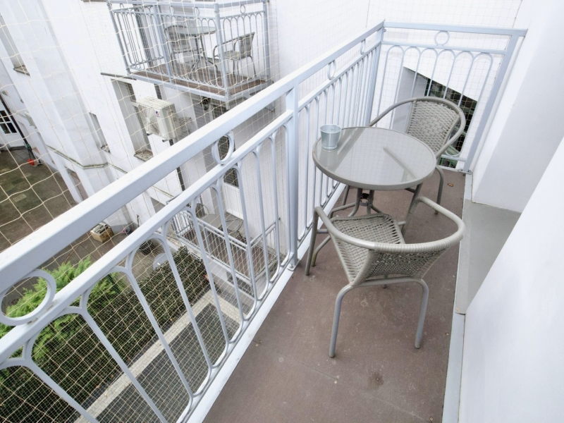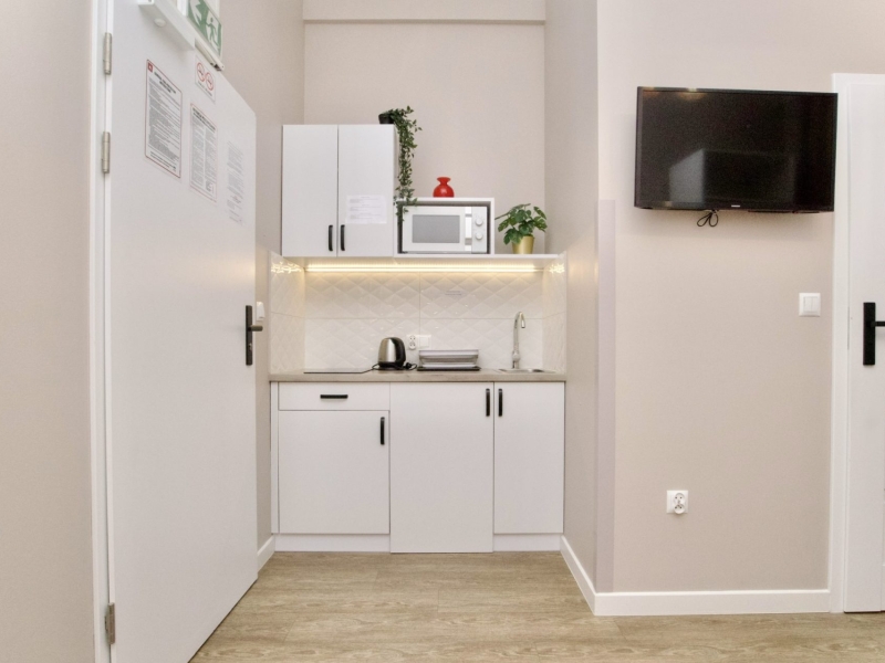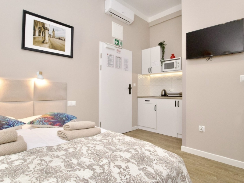 Klimatyzowany apartament dwuosobowy o powierzchni 15m2 z balkonem wychodzącym na dziedziniec. Przytulne studio wyposażone jest w łóżko podwójne, stolik z krzesłami oraz szafę. Prywatna łazienka z prysznicem wzbogacona jest w suszarkę do włosów. W aneksie kuchennym znajduje się: lodówka, płyta indukcyjna, czajnik, mikrofala oraz wszelkie niezbędne naczynia. Do dyspozycji gości jest również klimatyzacja, TV, pościel i ręczniki, bezpłatne Wi-Fi, żelazko i deska do prasowania. Dodatkowo w obiekcie znajduje się pralka i suszarka do ubrań.