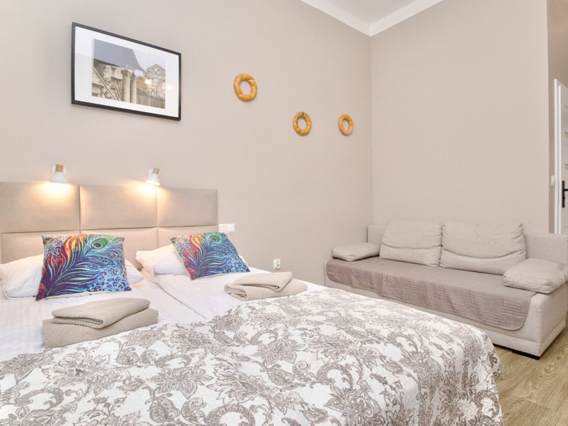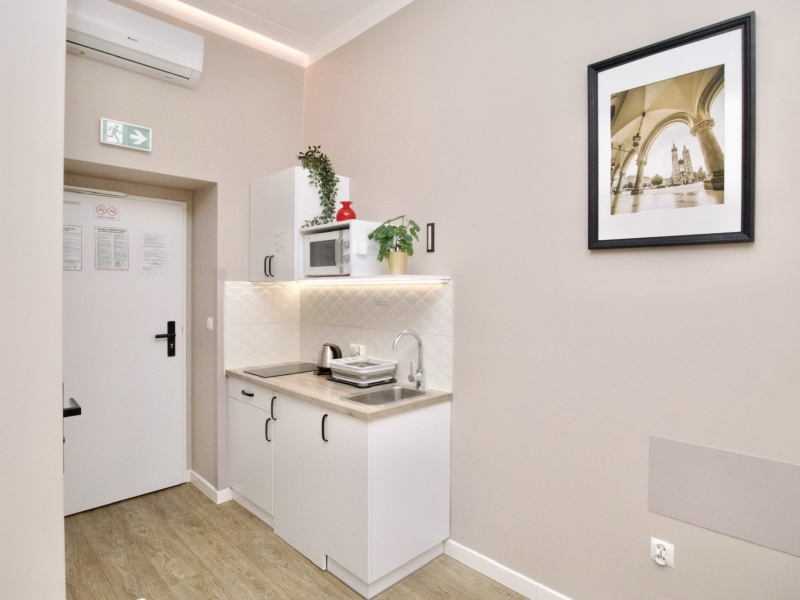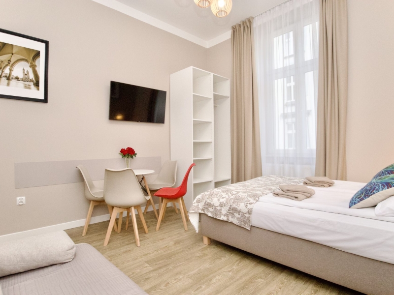 Przytulny czteroosobowy apartament typu studio o powierzchni 19m² z widokiem na ulice Kordeckiego. Cichy komfortowy pokój wyposażony jest w wygodne dwuosobowe łóżko, jednoosobową sofę, stolik z krzesłami, szafę, klimatyzację, TV, suszarkę do włosów, pościel, oraz prywatną łazienkę z prysznicem. W aneksie kuchennym znajduje się: lodówka, płyta indukcyjna, czajnik, mikrofala oraz wszelkie niezbędne naczynia. Do dyspozycji gości jest bezpłatne Wi-Fi, żelazko i deska do prasowania oraz pralka i suszarka.