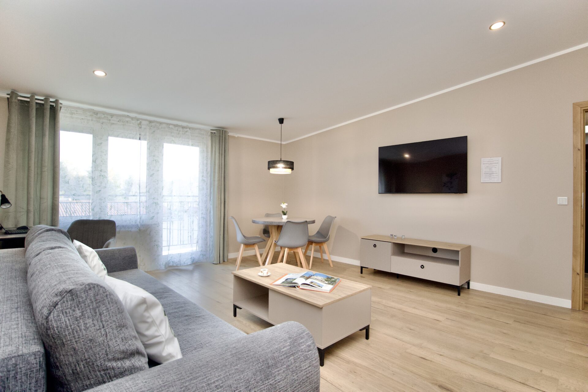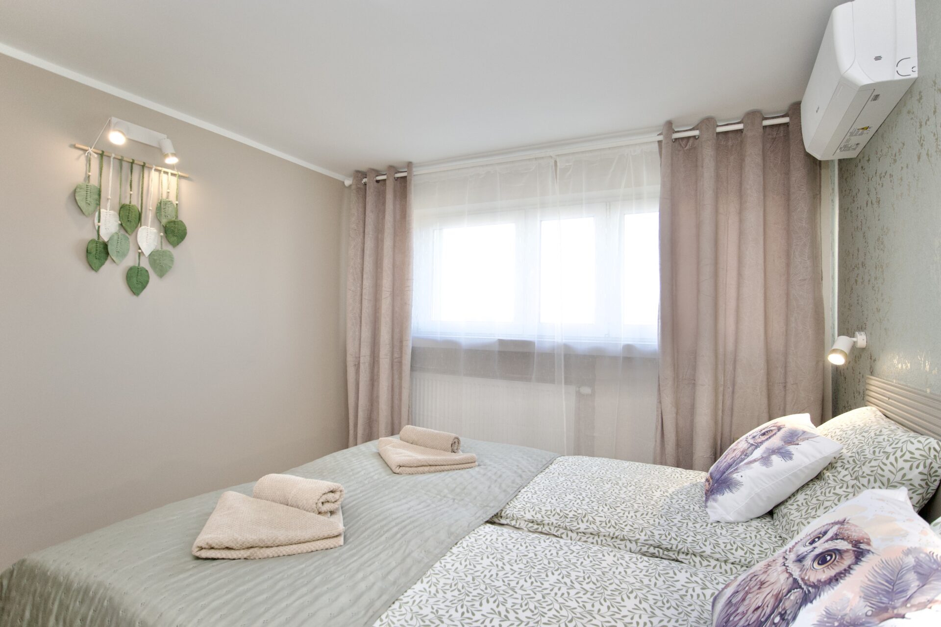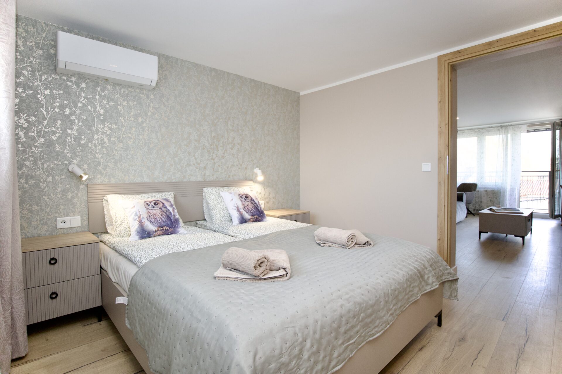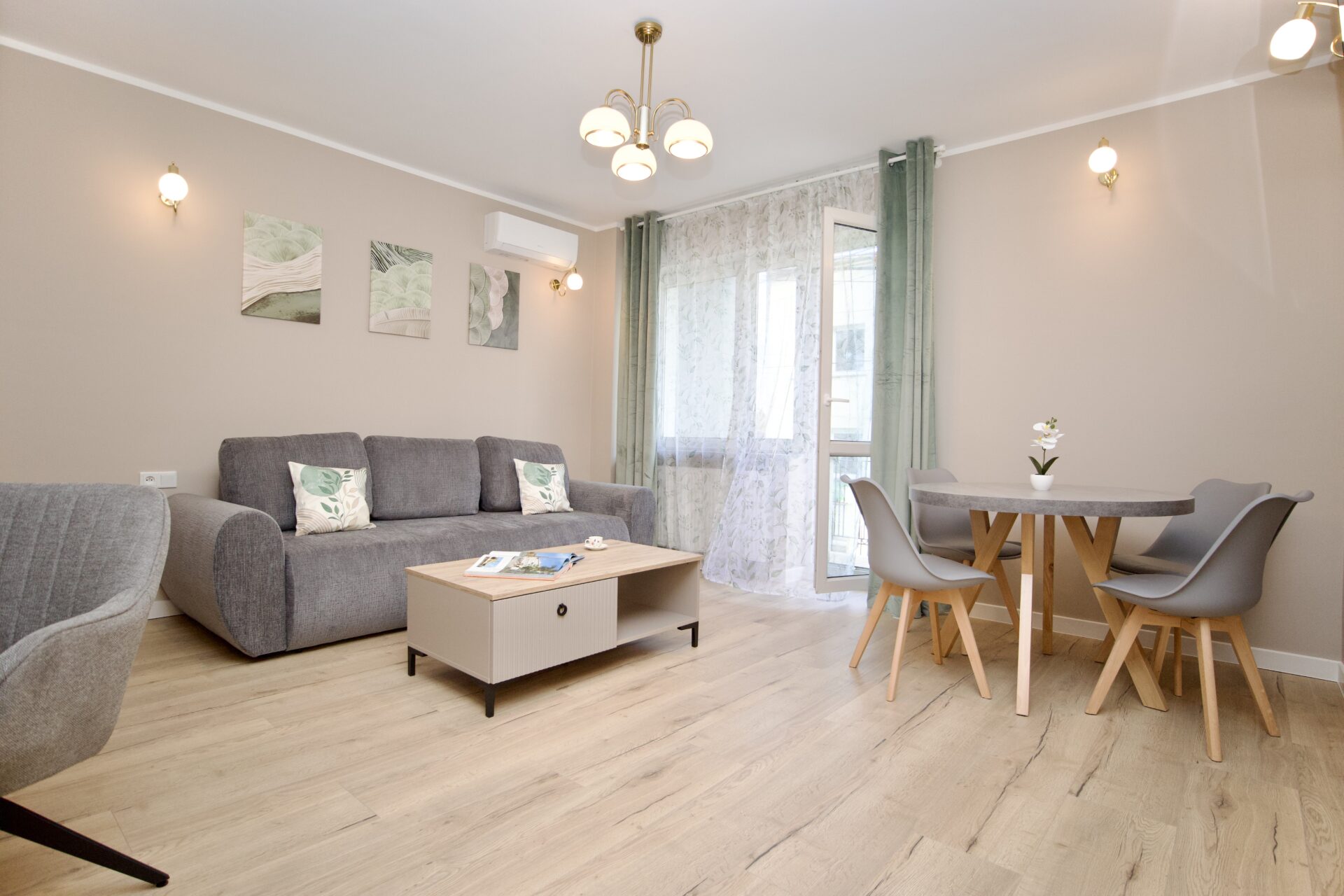Klimatyzowany apartament z przestronnym salonem, osobną sypialnią, łazienką i kuchnią. Apartament znajduje się na III piętrze i posiada wszystkie niezbędne udogodnienia takie jak zmywarka, pralka, lodówka, naczynia i sztućce. Do apartamentu przynależy bezpłatne miejsce parkingowe oraz balkon.