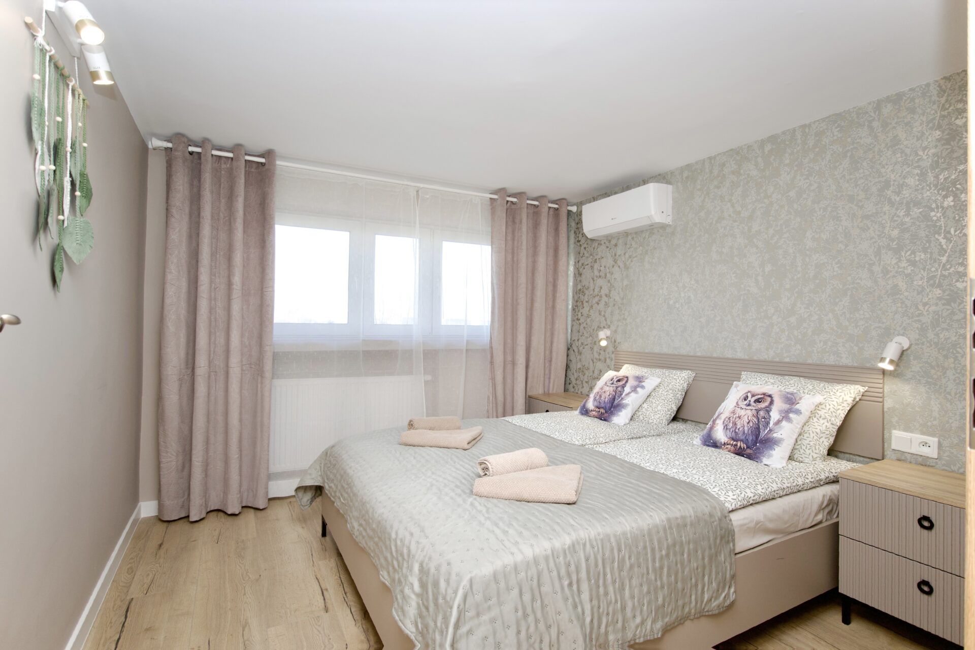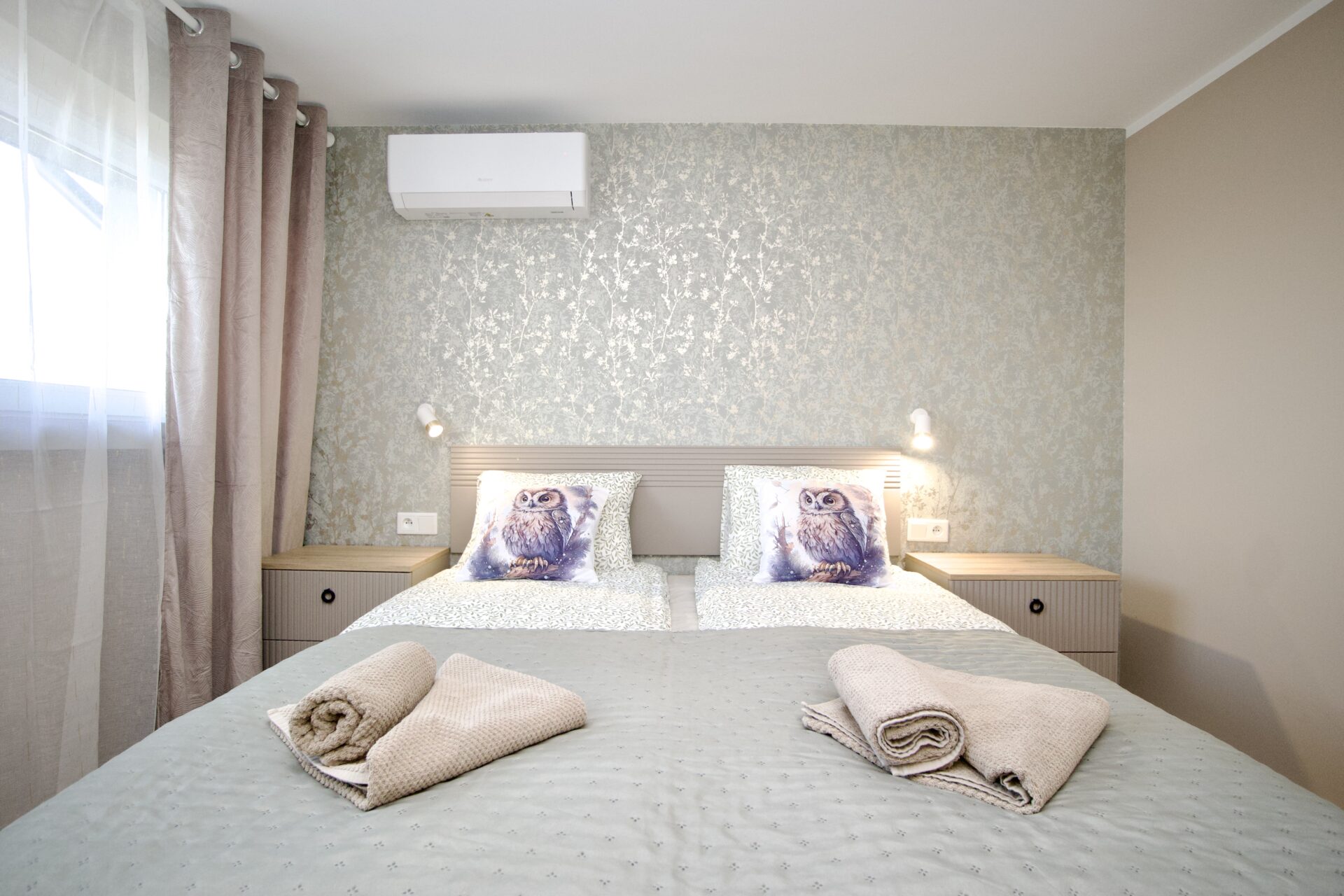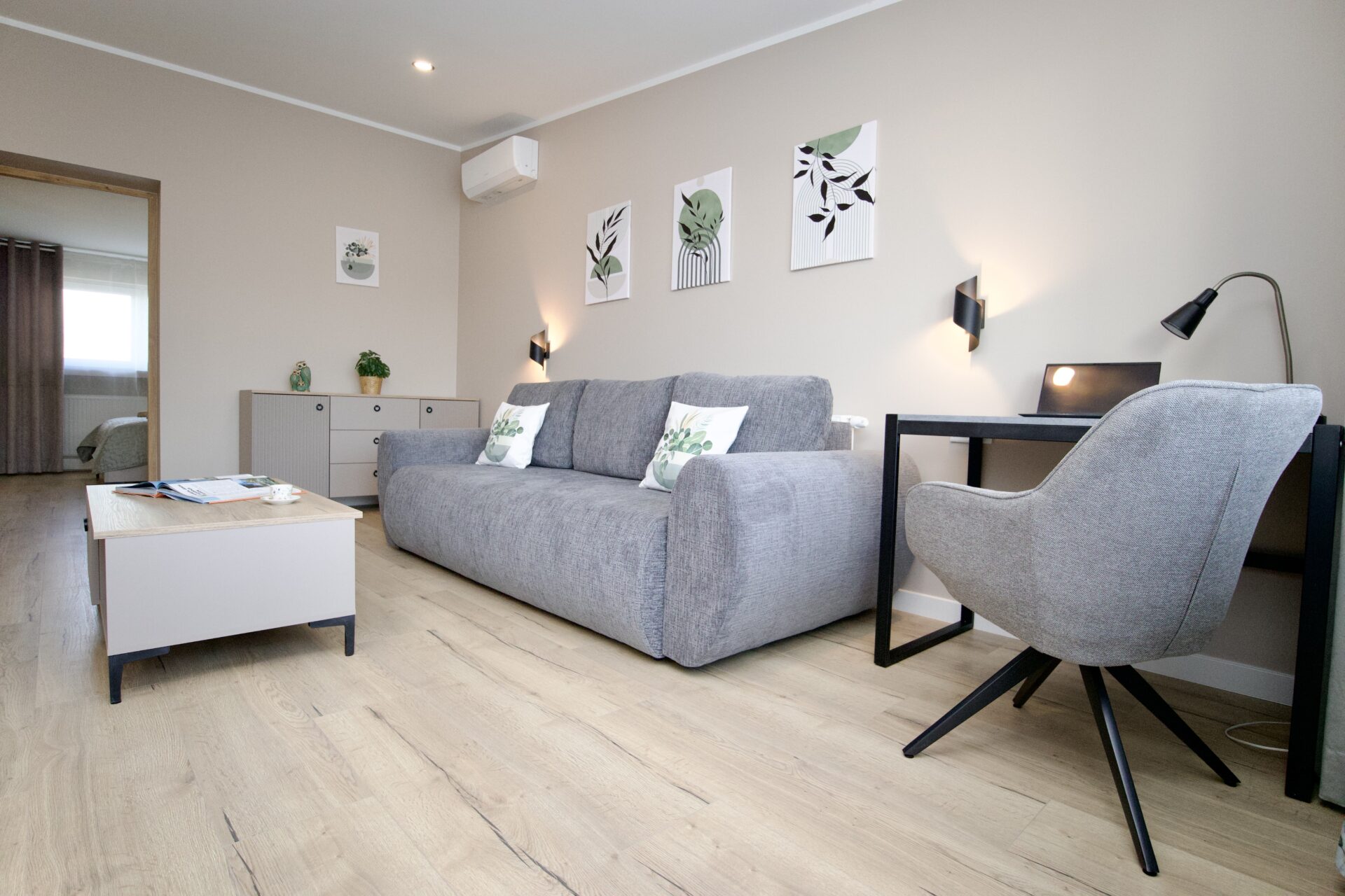 Klimatyzowany apartament z przestronnym salonem, osobną sypialnią, łazienką i kuchnią. Apartament znajduje się na III piętrze i posiada wszystkie niezbędne udogodnienia takie jak zmywarka, pralka, lodówka, naczynia i sztućce. Do apartamentu przynależy bezpłatne miejsce parkingowe oraz balkon.