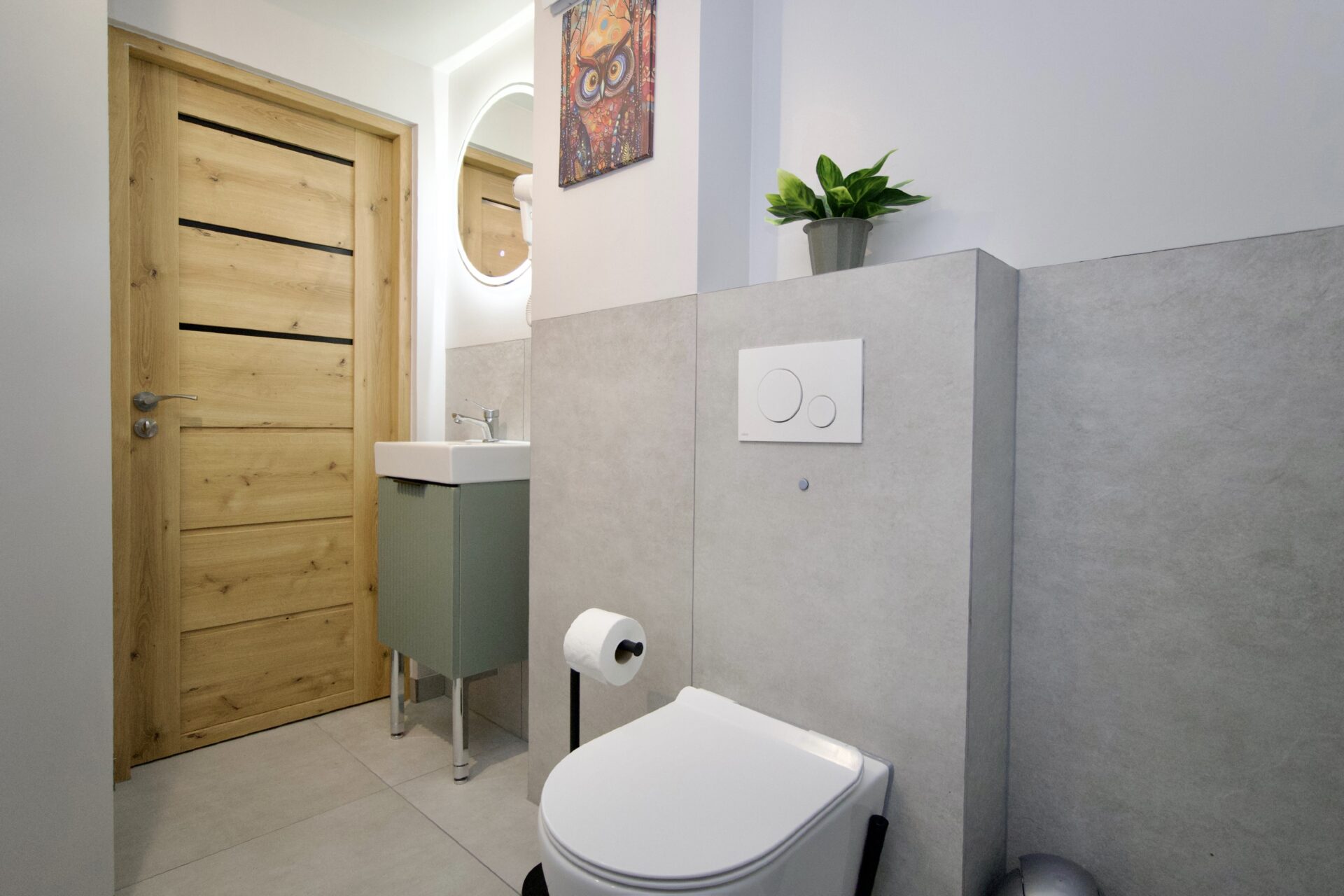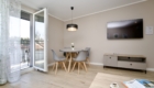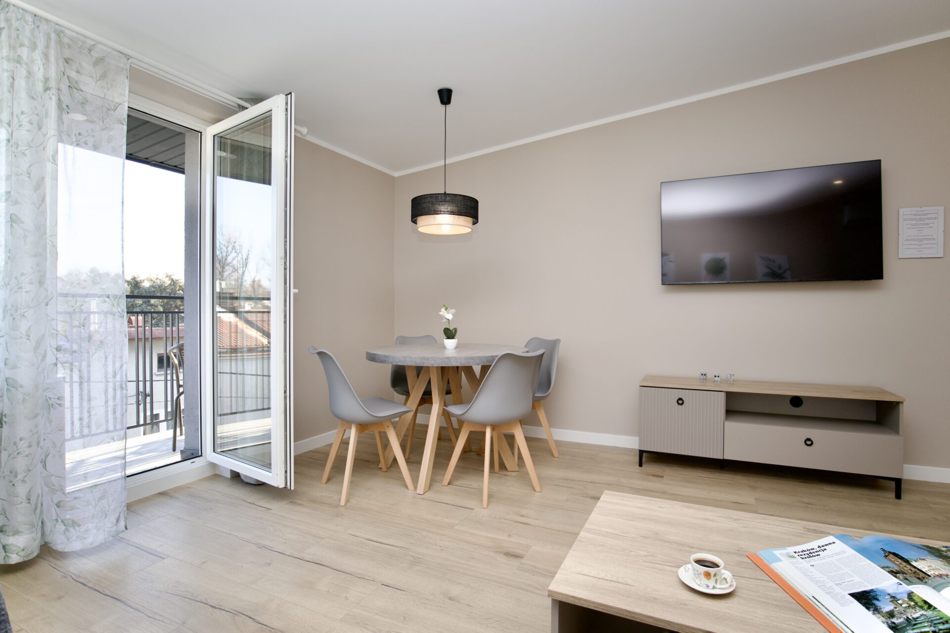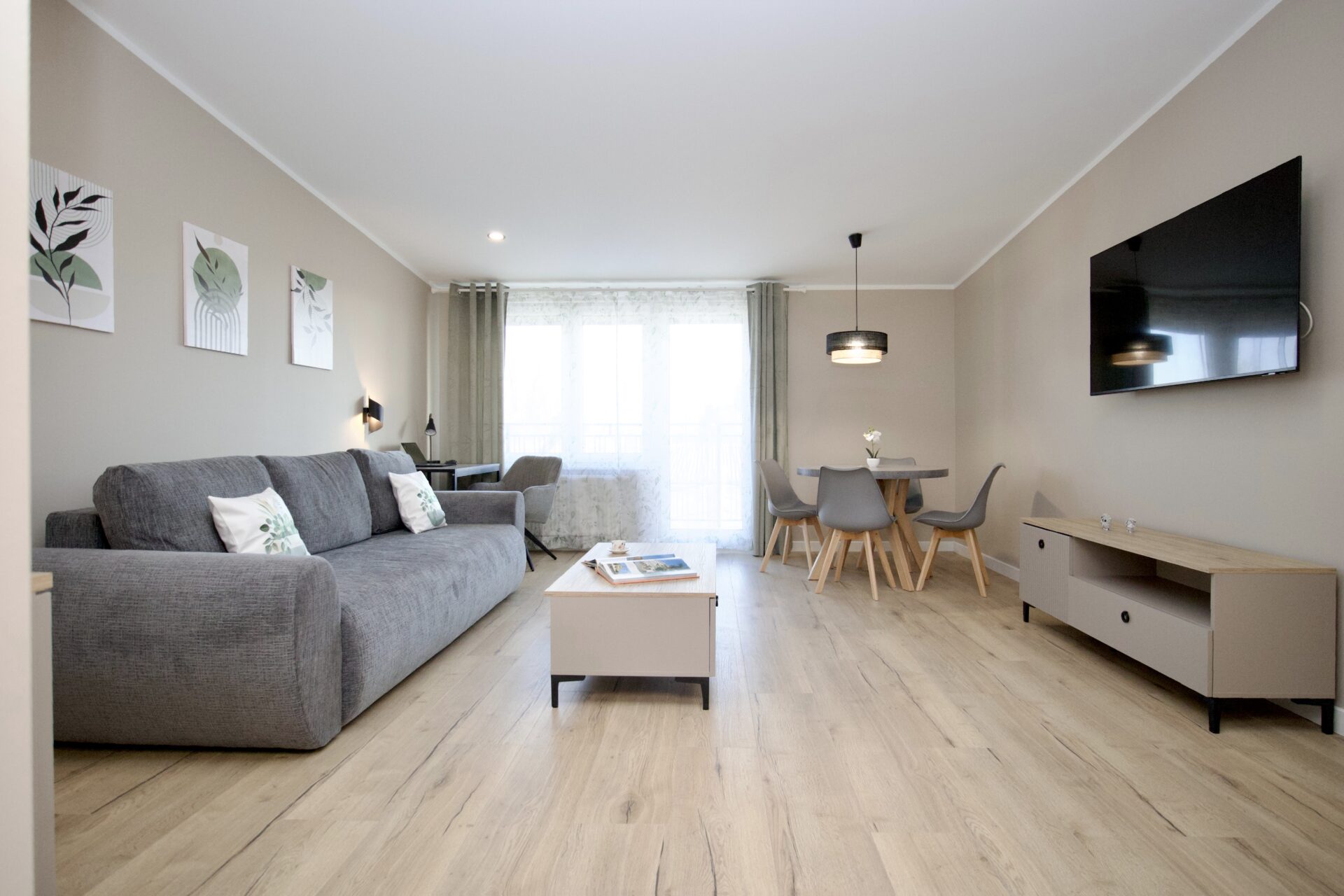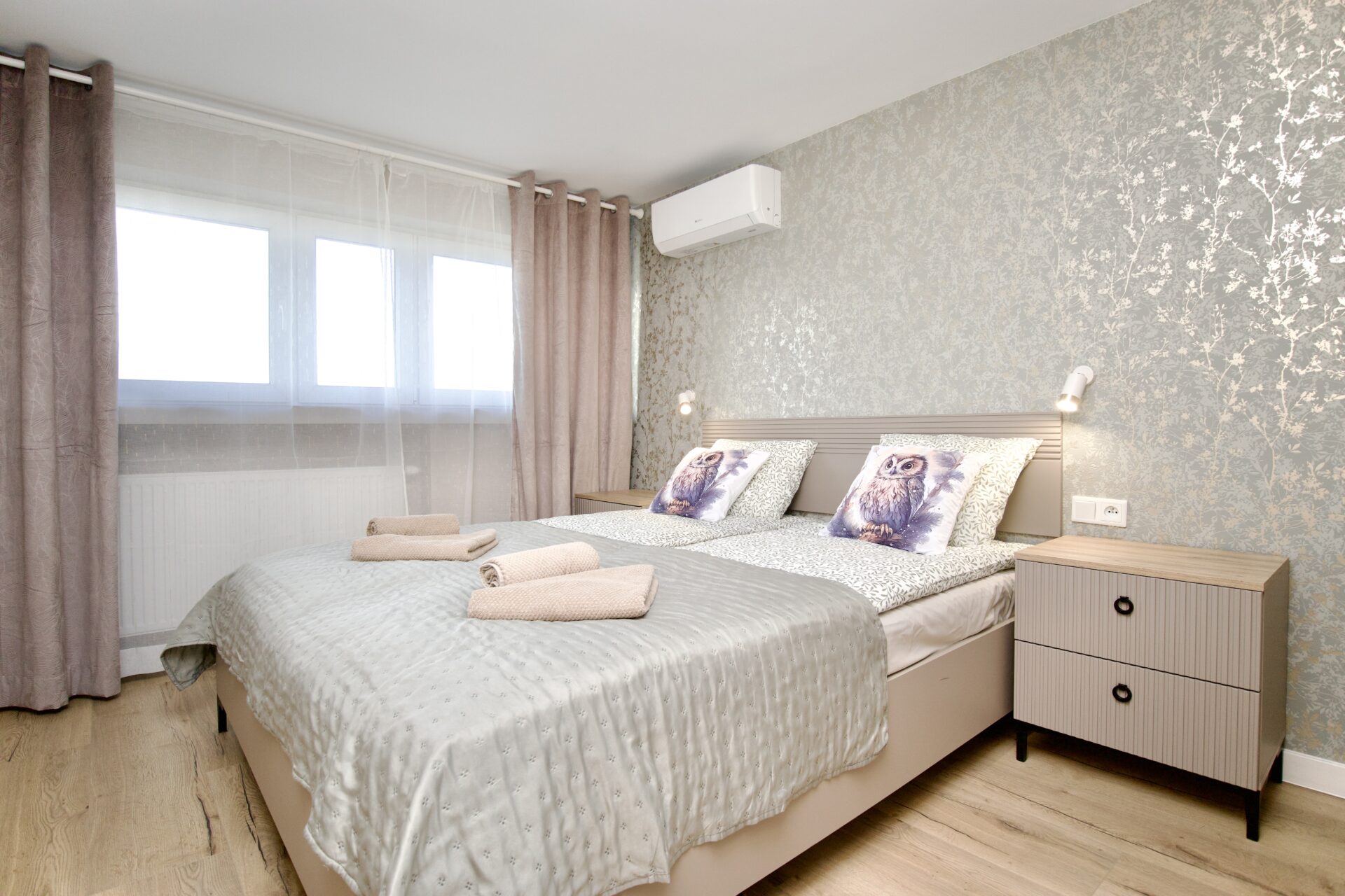 Klimatyzowany apartament z przestronnym salonem, osobną sypialnią, łazienką i kuchnią. Apartament znajduje się na III piętrze i posiada wszystkie niezbędne udogodnienia takie jak zmywarka, pralka, lodówka, naczynia i sztućce. Do apartamentu przynależy bezpłatne miejsce parkingowe oraz balkon.