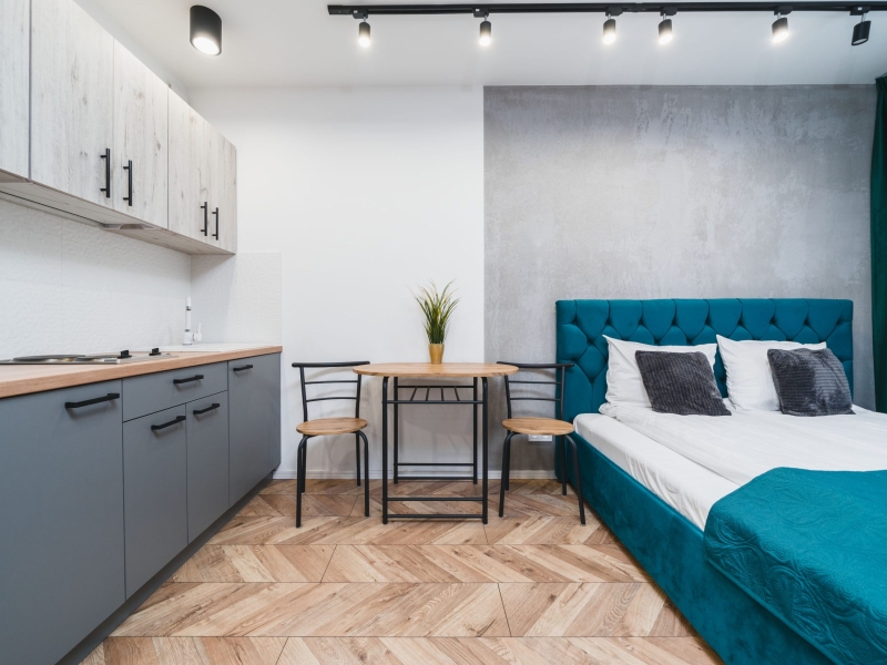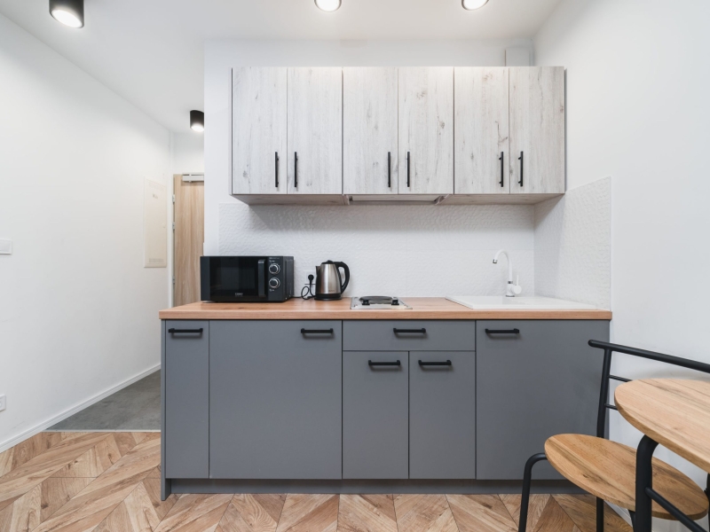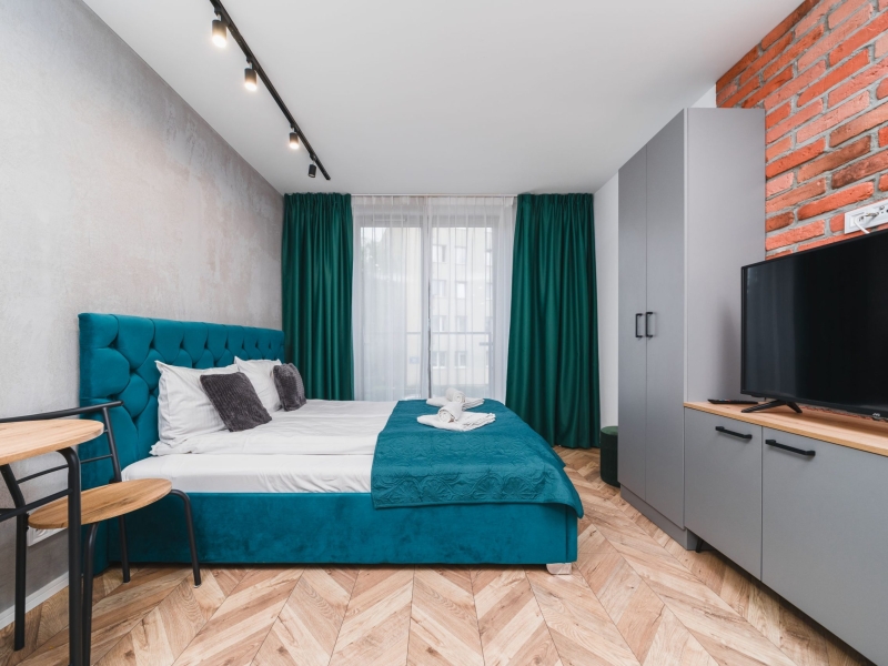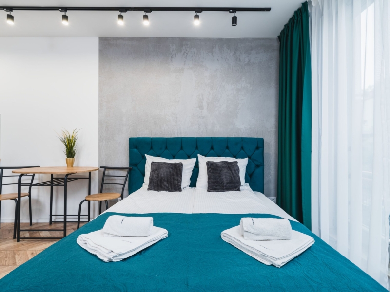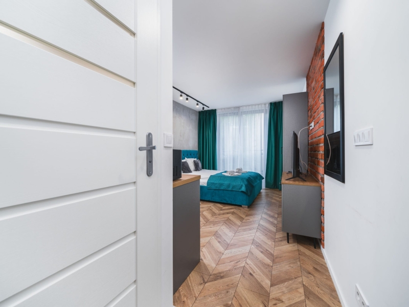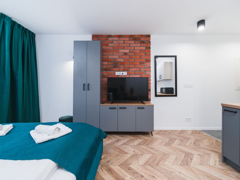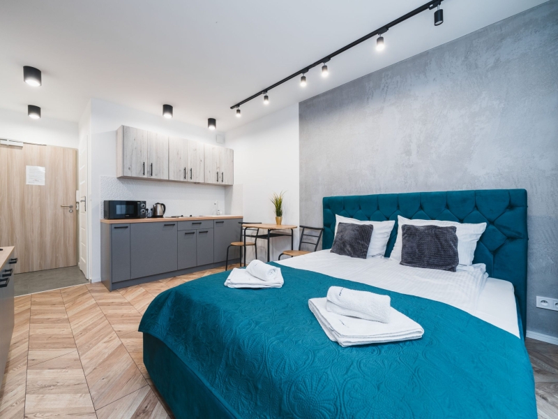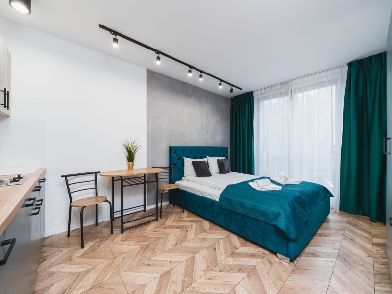 Dwuosobowy apartament typu studio o powierzchni 16m² na 1 piętrze, z widokiem na ulice. Cichy pokój wyposażony jest w podwójne łóżko, stolik z krzesłami, TV, suszarkę do włosów, pościel, ręczniki, mydło oraz prywatną łazienkę z prysznicem. W skład aneksu kuchennego znajdującego się w mieszkaniu wchodzi: lodówka, płyta indukcyjna, czajnik, mikrofala oraz wszelkie niezbędne naczynia.  Do dyspozycji gości jest bezpłatne Wi-Fi, żelazko i deska do prasowania oraz wspólna pralnia.