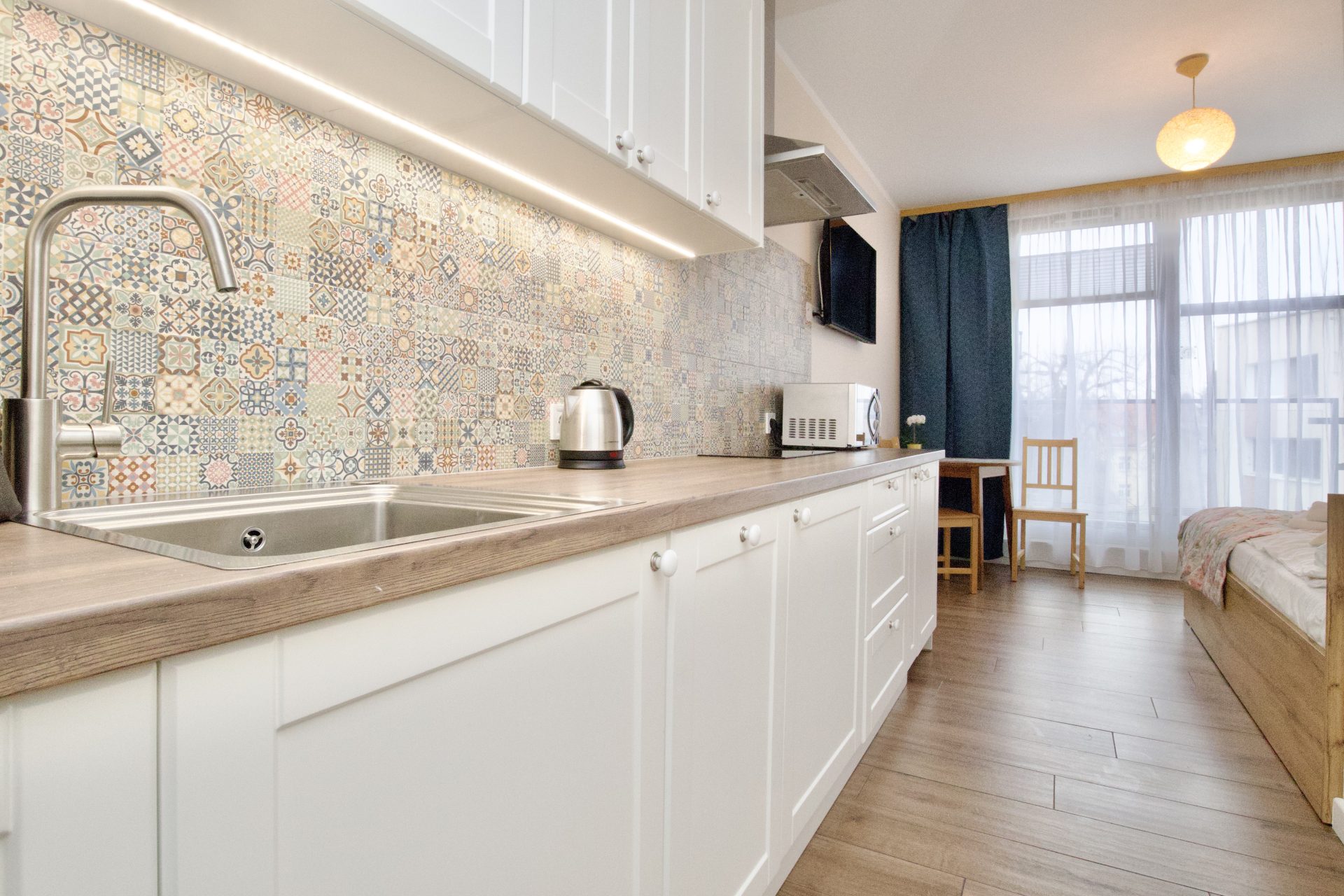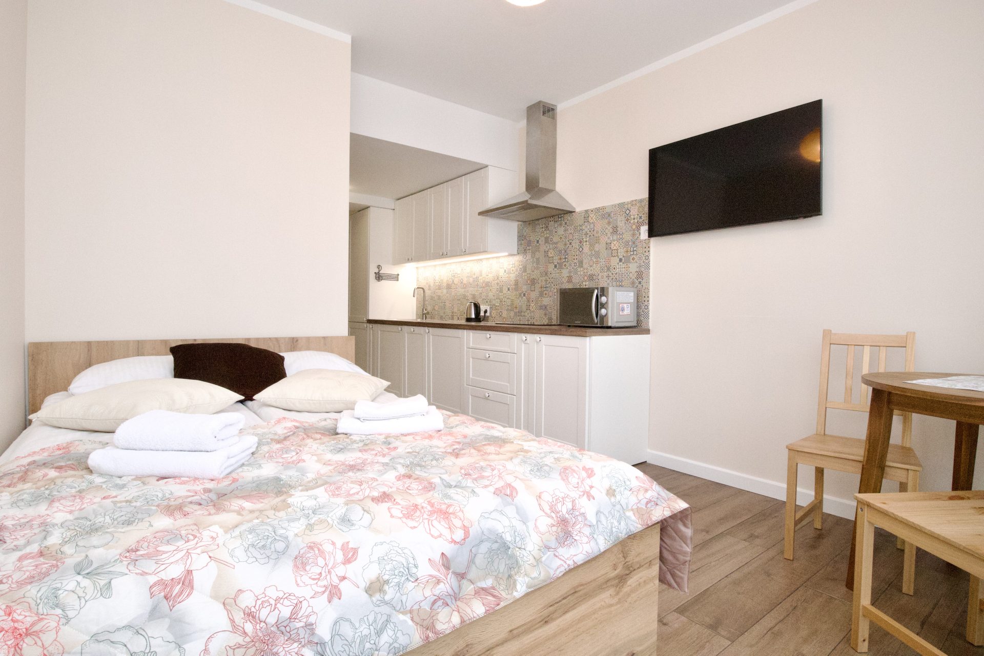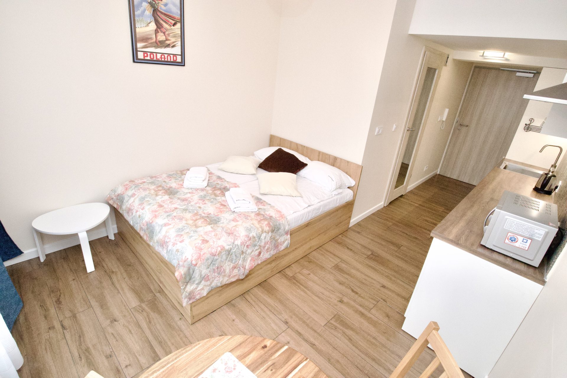 Dwuosobowy apartament typu studio z prywatną łazienką. Apartament znajduje się na 4 piętrze budynku z windą. Wewnątrz znajduje się aneks kuchenny, wyposażony w zmywarkę, mikrofalówkę, płytę indukcyjną, lodówkę i niezbędne przybory do przygotowania posiłku. W łazience jest prysznic i pralka. W pokoju podwójne łóżko, stół z krzesłami i telewizor.