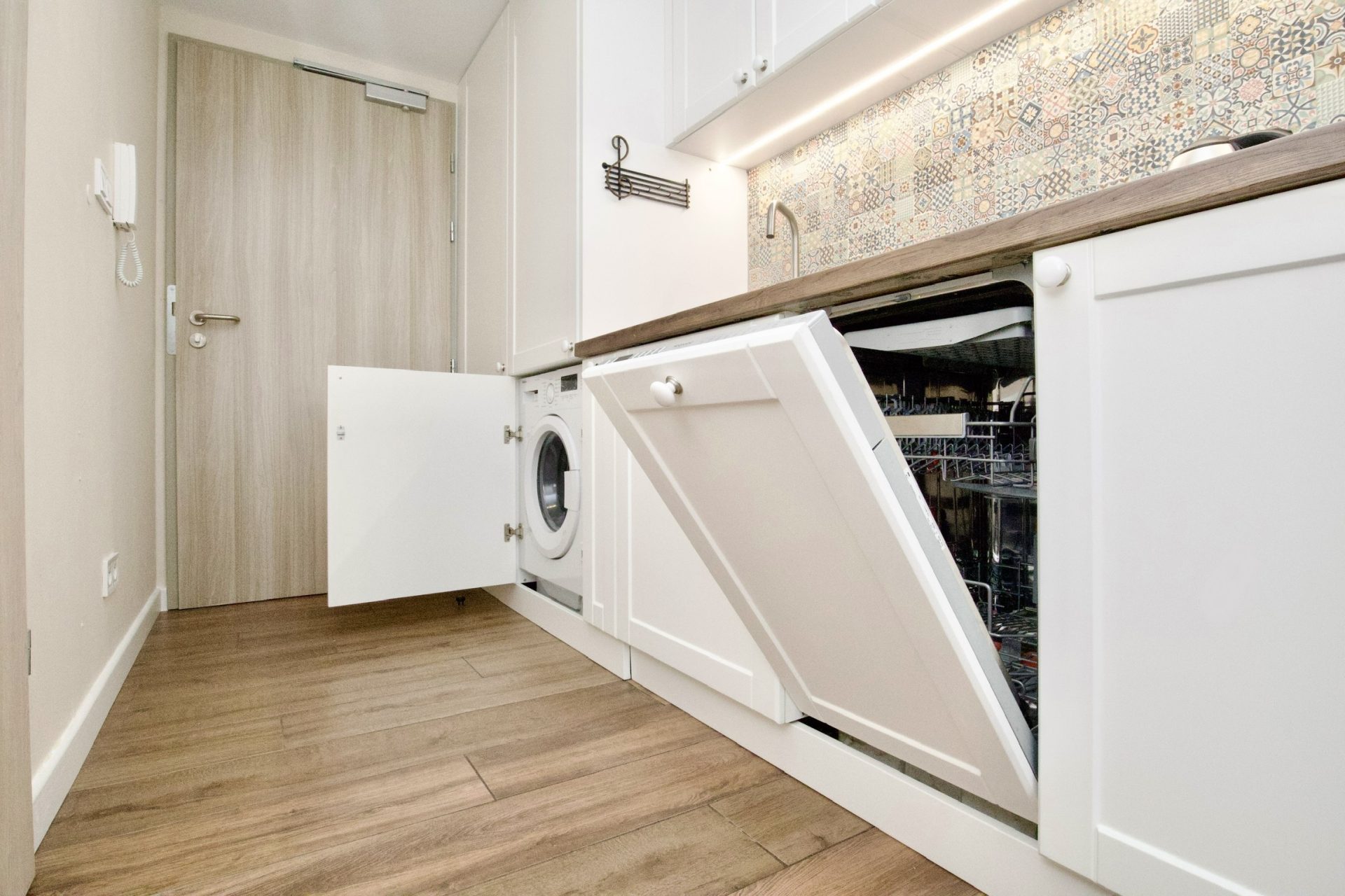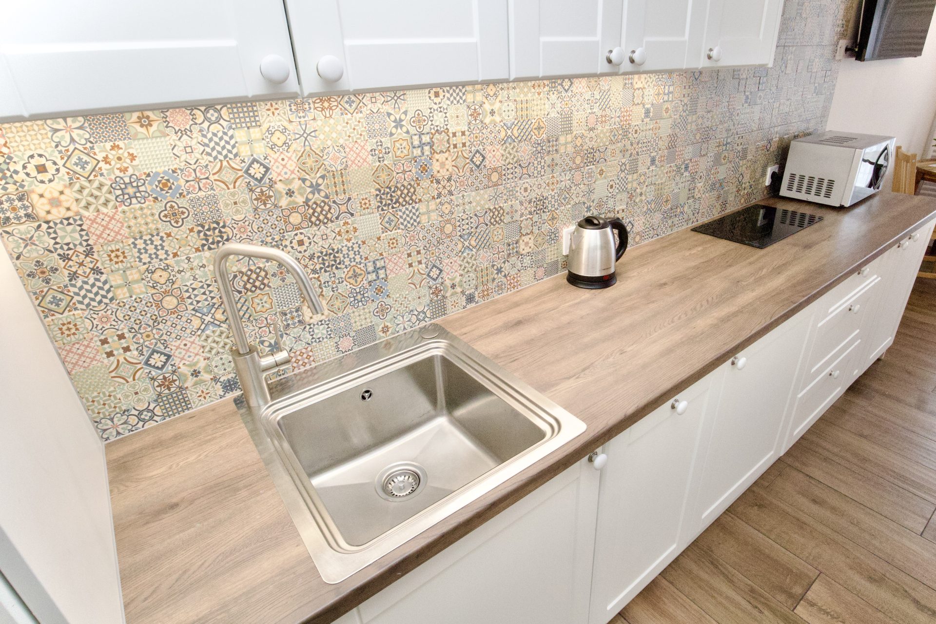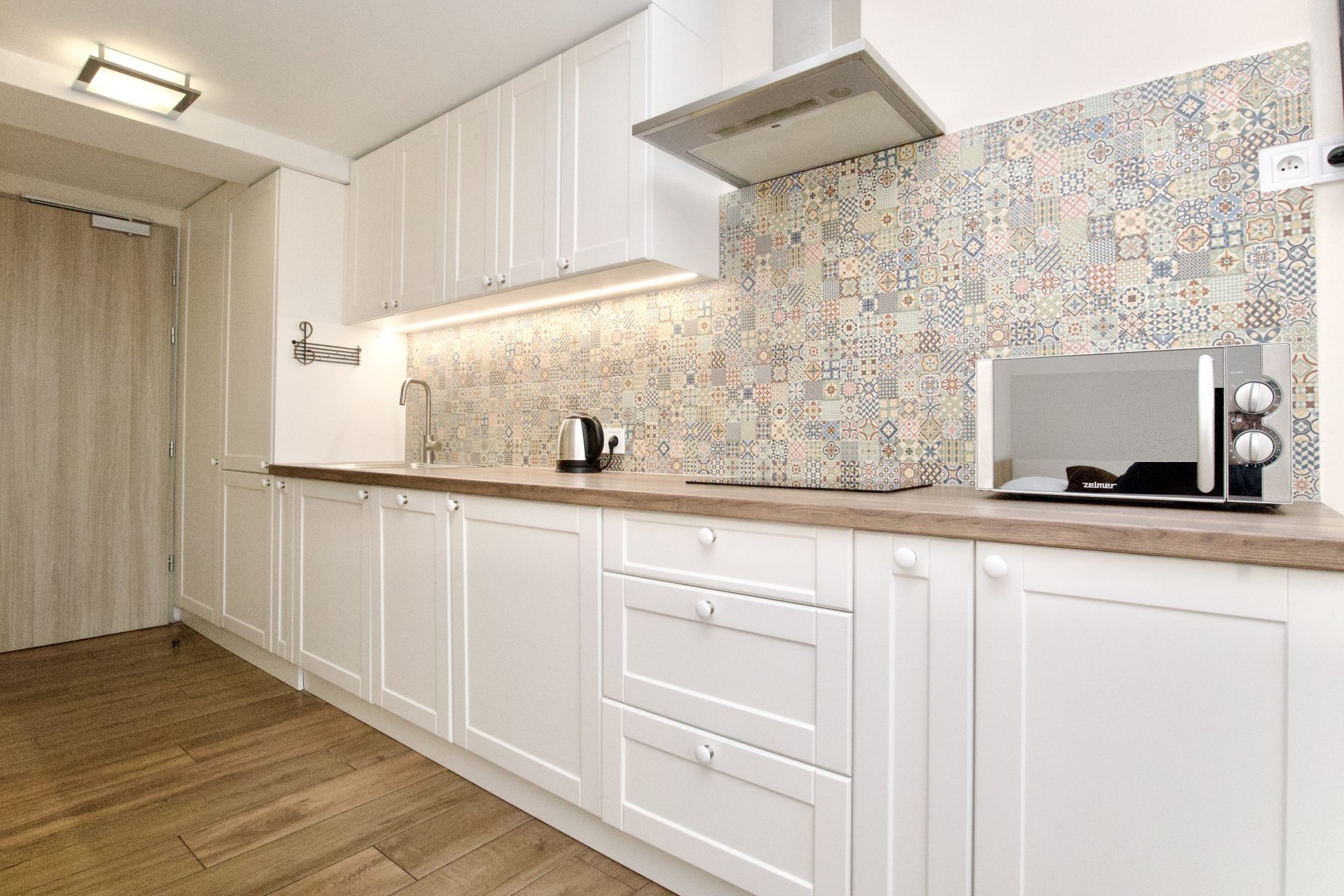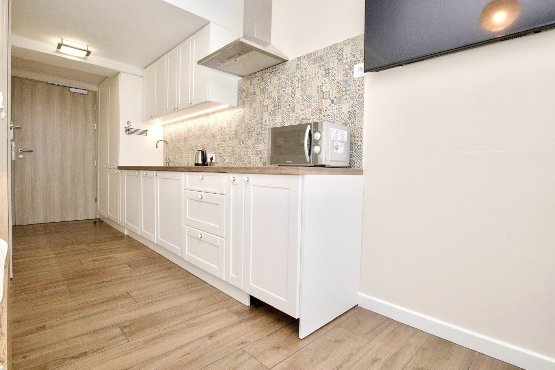 Dwuosobowy apartament typu studio z prywatną łazienką. Apartament znajduje się na 4 piętrze budynku z windą. Wewnątrz znajduje się aneks kuchenny, wyposażony w zmywarkę, mikrofalówkę, płytę indukcyjną, lodówkę i niezbędne przybory do przygotowania posiłku. W łazience jest prysznic i pralka. W pokoju podwójne łóżko, stół z krzesłami i telewizor.