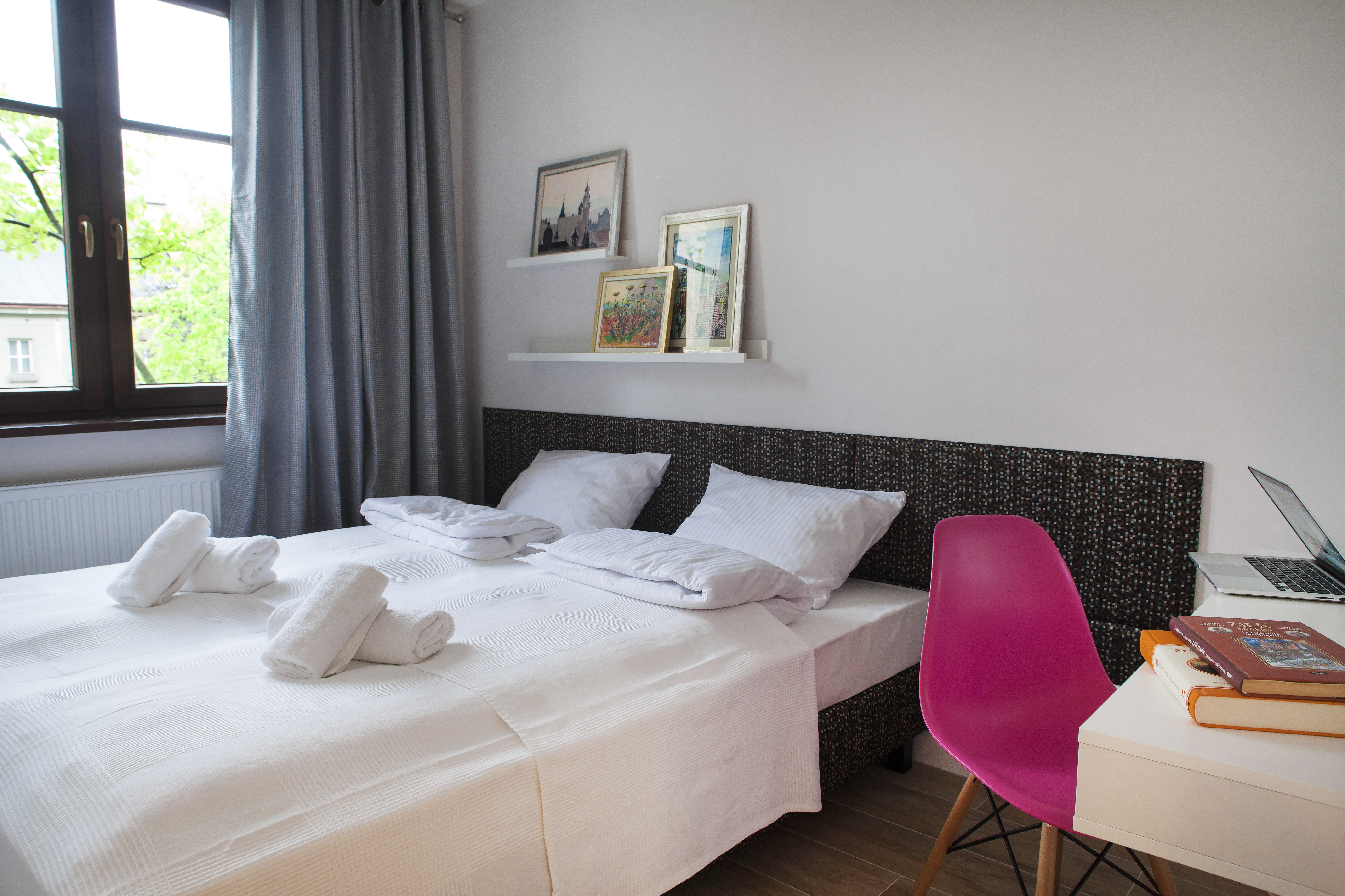 Apartament czteroosobowy o powierzchni 35 m2 na II piętrze w budynku z windą, składający się z salonu z aneksem kuchennym i częścią jadalną, sypialni oraz łazienki. Mieszkanie wyposażone w stół z krzesłami, podwójne łóżko, podwójną sofę, pralkę, suszarkę do włosów, żelazko, Tv, Wi-Fi, w aneksie kuchennym znajdują się niezbędne sprzęty i naczynia. Zapewnione są pościele, ręczniki i mydło. Okna z mieszkania wychodzą na ulicę Krowoderską.