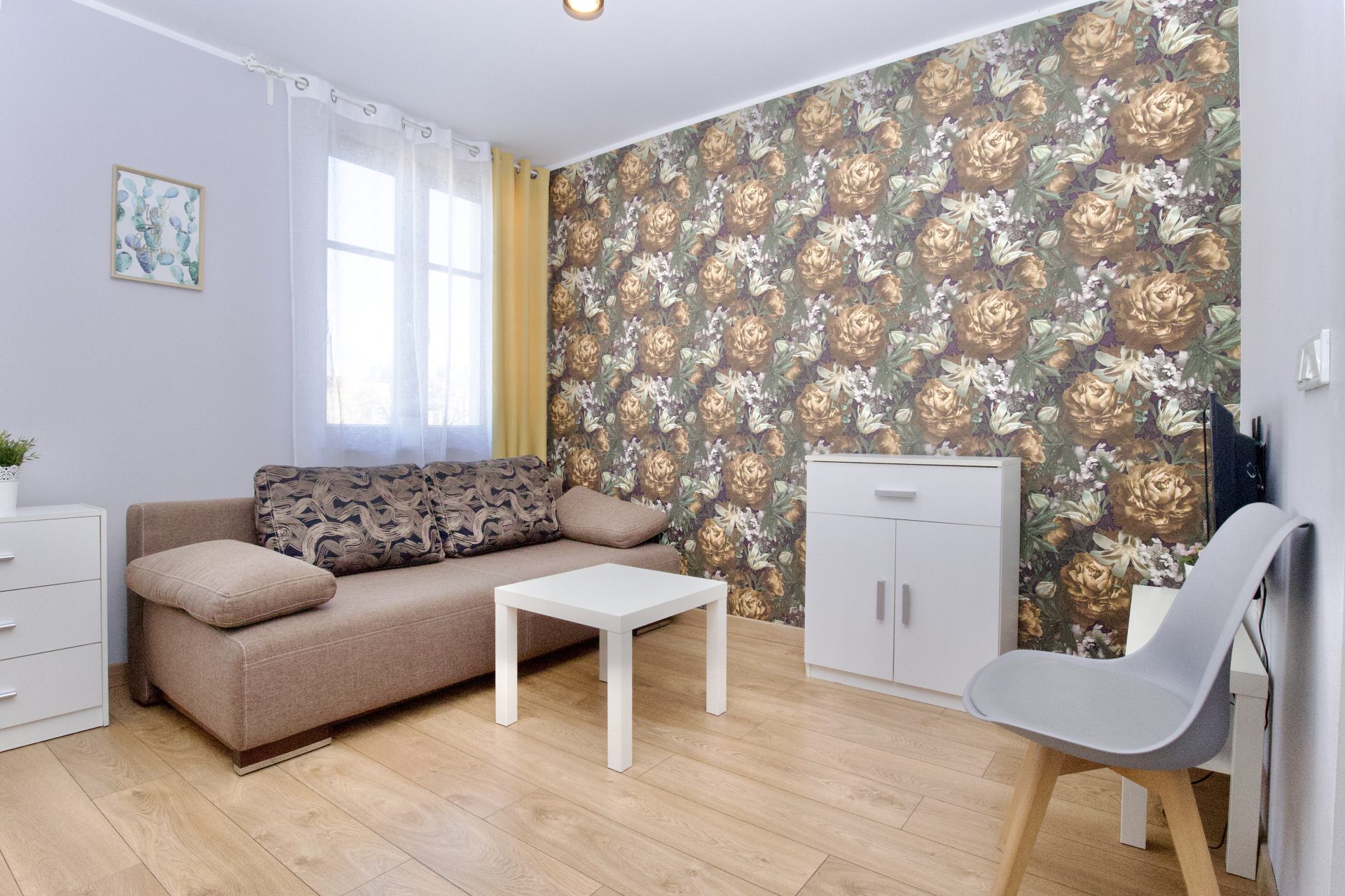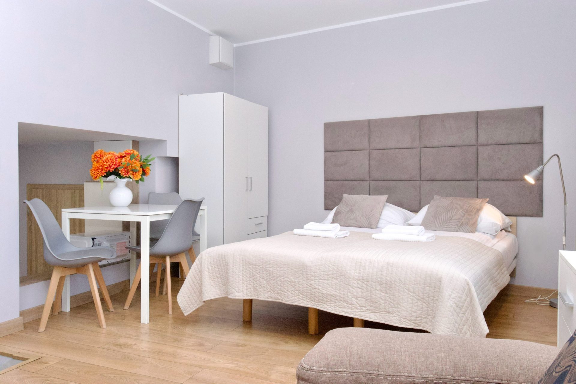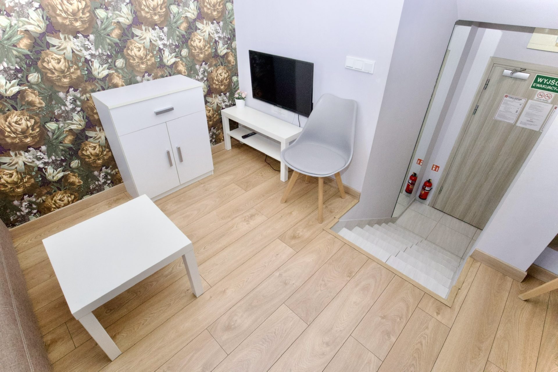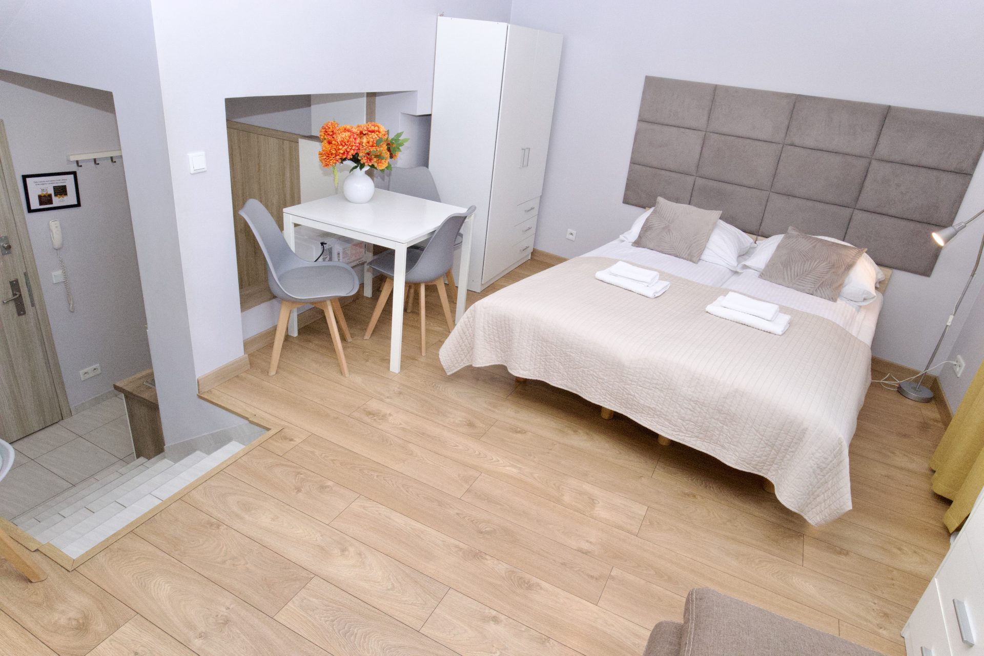 Apartament typu studio o powierzchni 27m2 położony na IV piętrze w budynku z windą. Kawalerka trzyosobowa składa się z dużego pokoju z łóżkiem podwójnym i sofą rozkładaną, w pełni wyposażonego aneksu kuchennego oraz łazienki. W apartamencie znajduje się również stolik z krzesłami, tv, bezpłatne Wi-Fi, suszarka do włosów, żelazko, pościel, ręczniki oraz mydło. Okna mieszkania wychodzą na ul. Krowoderską.