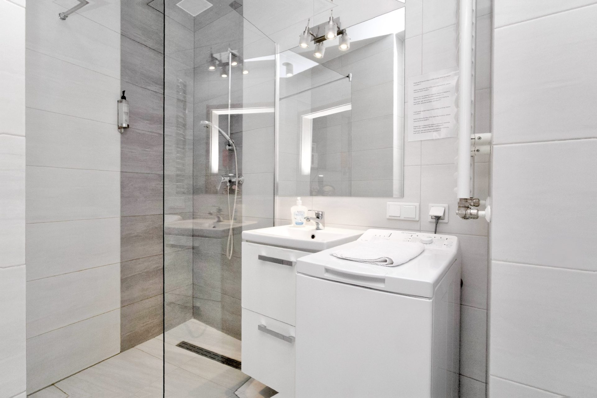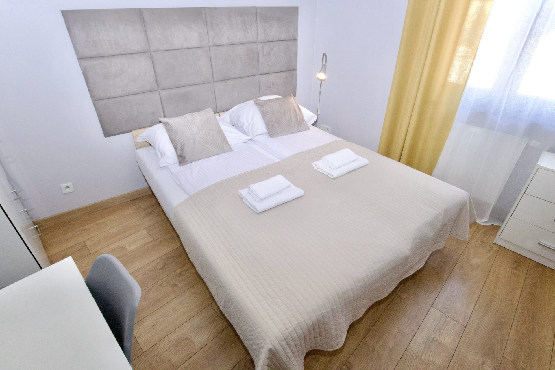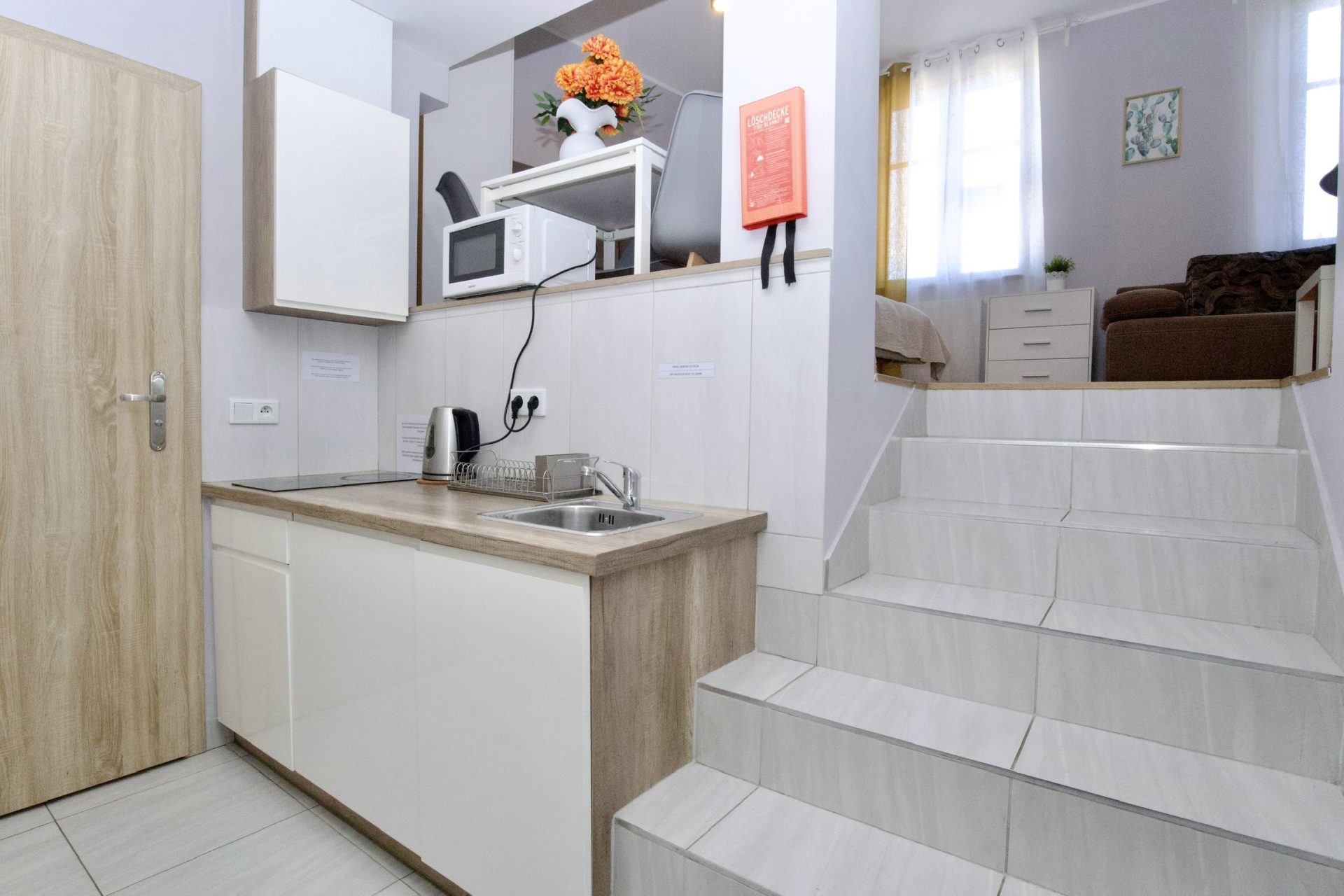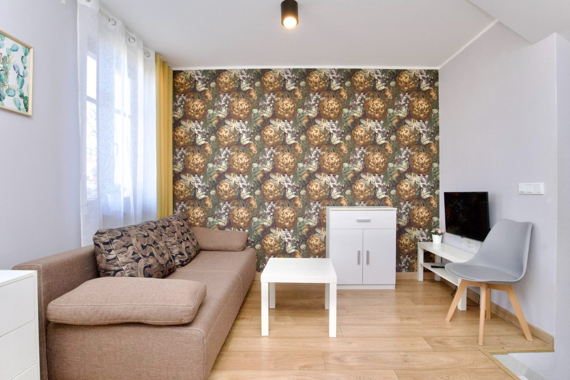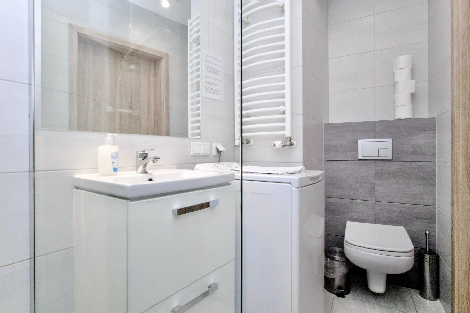 Apartament typu studio o powierzchni 27m2 położony na IV piętrze w budynku z windą. Kawalerka trzyosobowa składa się z dużego pokoju z łóżkiem podwójnym i sofą rozkładaną, w pełni wyposażonego aneksu kuchennego oraz łazienki. W apartamencie znajduje się również stolik z krzesłami, tv, bezpłatne Wi-Fi, suszarka do włosów, żelazko, pościel, ręczniki oraz mydło. Okna mieszkania wychodzą na ul. Krowoderską.