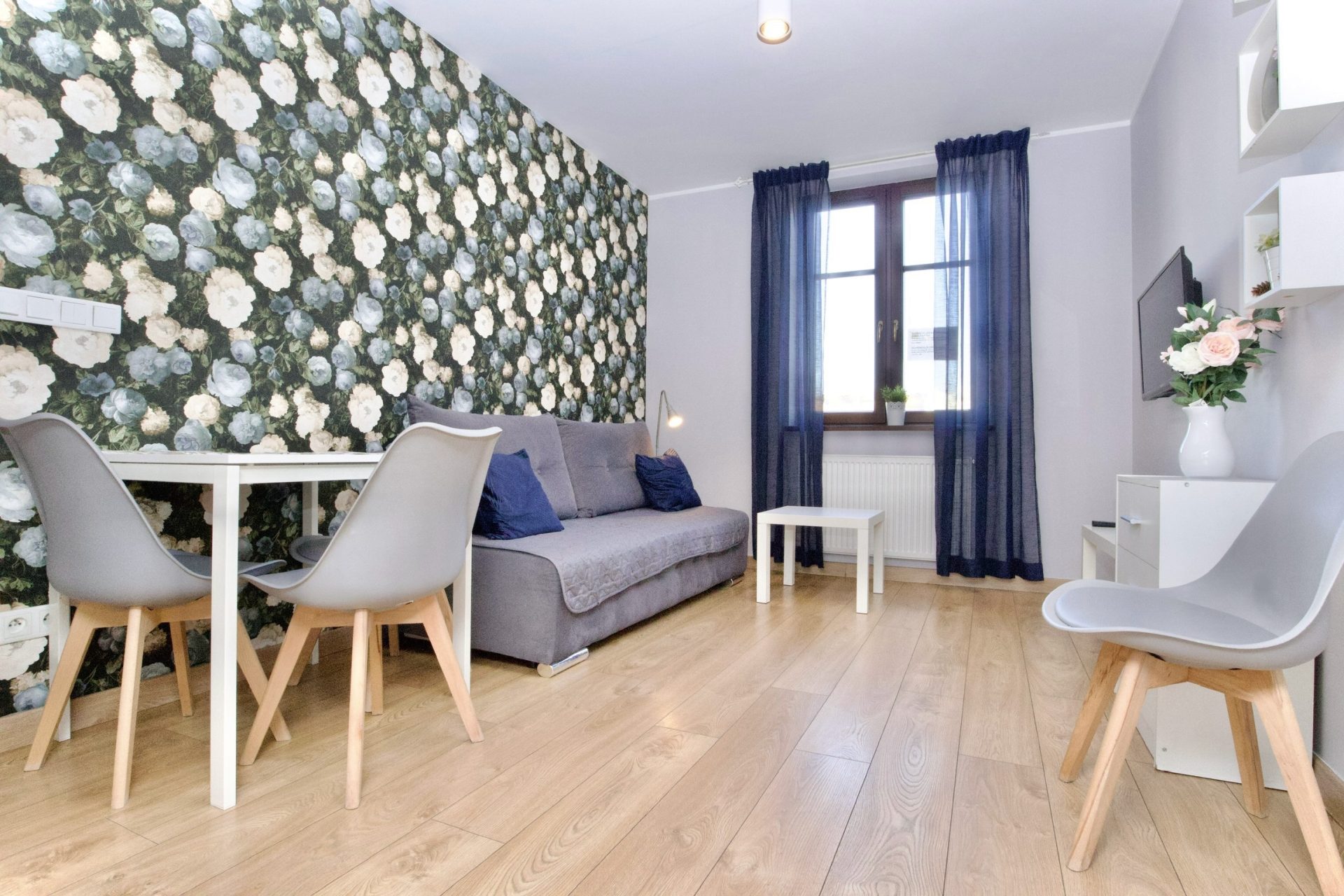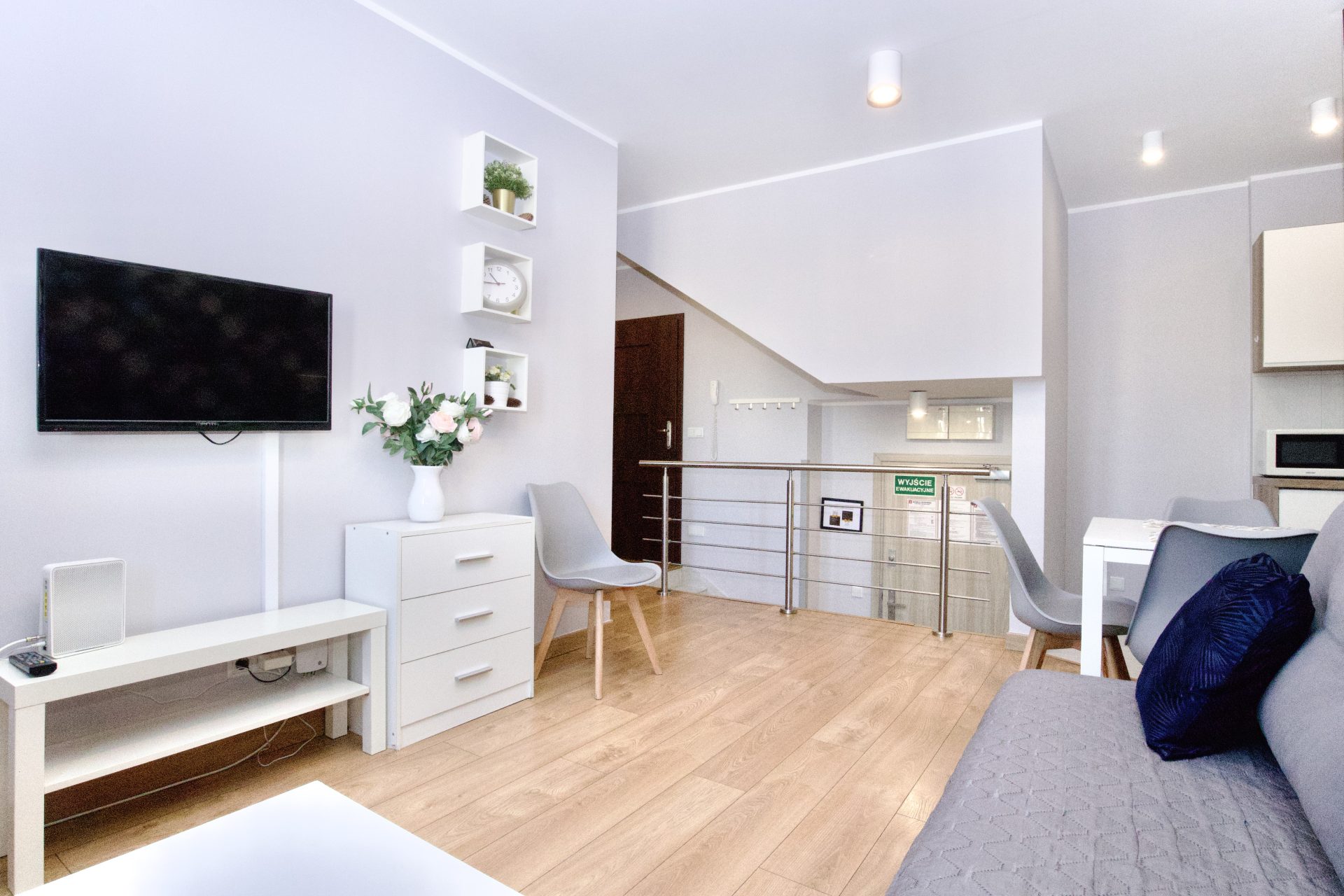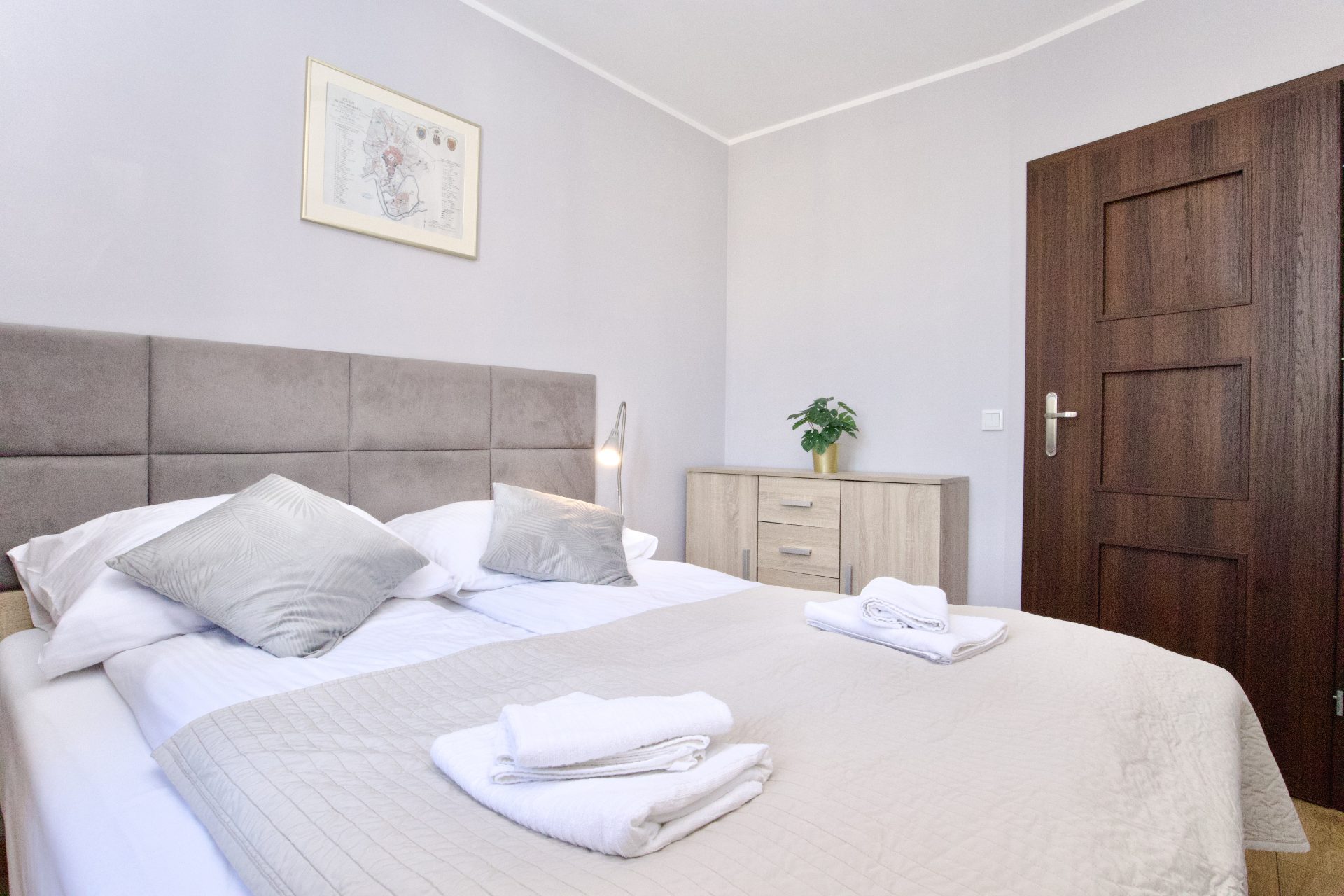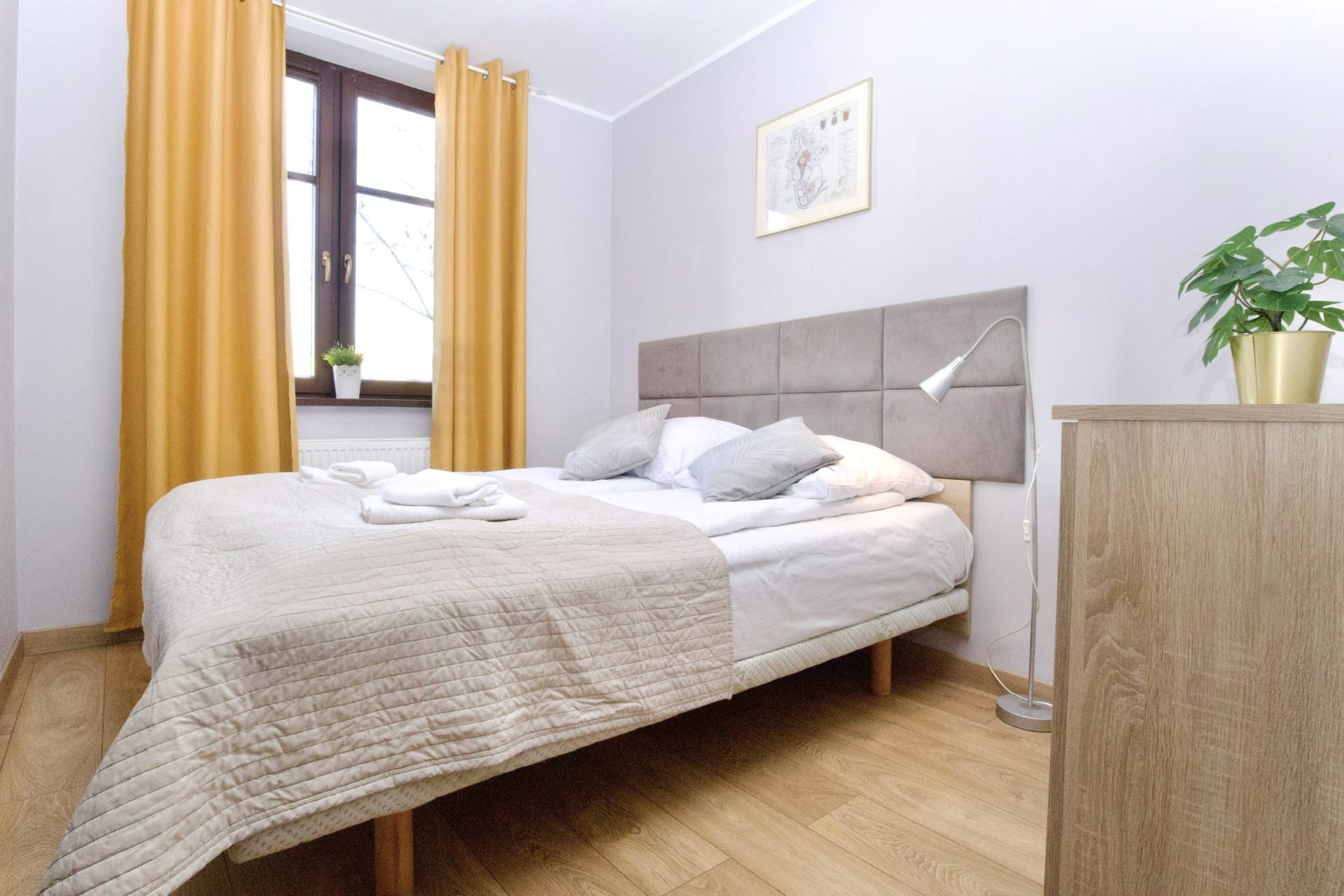 Apartament czteroosobowy o powierzchni 32m2 mieści się na IV piętrze w budynku z windą, Mieszkanie składa się z salonu z aneksem kuchennym i częścią jadalną, sypialni oraz łazienki. Wyposażone jest w stół z krzesłami, podwójne łóżko, podwójną sofę, suszarkę do włosów, żelazko, Tv, Wi-Fi, aneks kuchenny wyposażony jest w niezbędne narzędzia i naczynia. Zapewnione są pościele, ręczniki oraz mydło. Okna mieszkania wychodzą na ulicę Krowoderską.