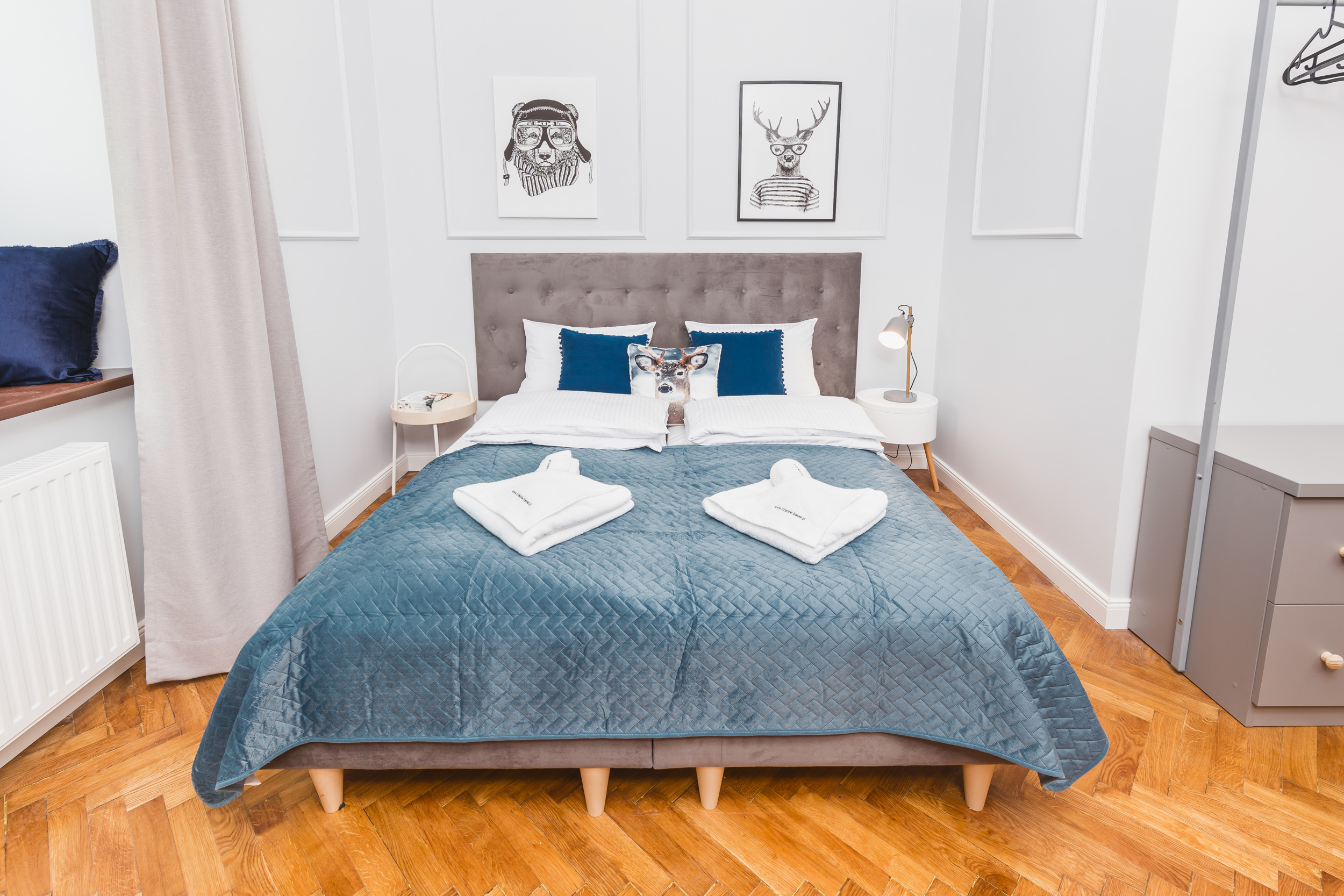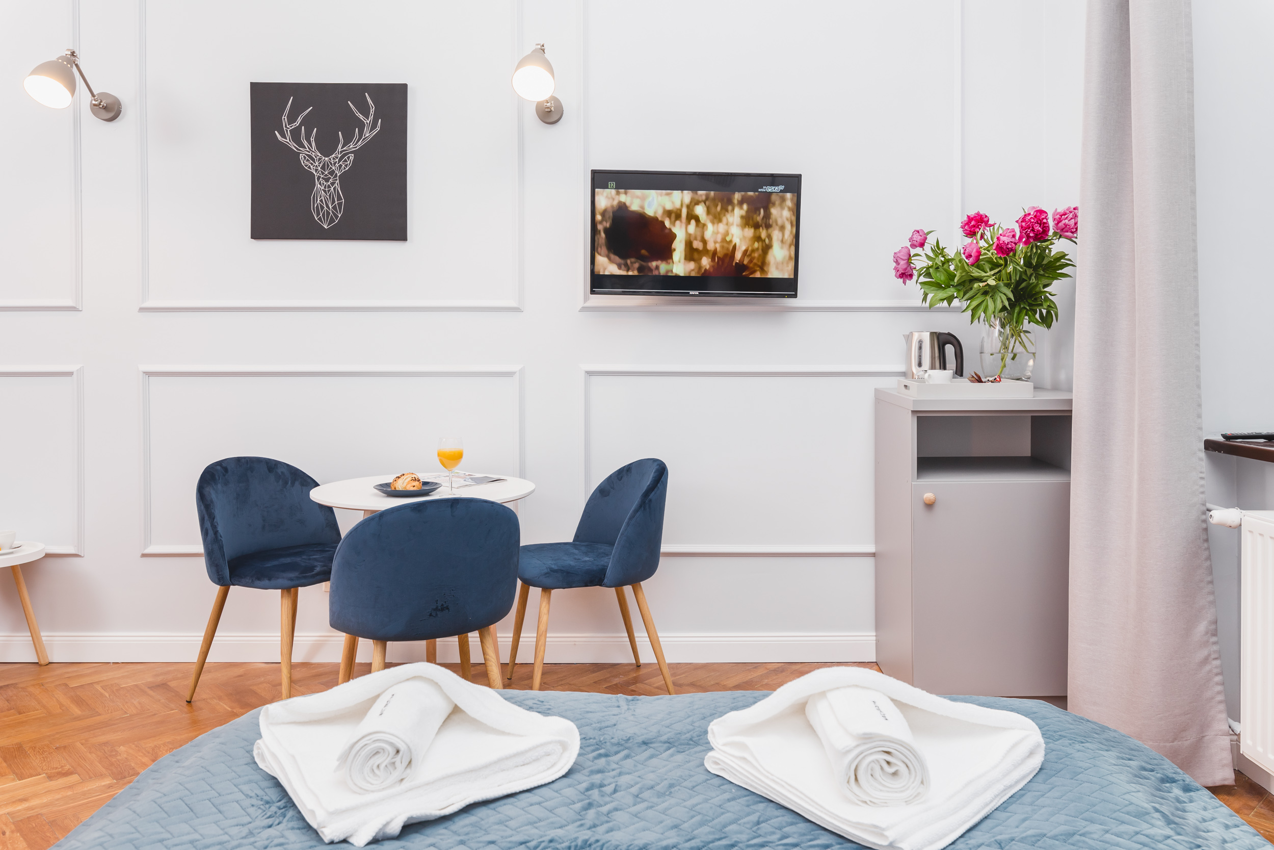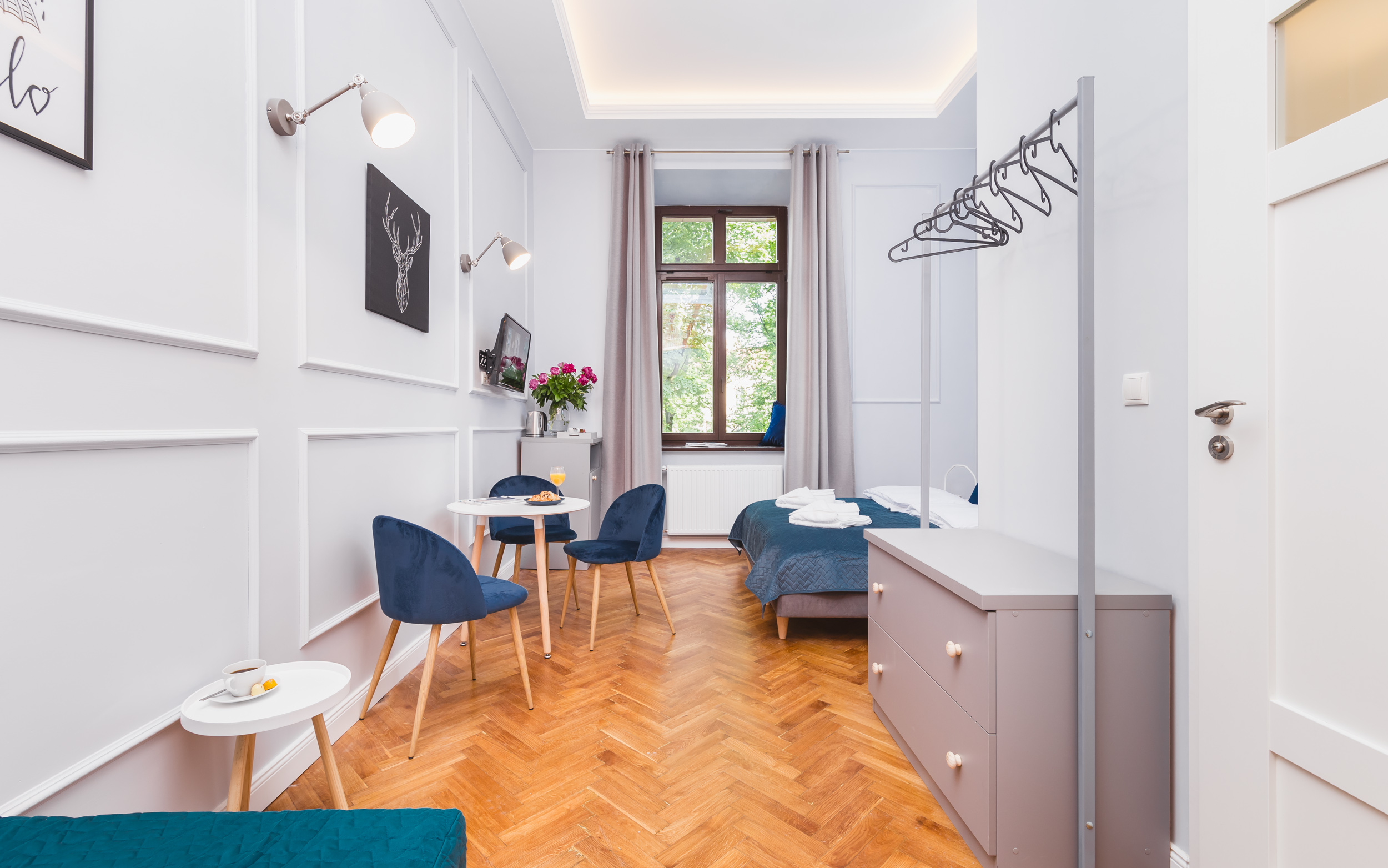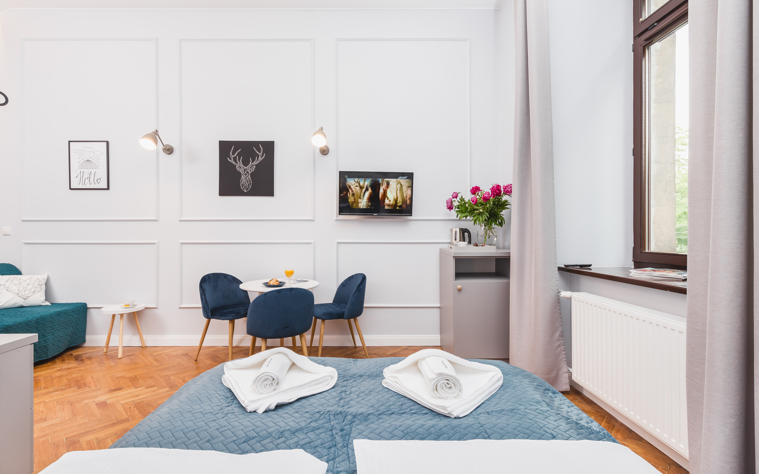 Apartament typu studio o powierzchni 22m² z widokiem na Planty. Pokój wyposażony jest w dwa pojedyncze łóżka złączone w jedno duże, pojedyncza sofa rozkładana, stolik z krzesłami, komodę, klimatyzację, TV, lodówkę, czajnik, suszarkę do włosów, pościel, ręczniki, mydło oraz prywatną łazienkę z prysznicem. Do dyspozycji gości jest aneks kuchenny do wspólnego użytku wraz z innymi pokojami, bezpłatne Wi-Fi, żelazko i deska do prasowania.