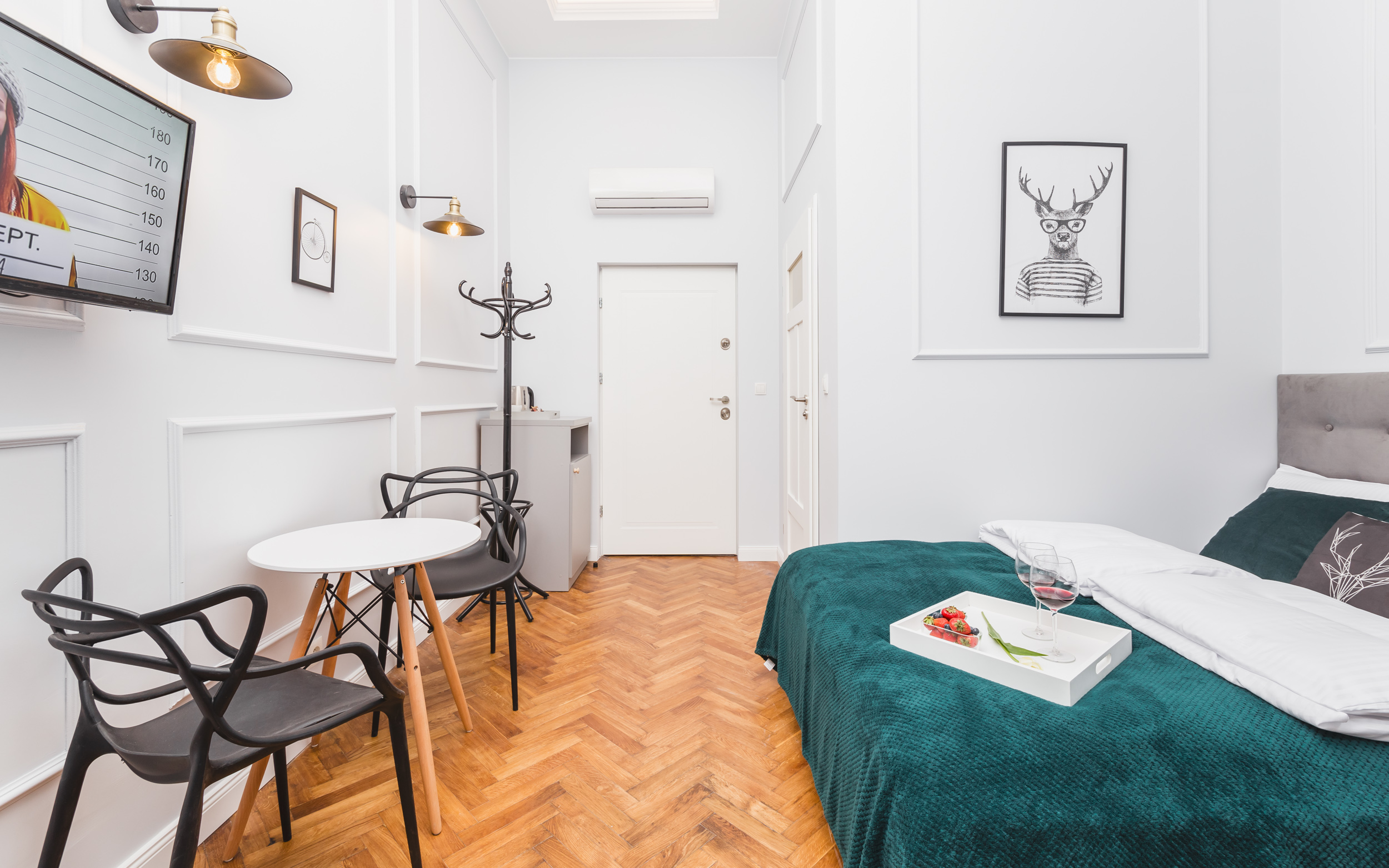 Dwuosobowy apartament typu studio o powierzchni 18m² z widokiem na dziedziniec. Cichy pokój wyposażony jest w bardzo wygodne podwójne łóżko, stolik z krzesłami, stylowy, wygodny fotel, komodę, klimatyzację, TV, lodówkę, czajnik, suszarkę do włosów, pościel, ręczniki, mydło oraz prywatną łazienkę z prysznicem. Do dyspozycji gości jest aneks kuchenny do wspólnego użytku wraz z innymi pokojami, bezpłatne Wi-Fi, żelazko i deska do prasowania.