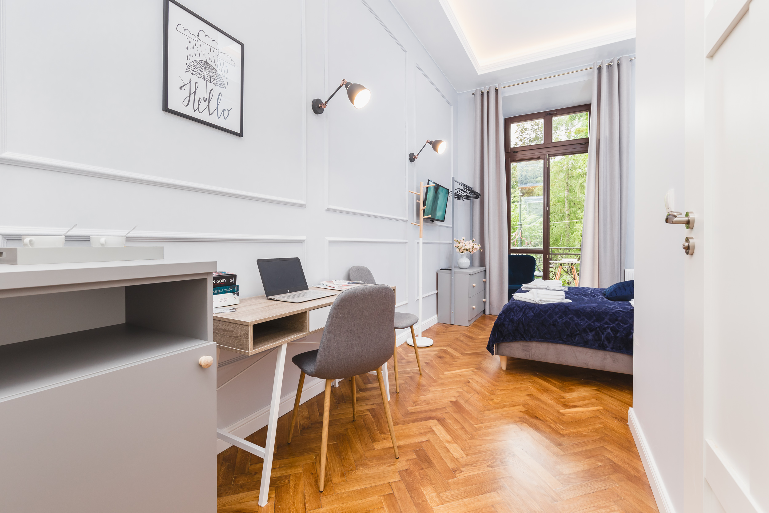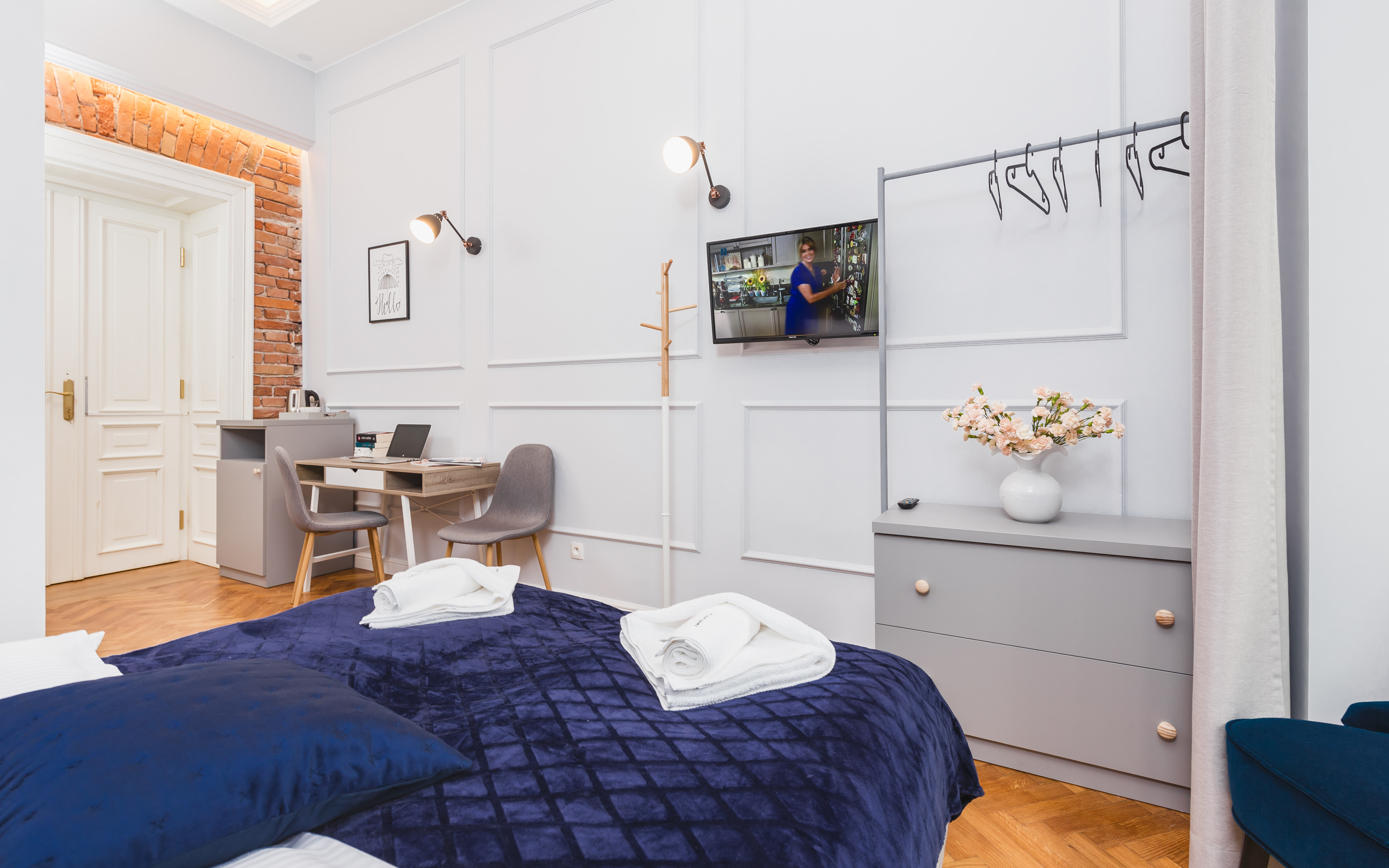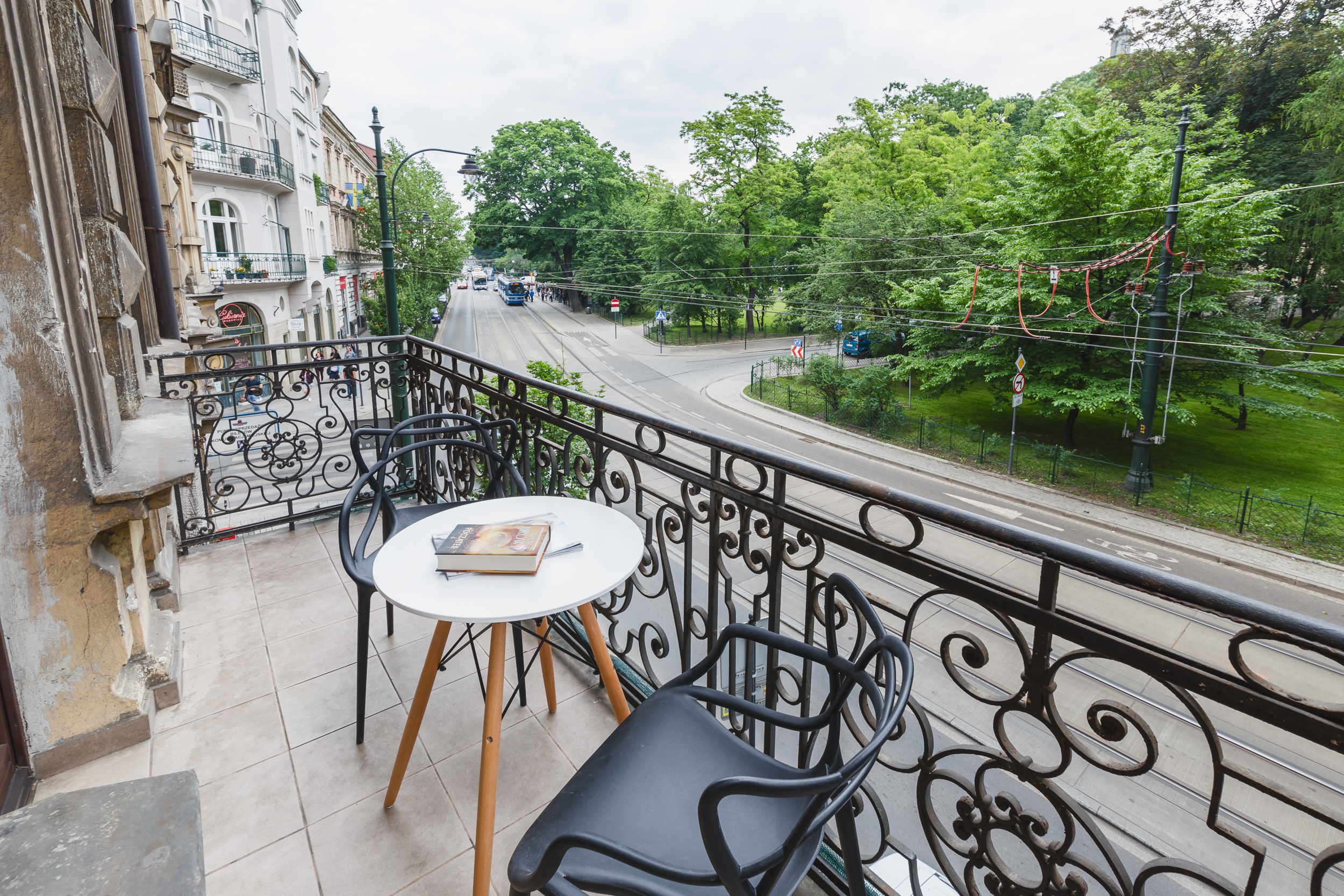 Apartament dla dwóch osób, typu studio o powierzchni 20m² z widokiem na Planty. Pokój z balkonem, wyposażony jest w dwa pojedyncze łóżka złączone w jedno duże, biurko, wygodny fotel, komodę, klimatyzację, TV, lodówkę, czajnik suszarkę do włosów, pościel, ręczniki, mydło oraz prywatną łazienkę z prysznicem. Do dyspozycji gości jest aneks kuchenny do wspólnego użytku wraz z innymi pokojami, bezpłatne Wi-Fi, żelazko i deska do prasowania.