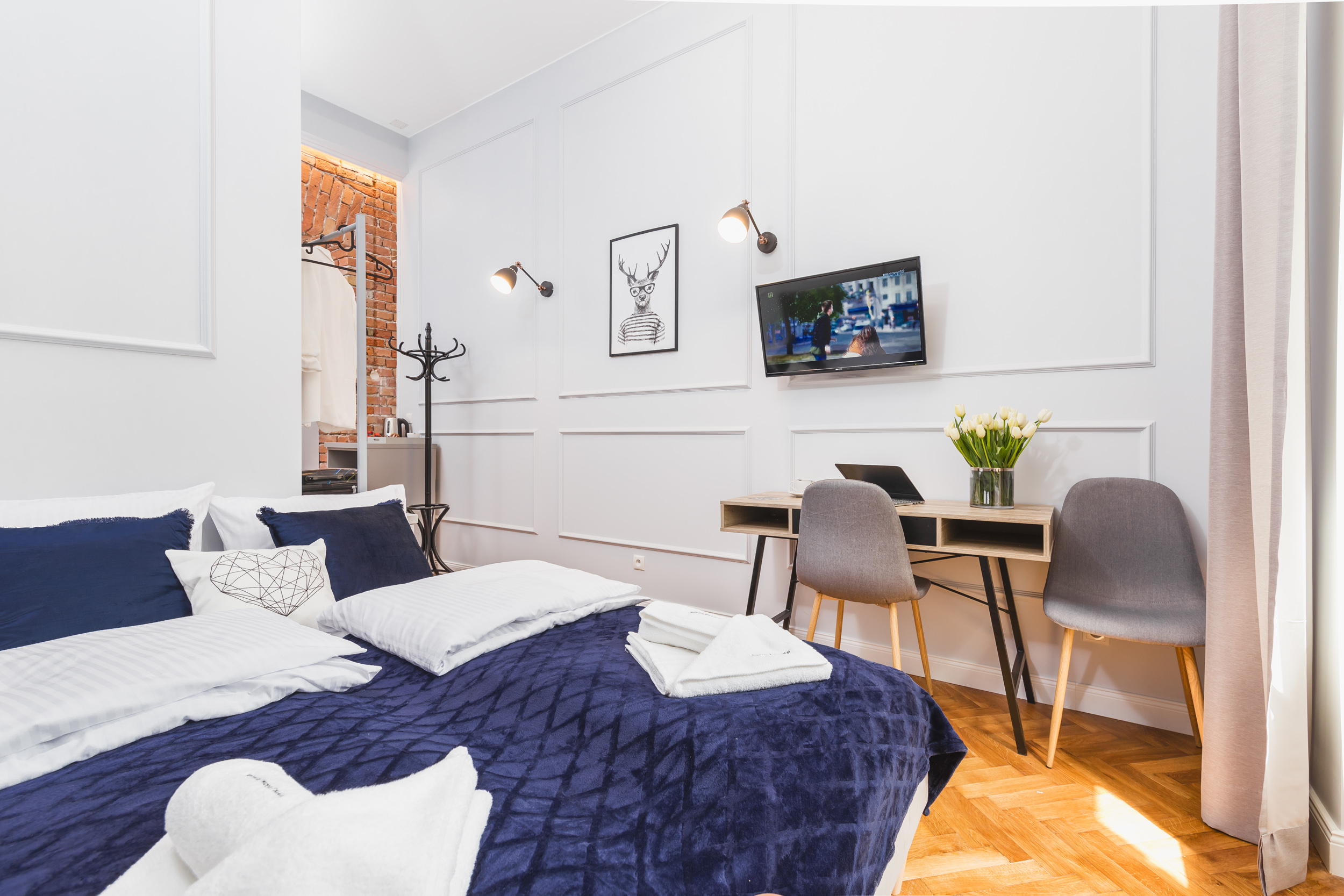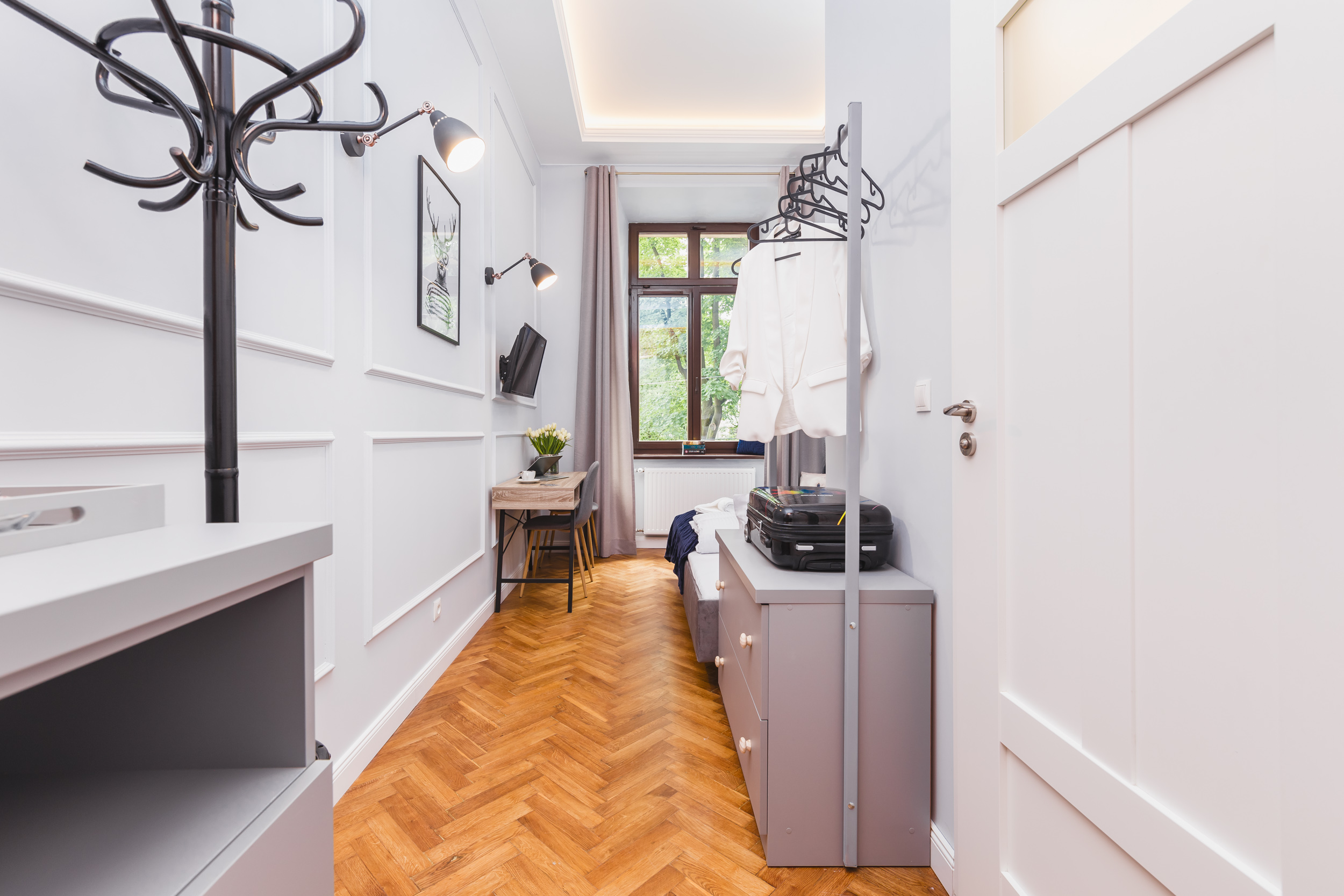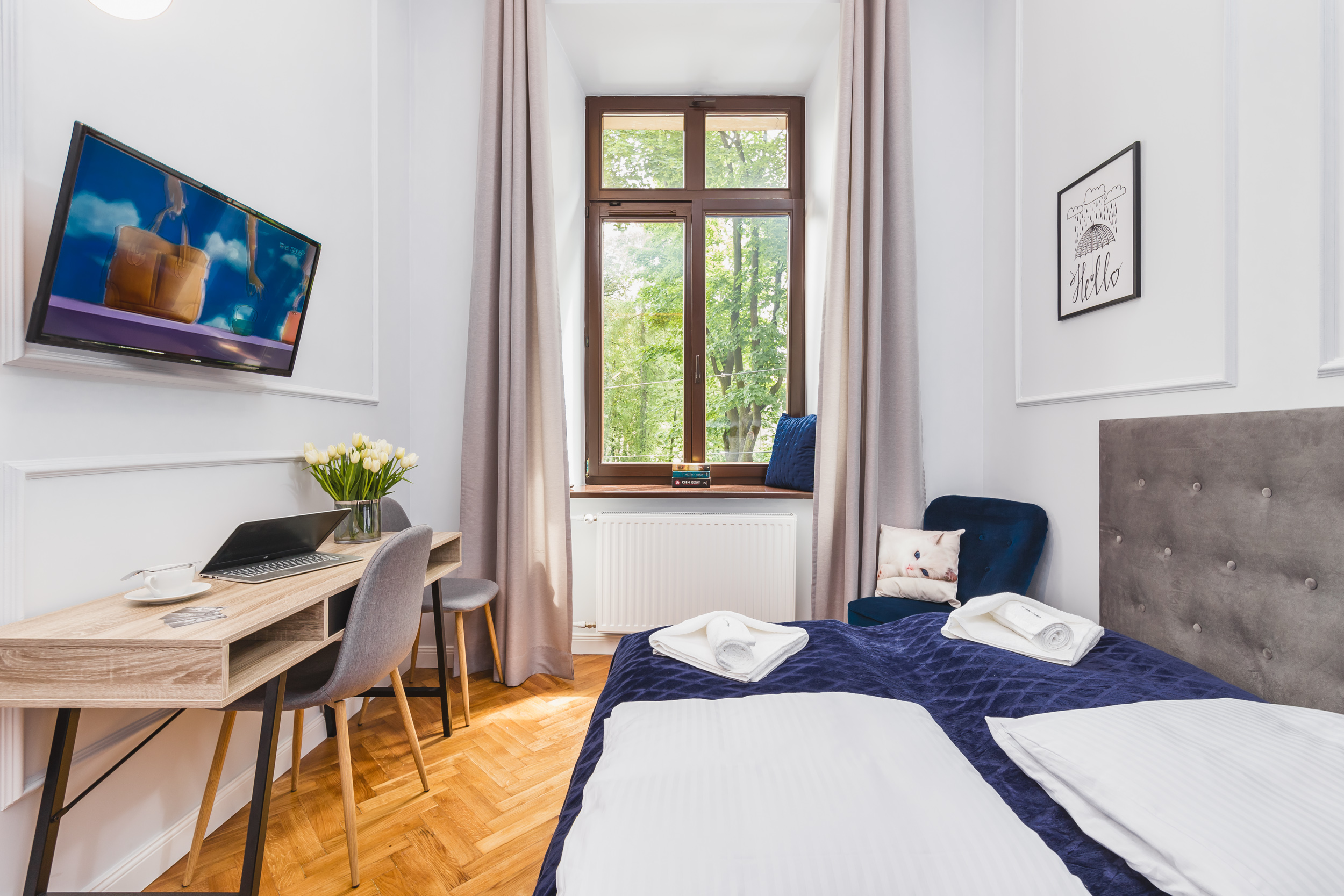 Apartament dla dwóch osób, typu studio o powierzchni 18m² z widokiem na Planty. Pokój wyposażony jest w dwa pojedyncze łóżka złączone w jedno duże, biurko, komodę, klimatyzację, TV, lodówkę, czajnik, suszarkę do włosów, pościel, ręczniki, mydło oraz prywatną łazienkę z prysznicem. Do dyspozycji gości jest aneks kuchenny do wspólnego użytku wraz z innymi pokojami, bezpłatne Wi-Fi, żelazko i deska do prasowania.